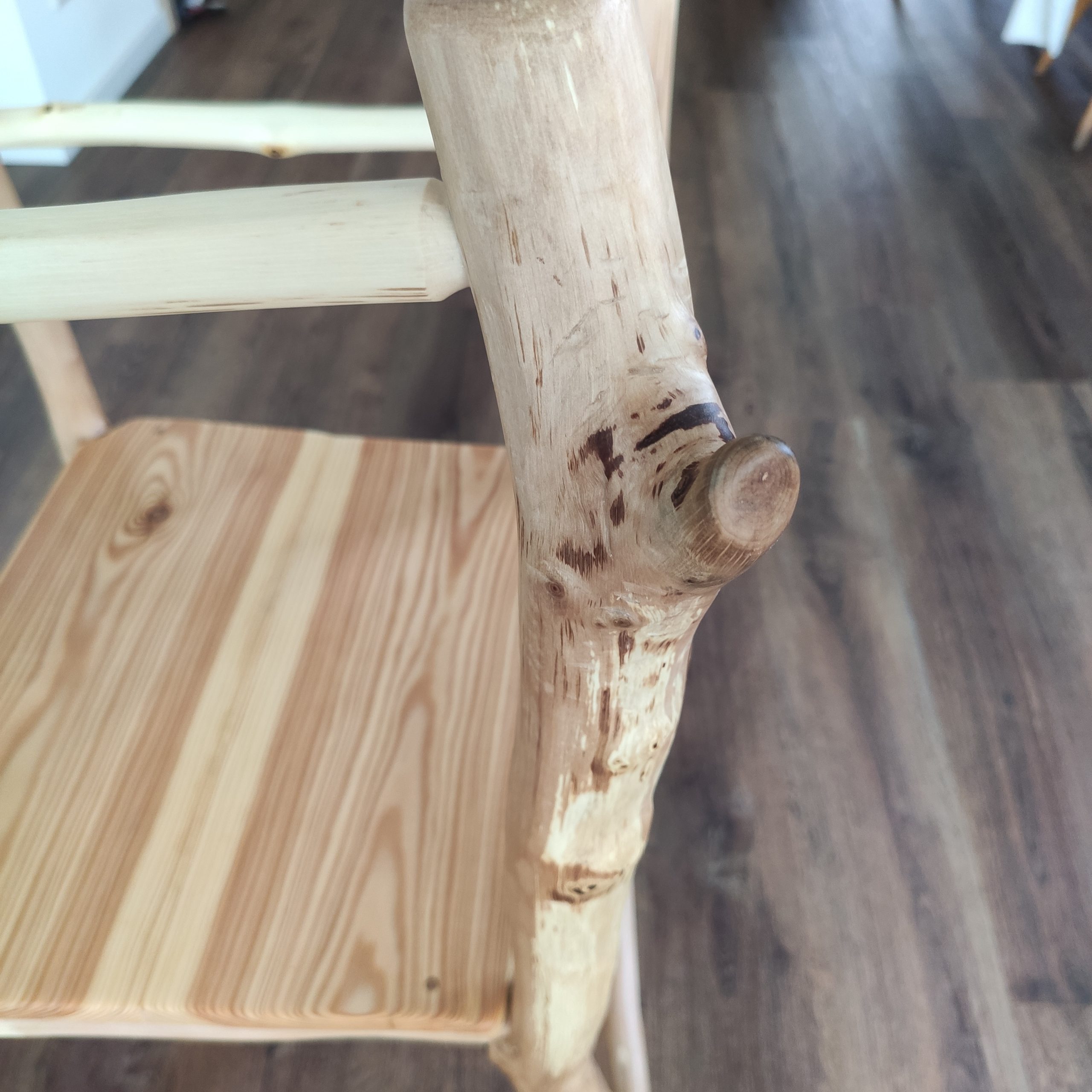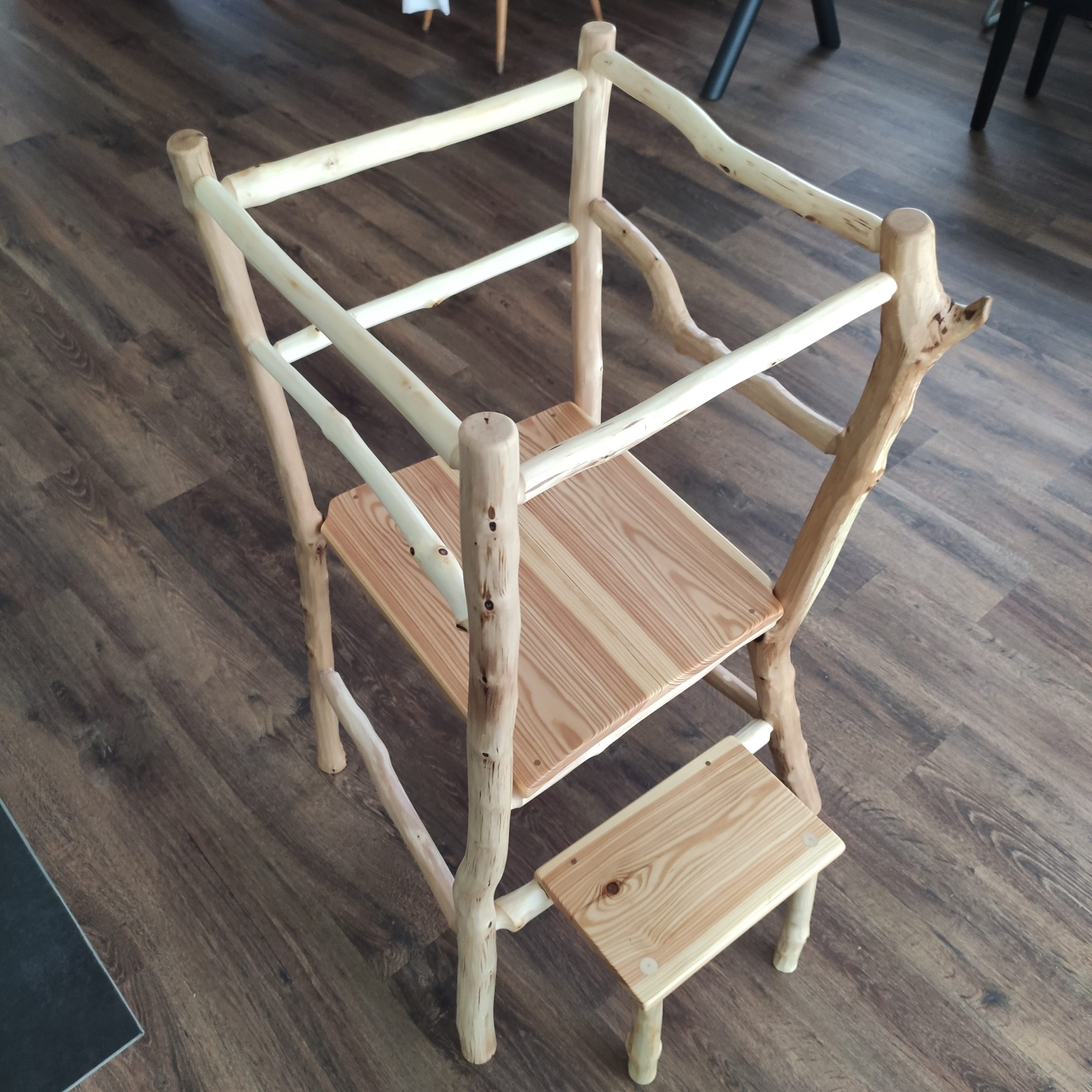Nach dem Spieletrapez das nächste Wildholz-Möbel für meine kleine Nichte. Die Haselnussäste wurden mit dem Ziehmesser entrindet und danach per Hand geschliffen (Körnungen 80 bis 320). Die Trittflächen wurden aus einem übriggebliebenen Lärchenbrett gefertigt. Zum Einsatz kamen außerdem Hufraspel, Ryoba, Zapfenschneider, Forstnerbohrer, Parallelanreisser und der für Wildholz unverzichtbare Multi-Spannstock. Zum Schluss wurde der Lernturm noch mit einer Mischung aus Bienenwachs und Weißöl behandelt.