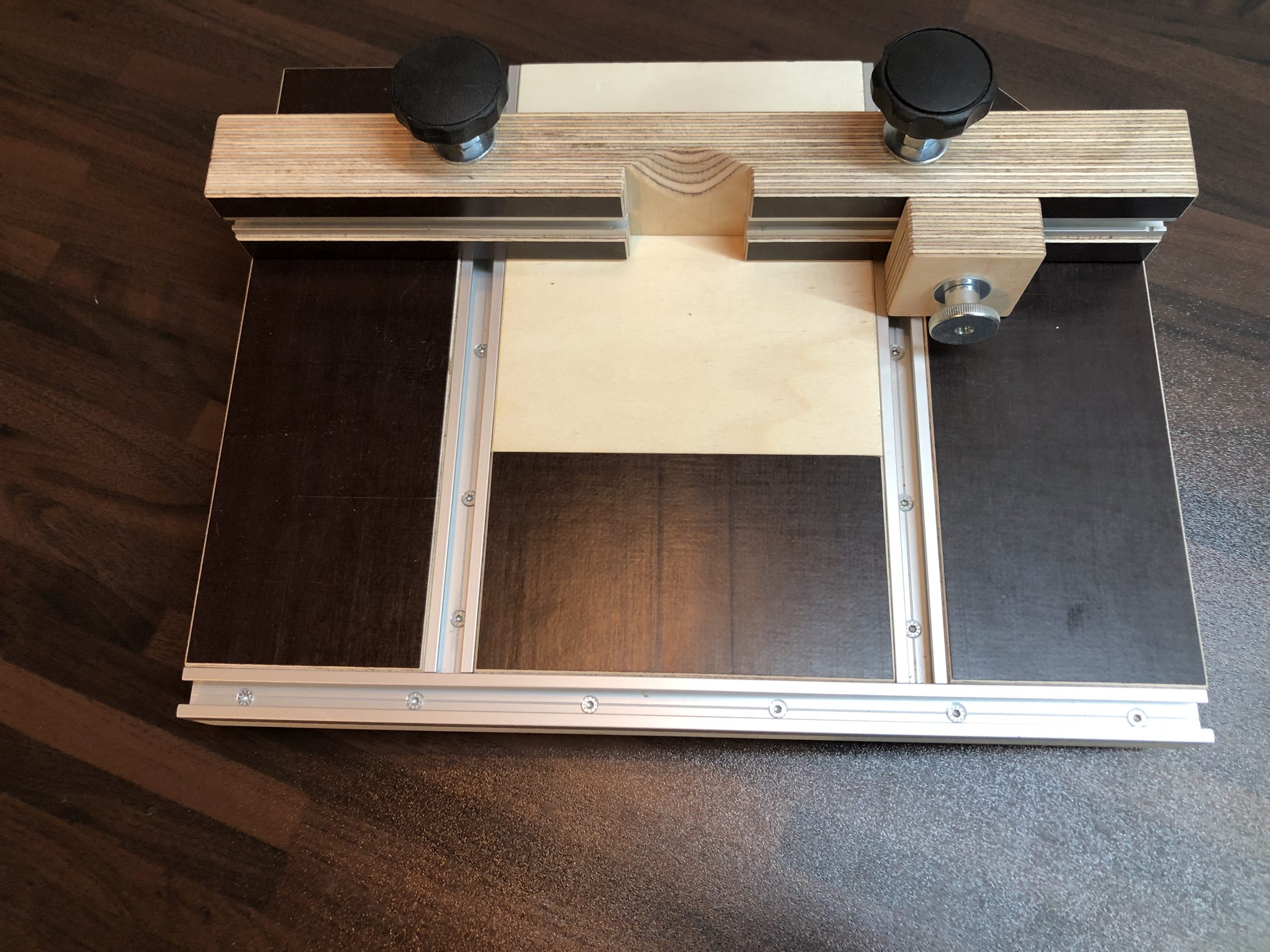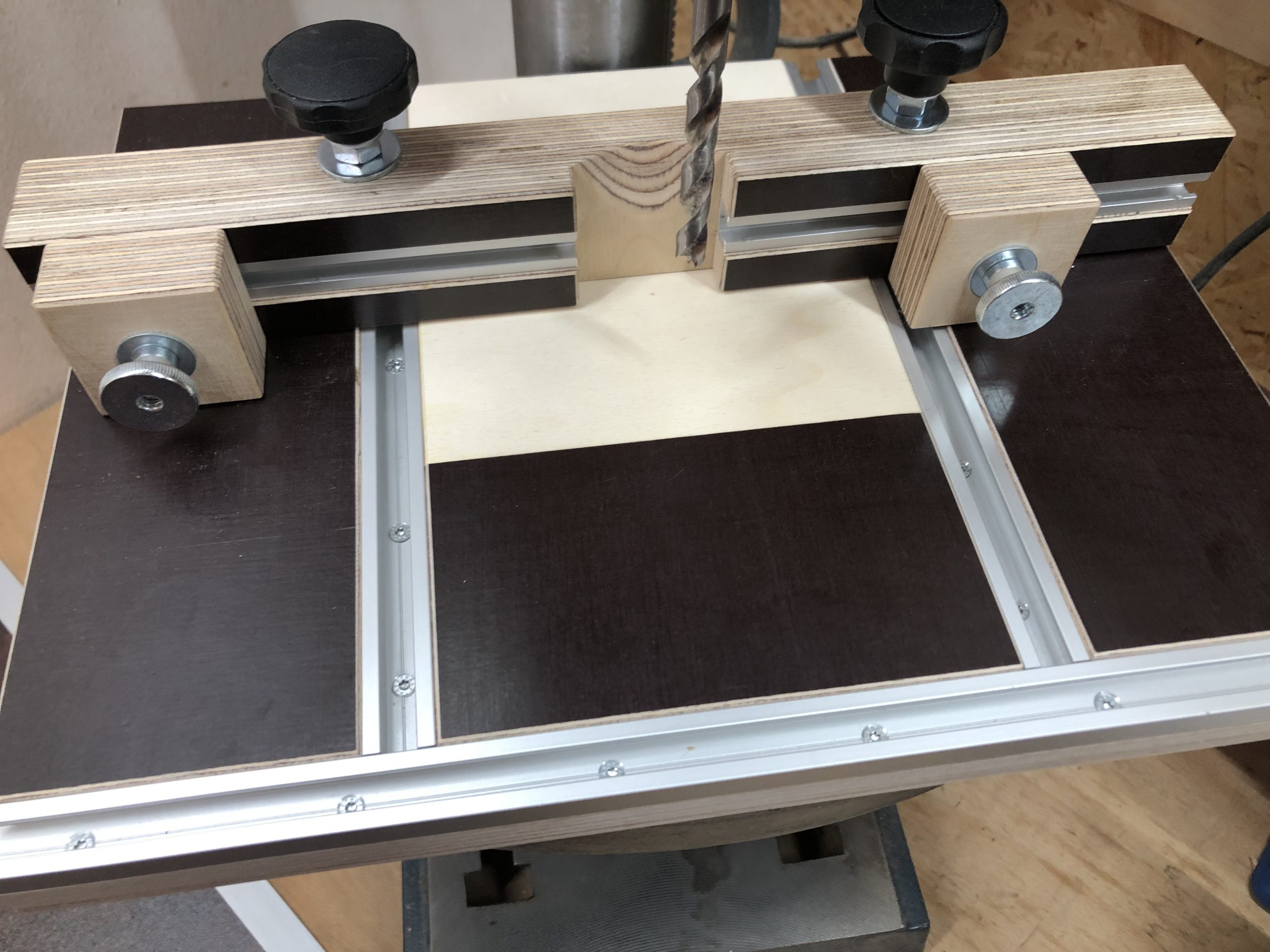 Dieser Bohrtisch für meine Standbohrmaschine hat mehrere Anschlagmöglichkeiten, die über Nutprofile verstellbar sind. Gefertigt ist er aus Birke Multiplex und Siebdruck. Der Mittelteil ist bei Verschleiß austauschbar. Verwendet wurden hauptsächlich die Festool OF 1400 EBQ-Plus und das Festool CMS-TS 55 R-Set.