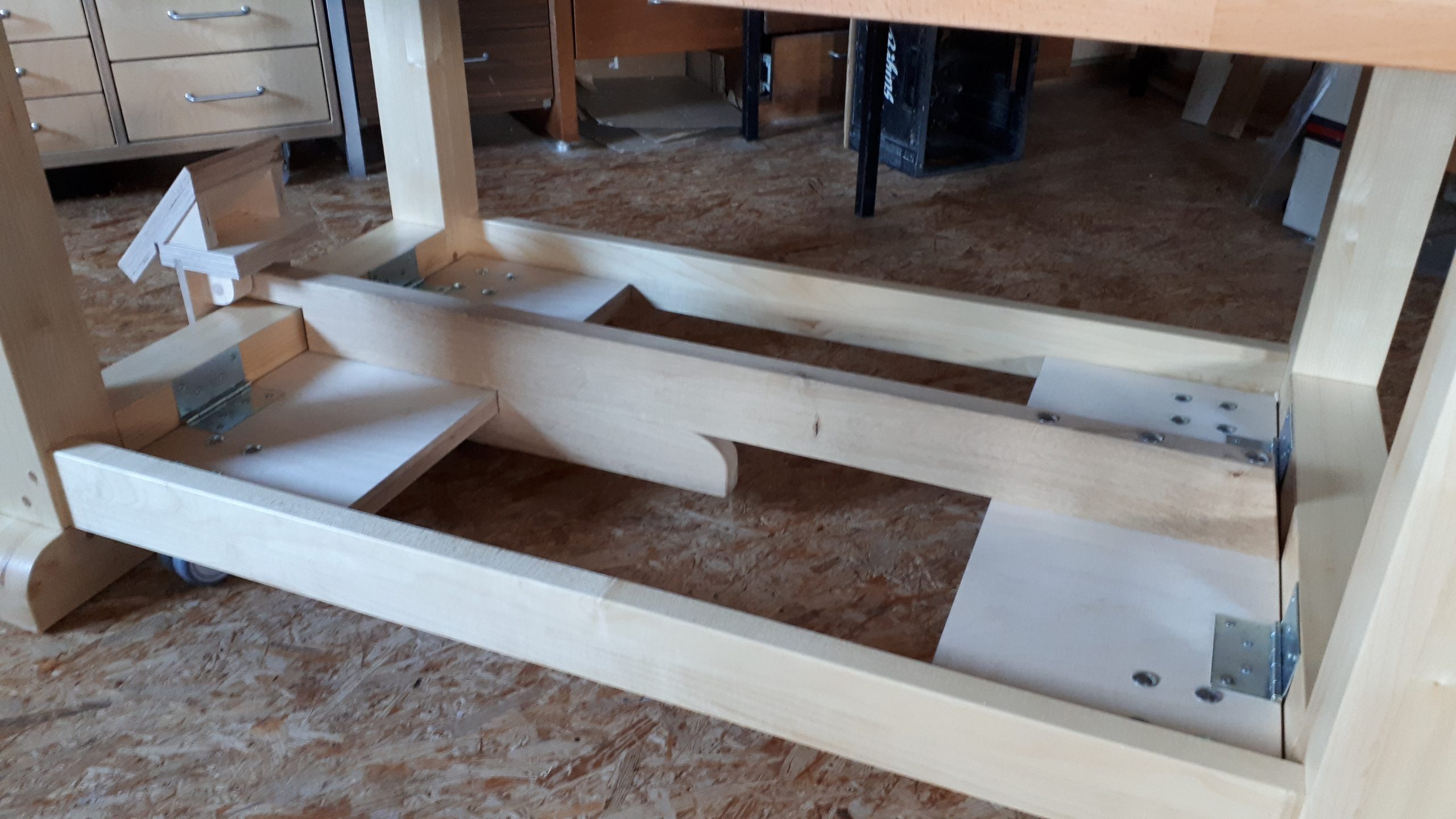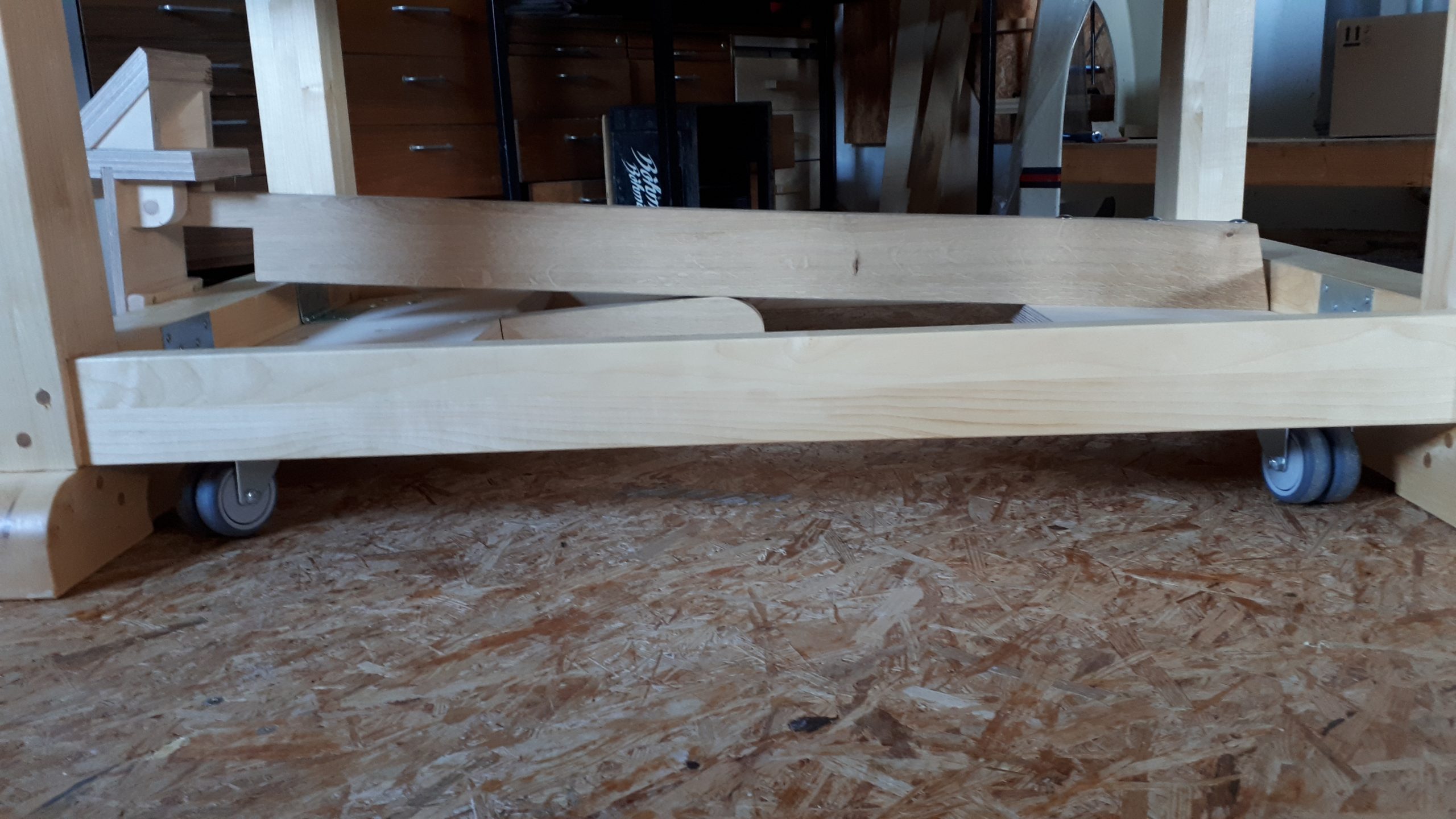 Mit diesem Fahrwerk kann die Hobelbank mit einem Gewicht von ca. 250 kg bei Bedarf mühelos angehoben und verschoben werden. Durch das Pedal mit der Rastfunktion bleibt das Fahrwerk angehoben, und die Hobelbank kann nach dem verschieben durch einfaches ausklinken wieder abgesenkt werden, und steht stabil auf dem Fußboden. Es wurden Doppellenkrollen mit einer Tragkraft von 100 kg pro Rolle verbaut. Ideale Ergänzung, wenn wenig Platz in der Werkstatt zur Verfügung steht.