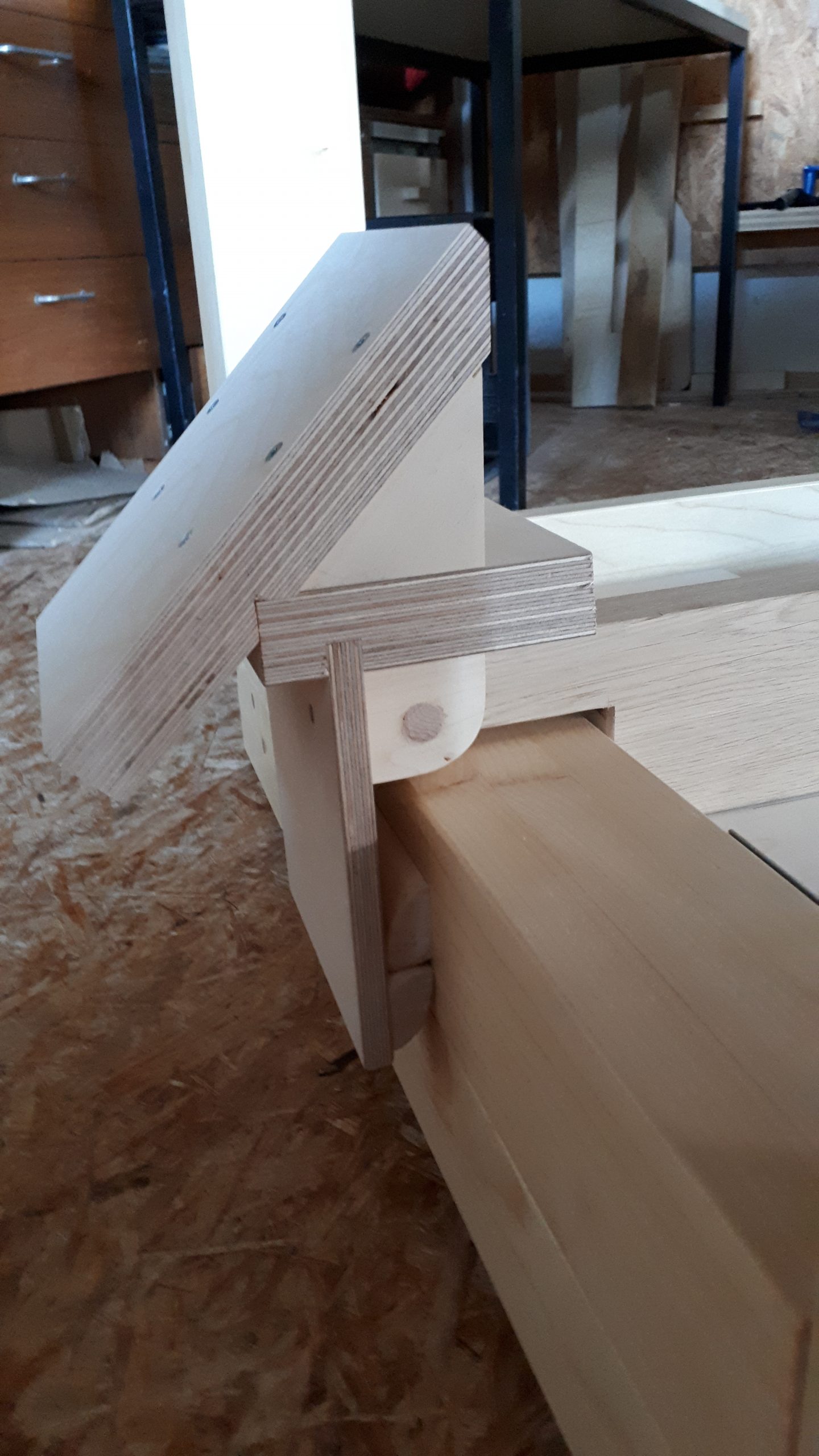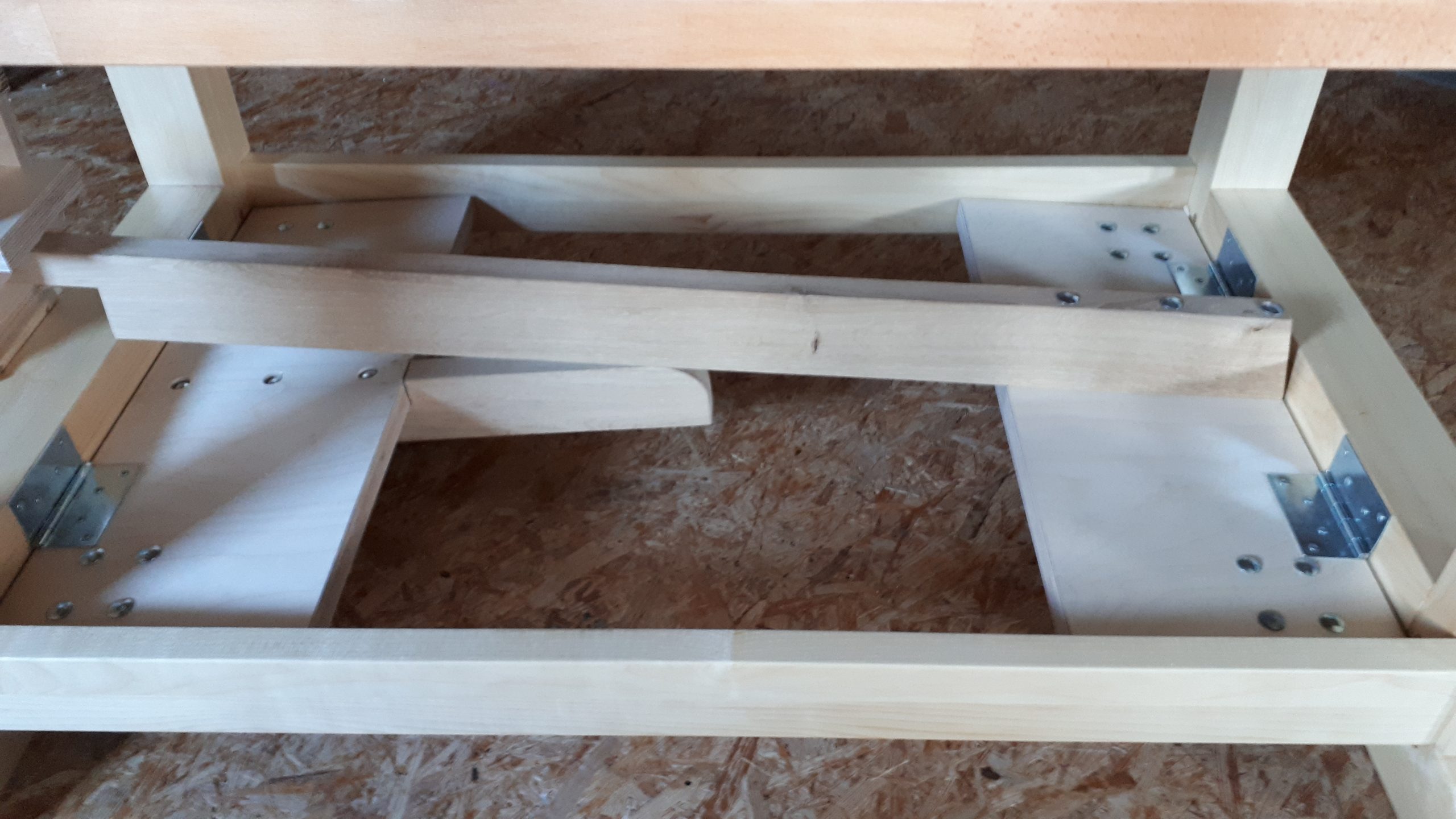 Diese Hobelbank wurde aus Buche Leimholz und Ahorn gebaut. Die Platte und die Schürzen sind aus 45mm Buche Leimholz hergestellt. Das Untergestell ist aus Ahorn gefertigt. Die Hobelbank hat eine Länge von 200 cm, eine Breite von 93 cm und eine Höhe von 84 cm. An der Hobelbank wurde die Doppelspindel – Vorderzange, schwere Gußausführung, und die Veritas Doppelspindelvorderzange verbaut. In der Platte sind noch Bohrungen für Niederhalter und Bankhaken eingelassen. Die Endbehandlung erfolgte mit Hartwachsöl.
