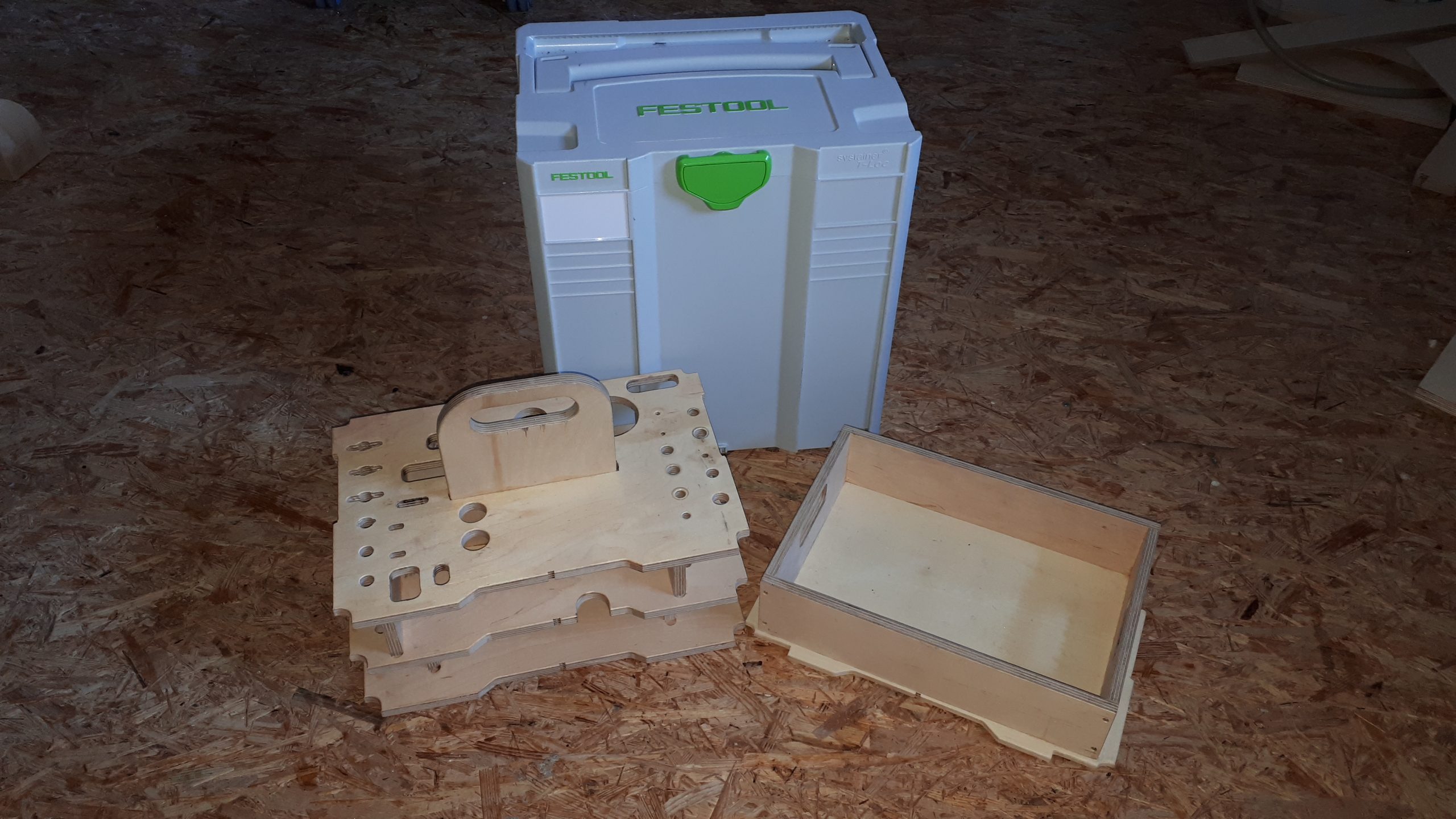 Dieser Rolli für Systainer ist aus Siebdruckplatten hergestellt. auf der Grundplatte sind Befestigungsklötzchen und ein Drehriegel angebracht. Damit kann der unterste Systainer befestigt werden. Die restlichen Systainer werden dann wie üblich miteinander verbunden. Es können je nach Größe bis zu sechs Systainer aufgesetzt werden. Durch das große Hinterrad ist es ach möglich über Treppen zu fahren. Die Grundplatte kann bei Bedarf platzsparend hochgeklappt werden.