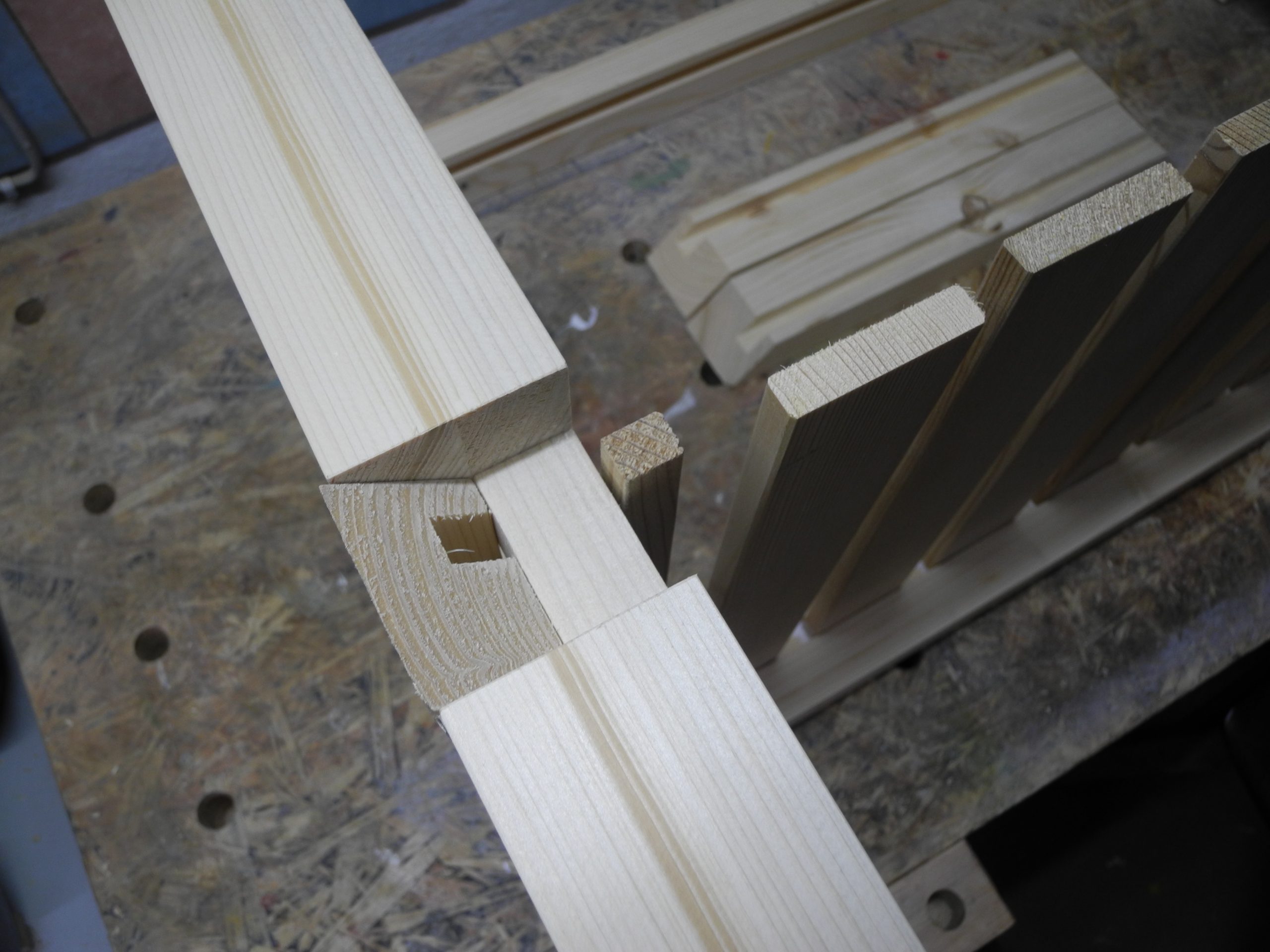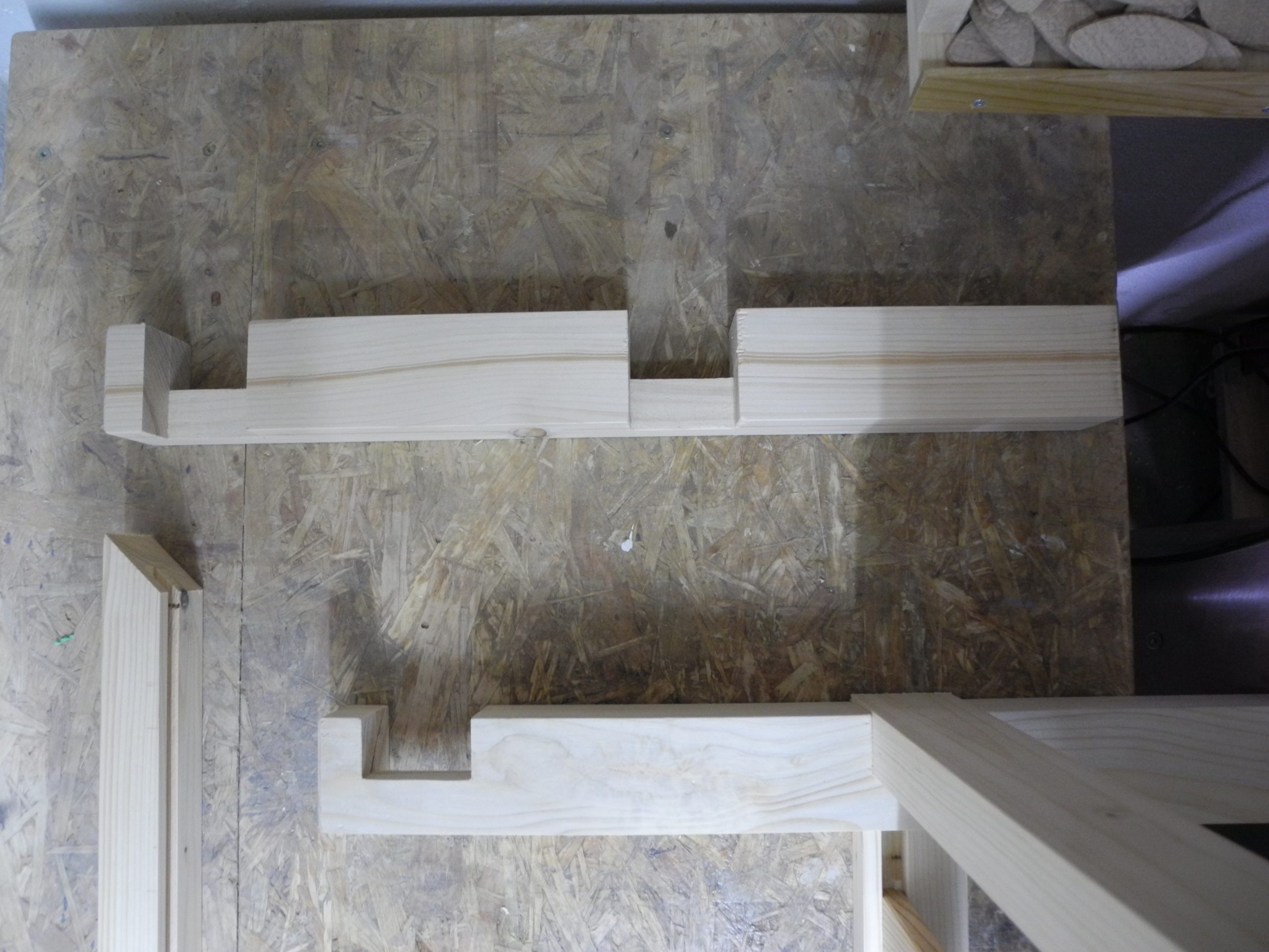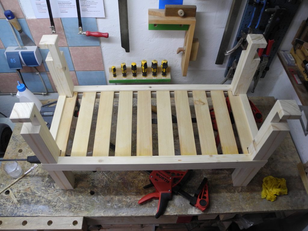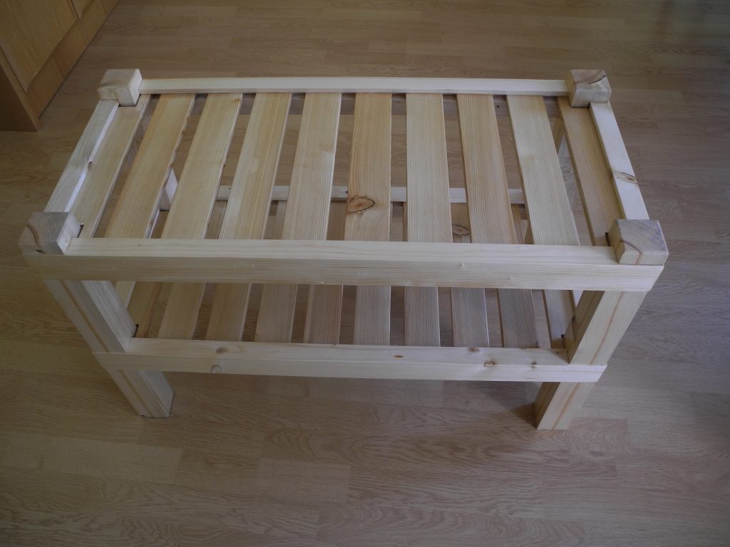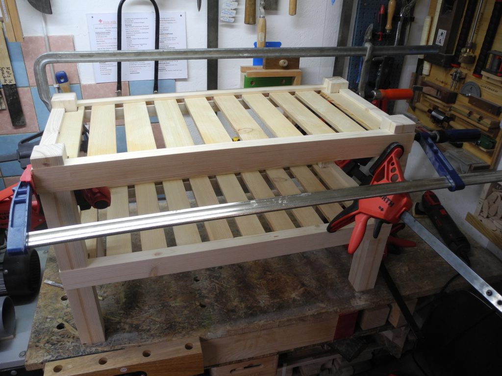 Dieses Schuhregal entstand aus Balkenabschnitten, welche eigentlich zu Brennholz werden sollten. Zunächst entfernte ich alle Metallteile, sägte aus den Balken Rahmenhölzer auf und hobelte diese mit dem Dickenhobel. Die Bretter, auf denen die Schuhe stehen sind aufgetrennte Lärche-Kanthölzer. Nun konnten die Hölzer auf der Tischkreissäge abgelängt und auf der Tischfräse eingenutet werden. Anschließend habe ich an alle Holzteile mit dem Kantenhobel eine leichte Fase gehobelt und die Teile mit wasserfesten Leim zusammengefügt. Das Holz ist zum Schutz vor Feuchtigkeit, Streusalz u. a. mehrfach mit farbloser Holzschutzlasur eingelassen.