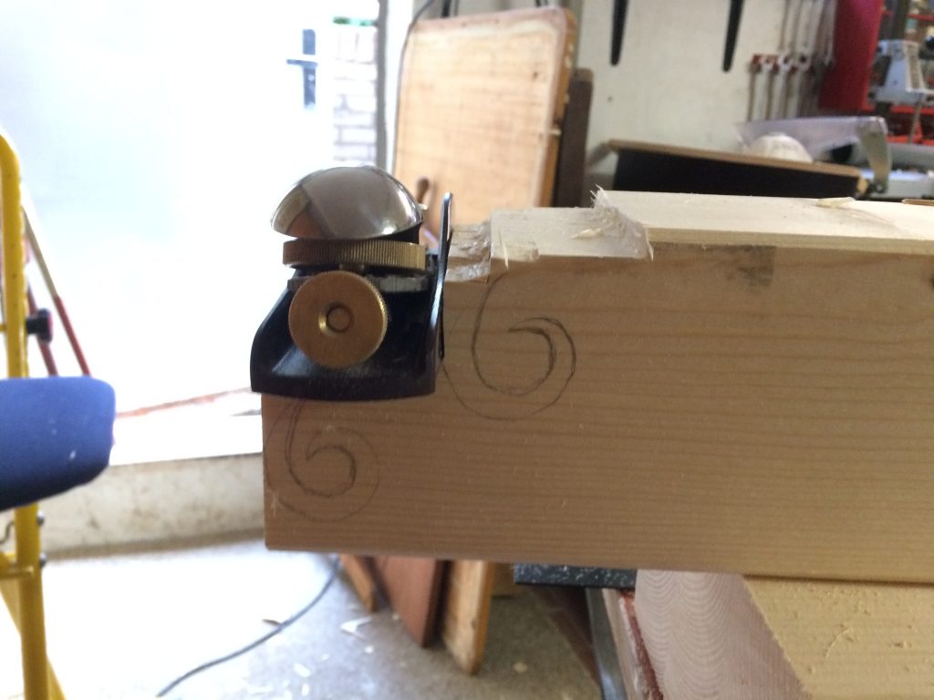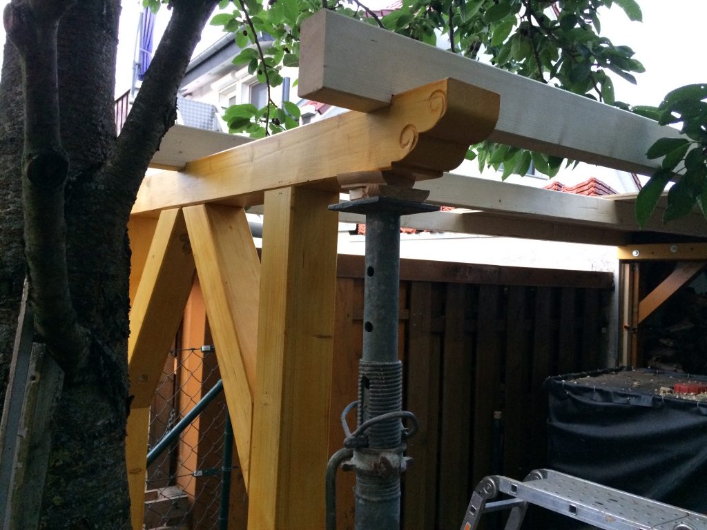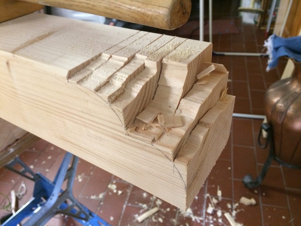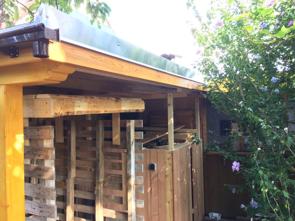 Wir brauchten einen neuen Unterstand für unser Brennholz und für mehr Stauraum. Gefertigt wurde alles per Hand, die Verbindungen sind teilweise gezapft und geschraubt. Die Balken bekamen noch ein paar Verzierungen. Diese habe ich zuerst mit einer Japansäge eingesägt, grob ausgestemmt und dann mit dem DICTUM Einhand-Simshobel nachgearbeitet. Die Verzierungen wurden mit einem Hohleisen ausgestemmt.
