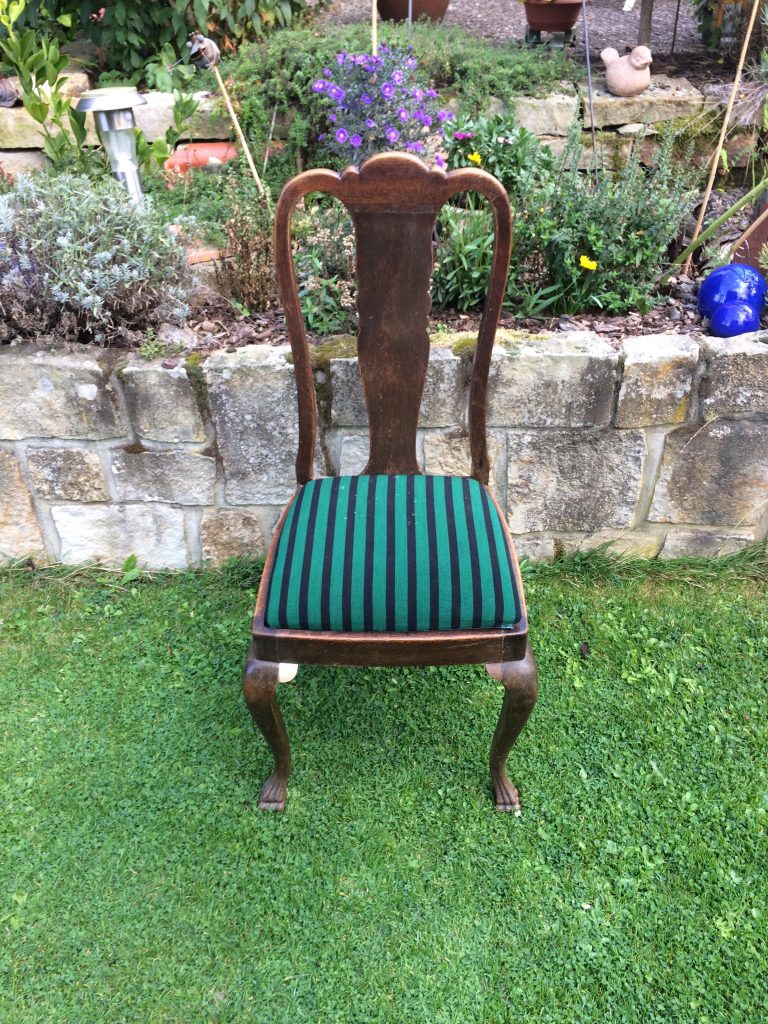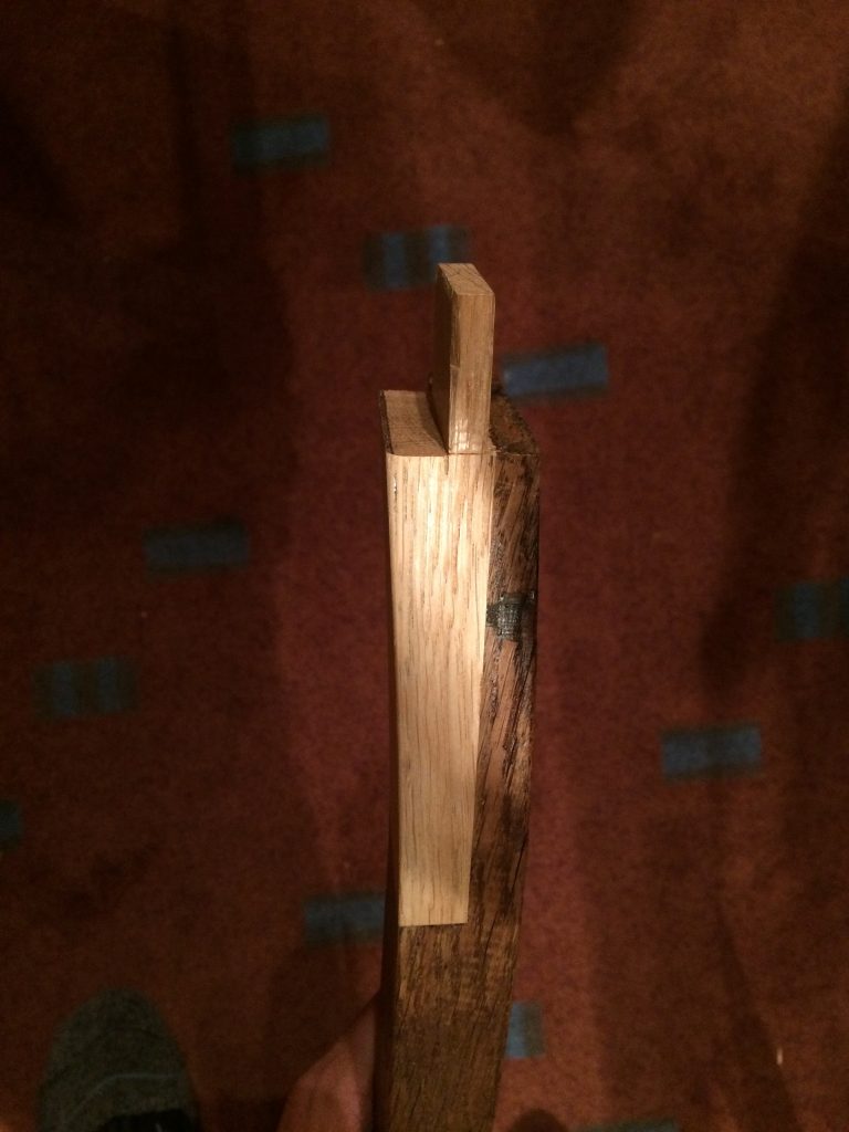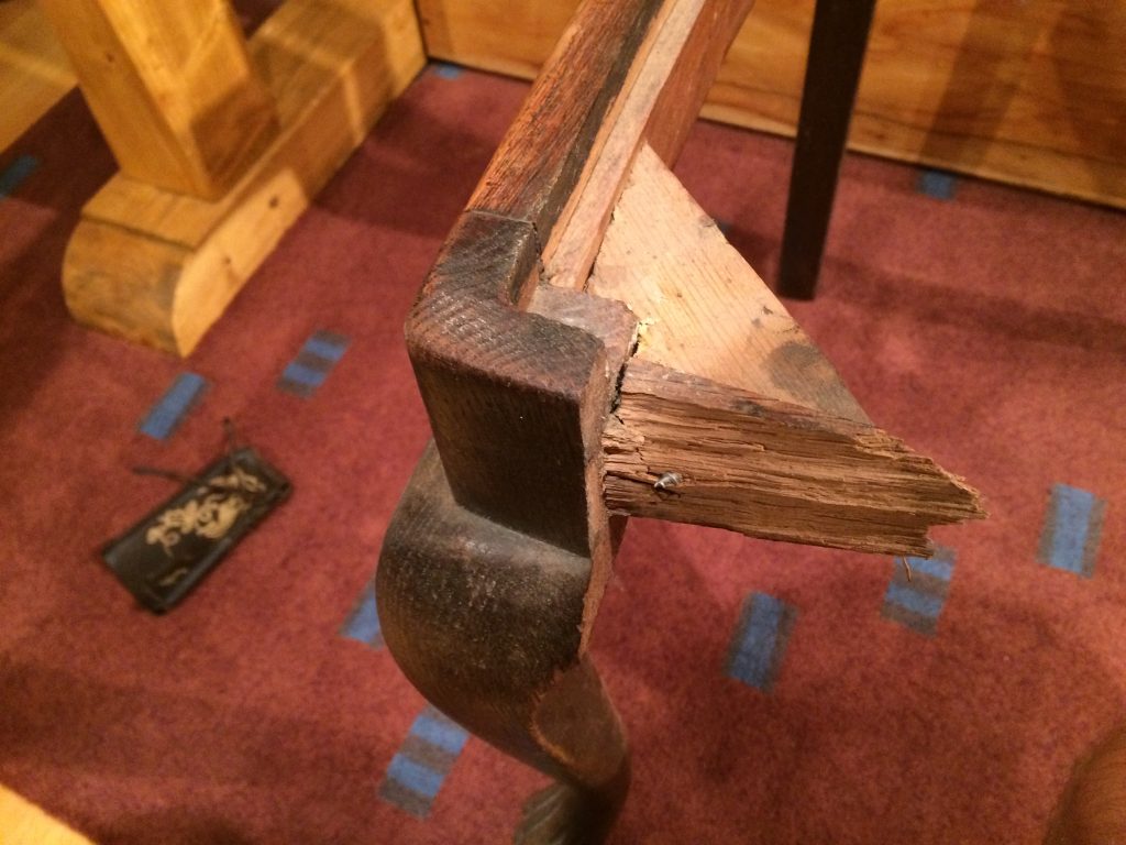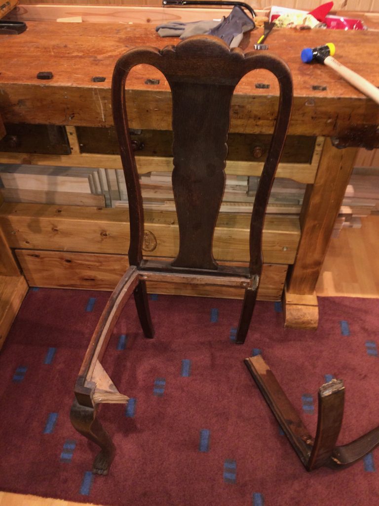 Der in mehrere Teile zerbrochene Stuhl wurde komplett zerlegt, bzw. entleimt. Die gebrochenen Stellen wurden ersetzt oder neu verleimt. Jede Verbindung wurde mit Fischleim neu verleimt. Der kaputte Zapfen wurde durch eines neues Stück Holz passgenau ersetzt. Ein fehlendes Zierelement wurde aus einem passenden Stück Eiche von mir nachgefertigt. Die Reparaturen sollten ruhig sichtbar sein, daher erfolgte keine Anpassung der Farbe und Oberfläche.