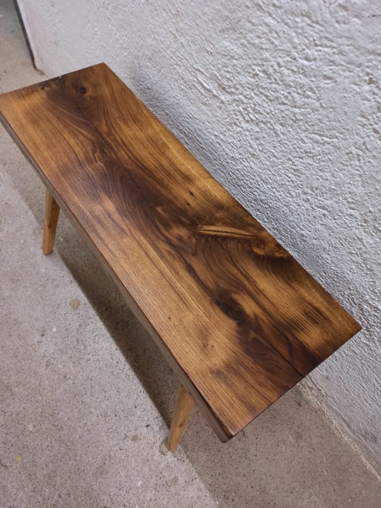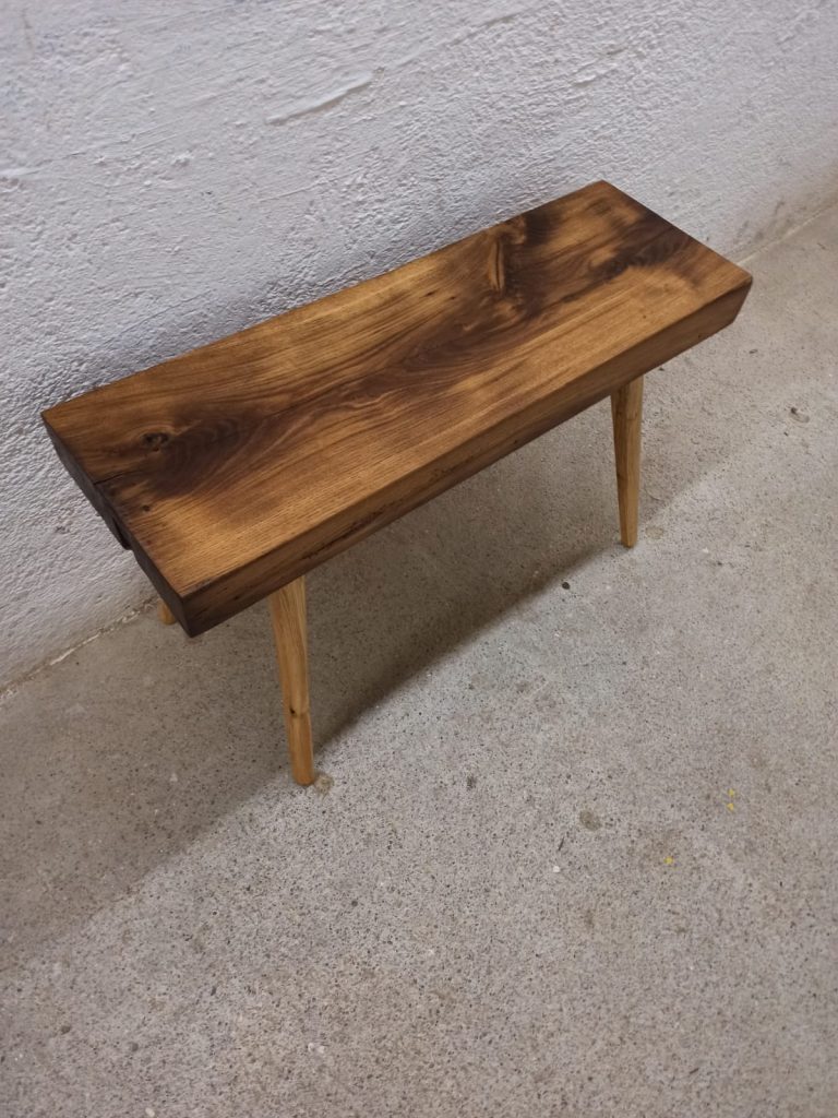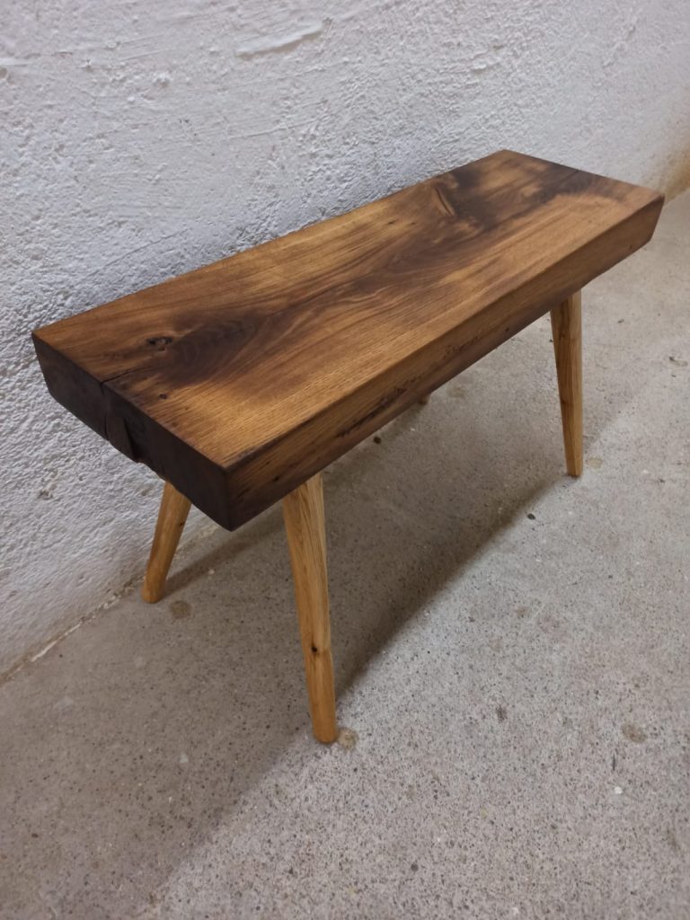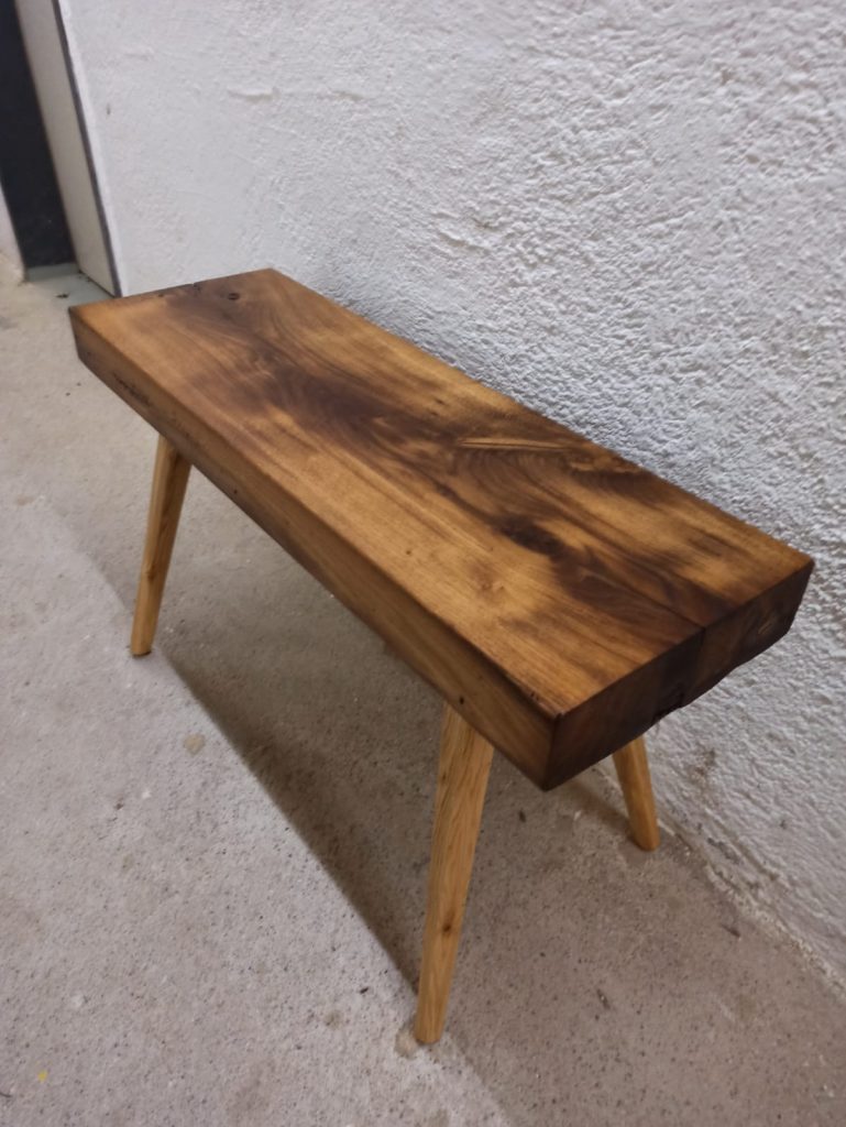 Wiederverwertet wurde ein Schreibtisch aus 30 Jahre alter Eiche. Durch den Bau eines neuen größeren Schreibtisch wurde die Platte überfällig. Das Filetstück dieser Platte, die Schwalbenschwänze, die aus reiner Zier geschaffen und zusätzlich noch die Ersten,die je gefertigt wurden, wurde auserkoren die Tischplatte des neuen Beistelltisches zu werden. Material: Eiche und Esche, geölt mit Leinölfirnis. Die Oberfläche wurde mit einem Dictum Nr. 5 und einem Veritas Flachwinkelputzhobel bearbeitet.