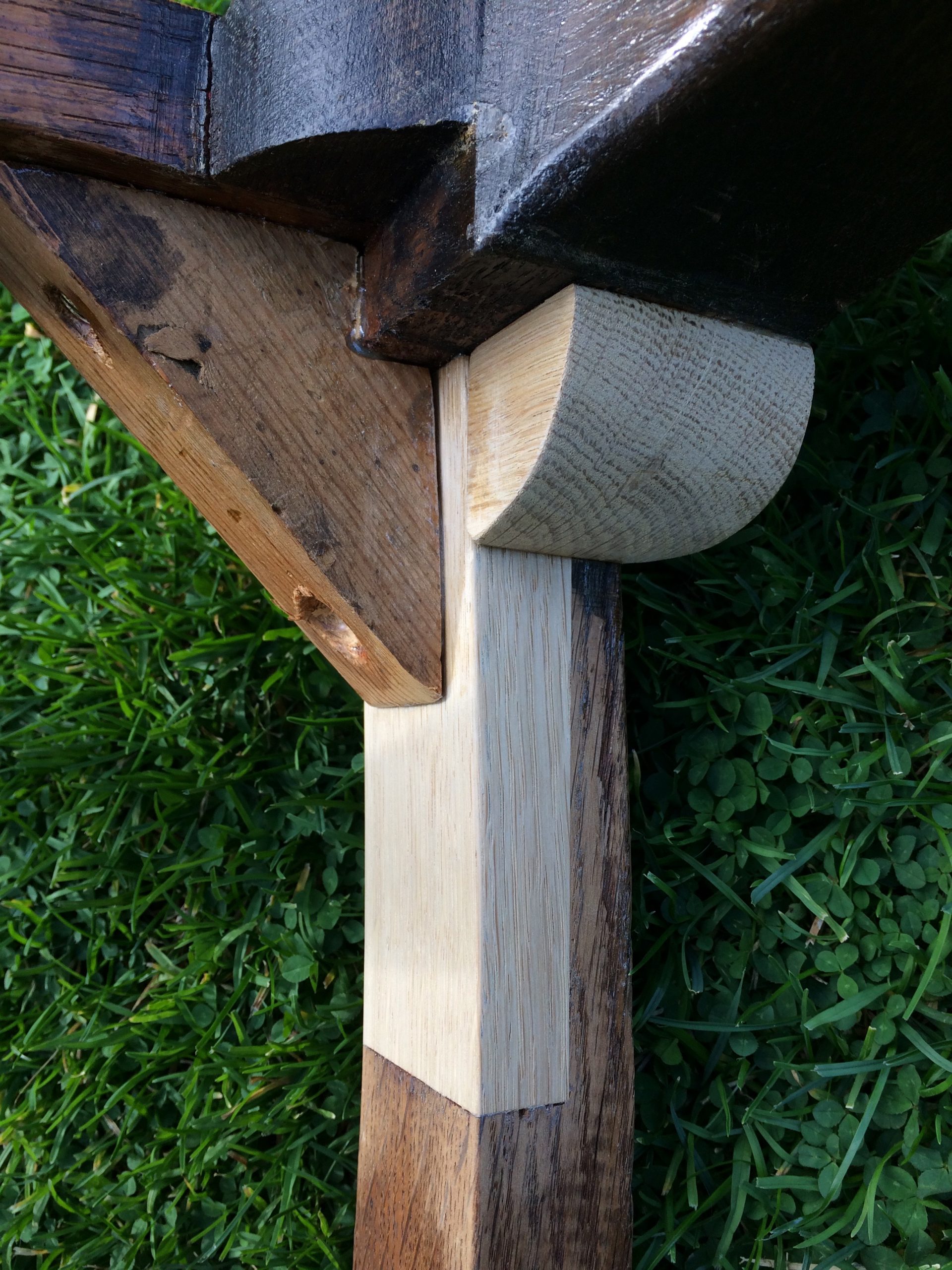 Der in mehrere Teile zerbrochene Stuhl wurde komplett zerlegt, bzw. entleimt. Die gebrochenen Stellen wurden ersetzt oder neu verleimt. Jede Verbindung wurde mit Fischleim neu verleimt. Der kaputte Zapfen wurde durch eines neues Stück Holz passgenau ersetzt. Ein fehlendes Zierelement wurde aus einem passenden Stück Eiche von mir nachgefertigt. Die Reparaturen sollten ruhig sichtbar sein, daher erfolgte keine Anpassung der Farbe und Oberfläche.