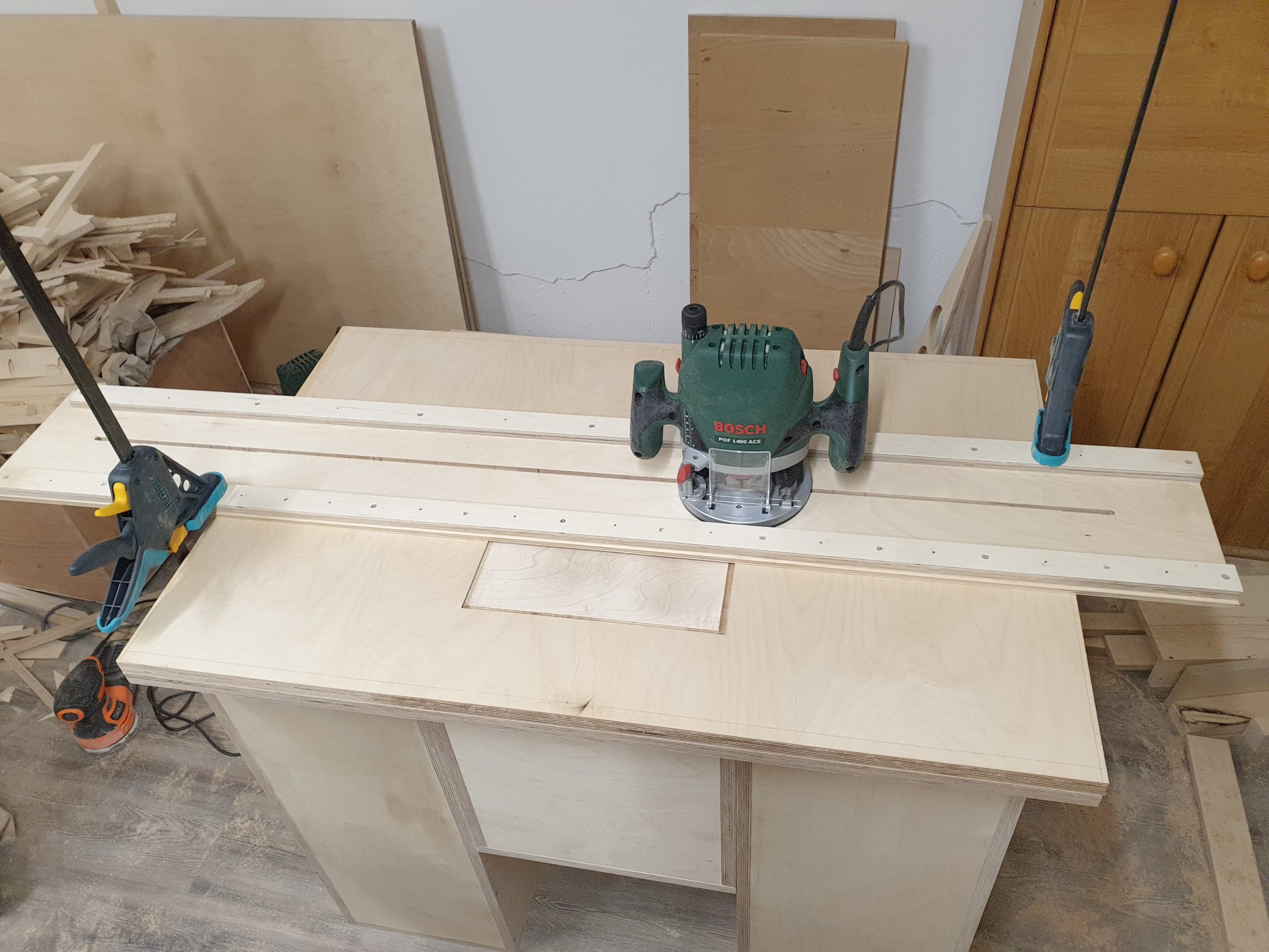 Die 1,50m lange Führungsschiene für die Oberfräse besteht aus Birke-Multiplex (9mm sowie 15mm). Eingefräst wurde mit einem 8mm Nutfräser. Die dadurch entstandene Fräskante dient zum genauen ausrichten auf dem Werkstück.