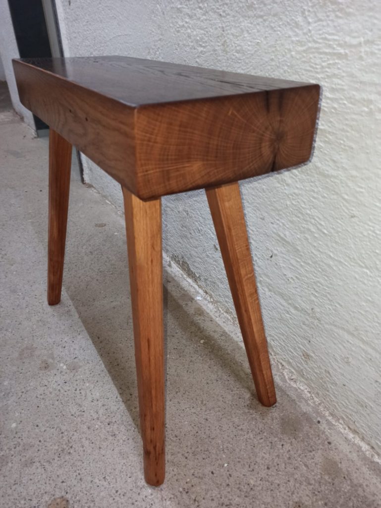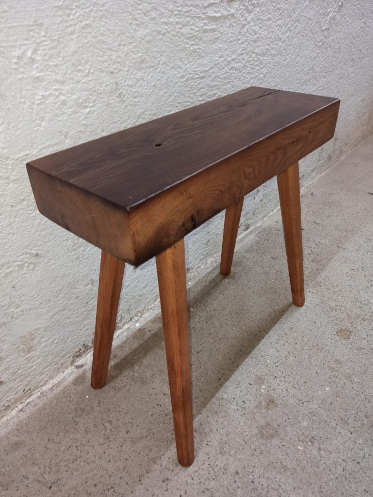 Der neue Behandlungstisch sollte als Ersatz für eine zerlegbare Version stets das Gefühl von Sicherheit geben. Die gewählten Querschnitte wurden entsprechend großzügig gewählt. Das Gestell wurde in der Art einer klassischen Tischkonstruktion in massiver Esche ausgeführt. Die Zapfen wurden als Stollenzinken ausgebildet. Die Tischplatte ist eine einfach BFU-Platte, deren Ecken und Kanten abgerundet wurden. Sie wurde mit einer Schaumgummimatte belegt und mit Kunstleder bezogen.