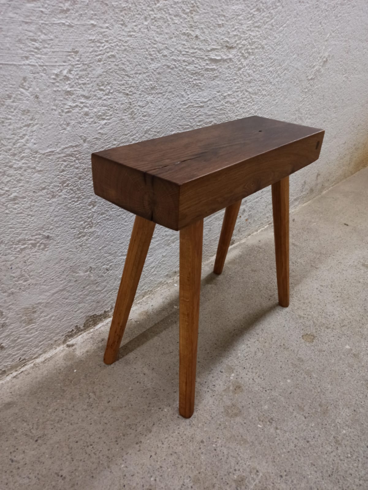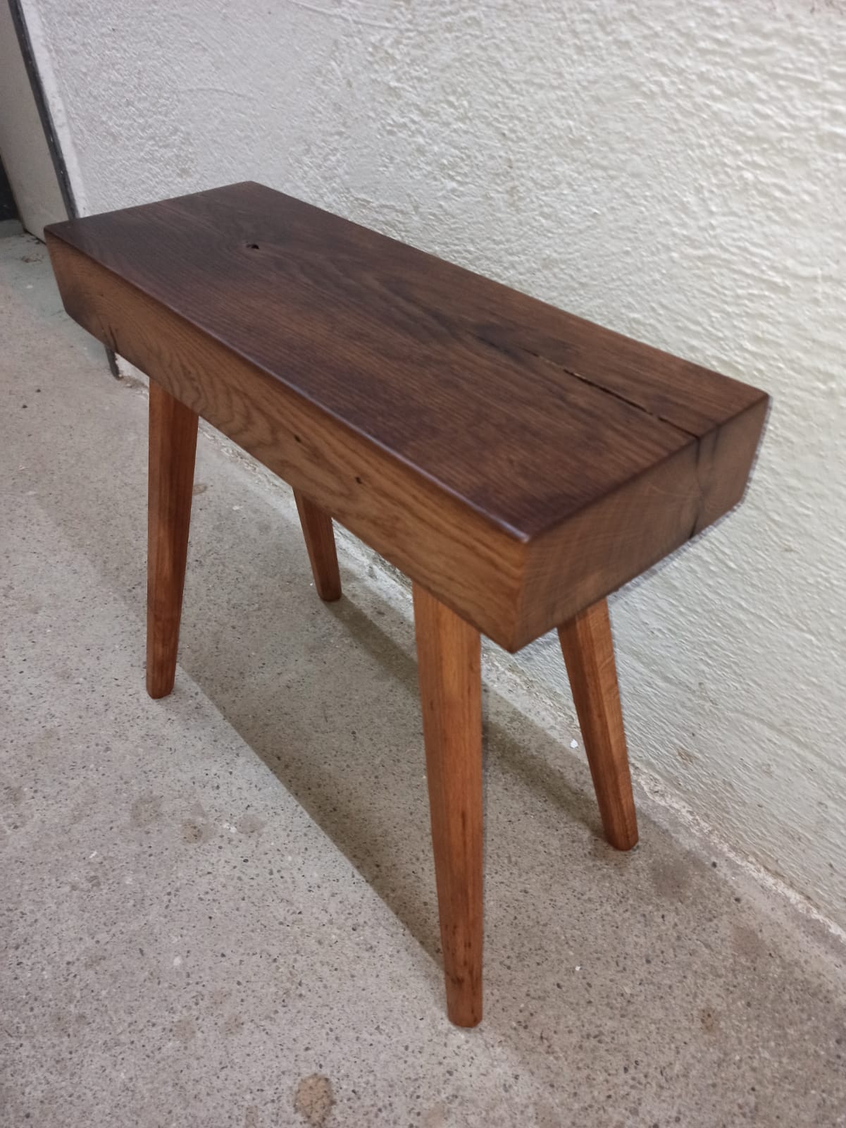 Der neue Behandlungstisch sollte als Ersatz für eine zerlegbare Version stets das Gefühl von Sicherheit geben. Die gewählten Querschnitte wurden entsprechend großzügig gewählt. Das Gestell wurde in der Art einer klassischen Tischkonstruktion in massiver Esche ausgeführt. Die Zapfen wurden als Stollenzinken ausgebildet. Die Tischplatte ist eine einfach BFU-Platte, deren Ecken und Kanten abgerundet wurden. Sie wurde mit einer Schaumgummimatte belegt und mit Kunstleder bezogen.