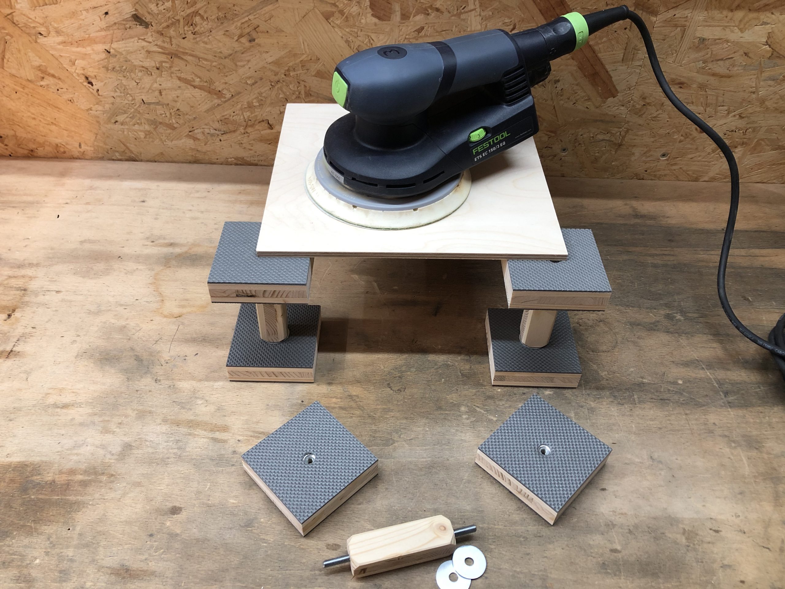 Diese Werkstückstopper bestehen aus Resten einer 3-Schicht-Platte und wurden mit dem Festool CMS-TS 55 R-Set auf Maß gebracht. Integrierte Einschlagmutter ermöglichen den Einsatz von Abstandhaltern. Die Anti-Rutschmatte ist mit doppelseitigem Klebeband aufgebracht.