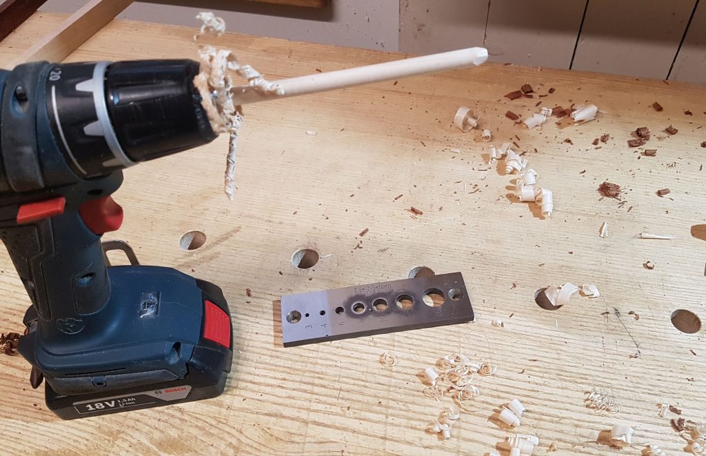 Um den Platz in der kleinen Vorratskammer optimal ausnutzen zu können wurde das Regal aus Fichtenleimholz selbst gebaut. Die Einlegeböden bestehen aus Leimholzplatten, welche mithilfe einer Tischkreissäge sowie einer Stichsäge in das Grundgerüst eingepasst wurden. Die Löcher für die Regalträger wurden mit einer Tischbohrmaschine gebohrt.
