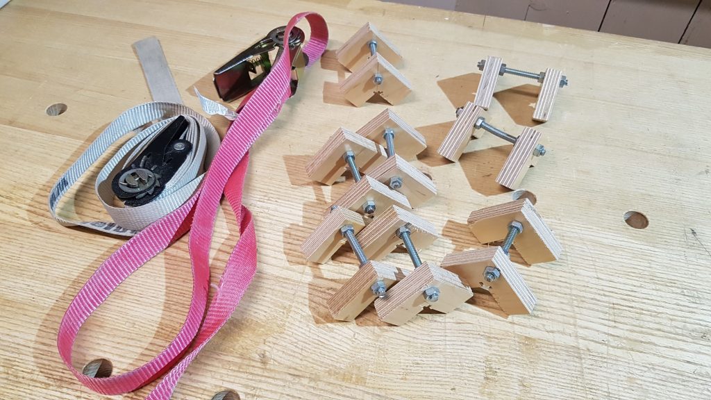 Um bei einem anstehenden Projekt die Kanten kleiner Holzboxen auf Gehrung verleimen zu können, fertigte ich einfache Eckzulagen, L-förmig zugeschnittene Sperrholz-Stücke, die paarweise mit Gewindestangen M6 verbunden wurden. Die Spanngurte können gut auf dem Gewinde gleiten und die vier Ecken zuverlässig aneinander pressen. Bei einem erneuten Bau würde ich aufgrund der größeren Stabilität M8 verwenden.