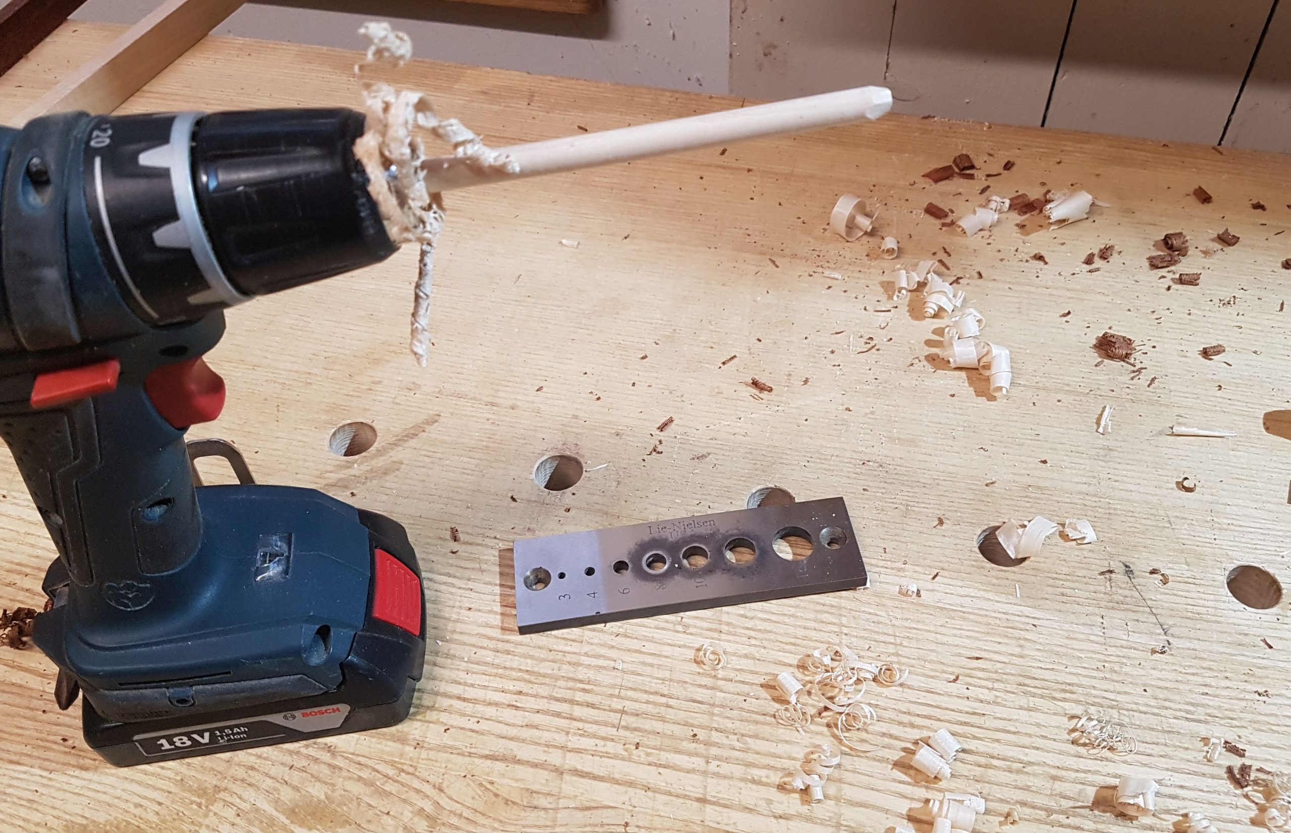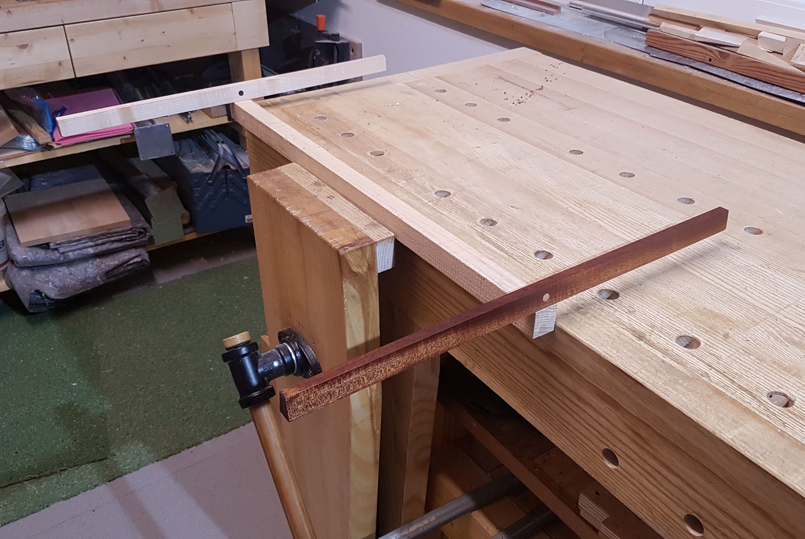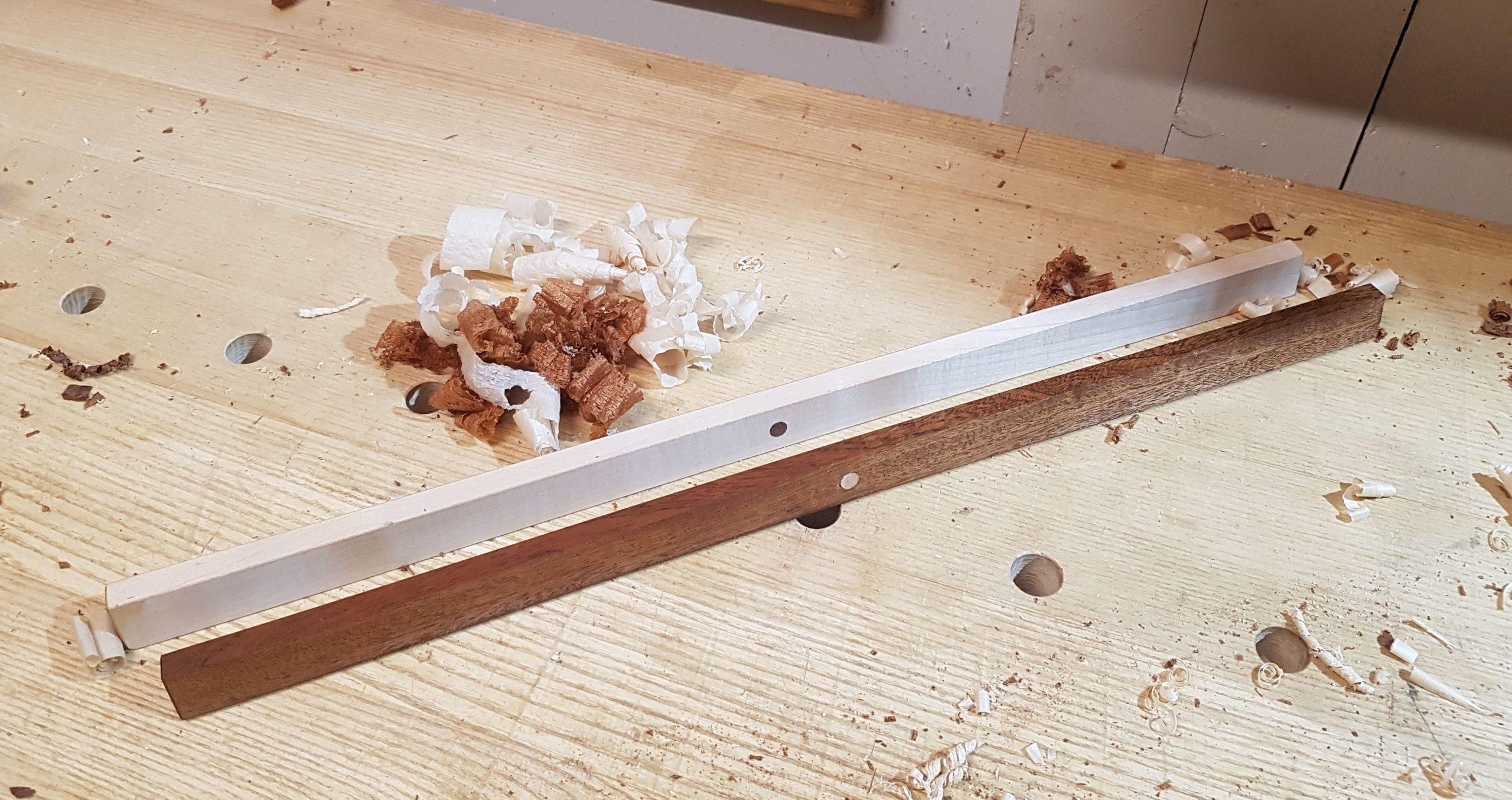 Richtstäbe oder Winding Sticks dienen dazu, Verdrehungen von Holz zu erkennen und das erforderliche Abrichten zu kontrollieren. Sie werden an den Enden des Werkstücks aufgelegt, und beim Visieren über beide Leisten hinweg müssen die beiden fluchten. Ich fertigte meine Exemplare aus Ahorn und Mahagoni. Dübelstäbe aus dem jeweils anderen Holz markieren die Mitte. Das Holz für die Stäbe wurde über mehrere Tage hinweg immer wieder aberichtet, so dass sich möglichst alle Spannungen ausgleichen konnten. Als Werkzeuge dienten Handsägen, Hobel verschienster Größe, eine Lie Nielsen Dübelplatte, Fisch Holzbohrer. Als Finish wurde DICTUM HolzBalsam aufgetragen.