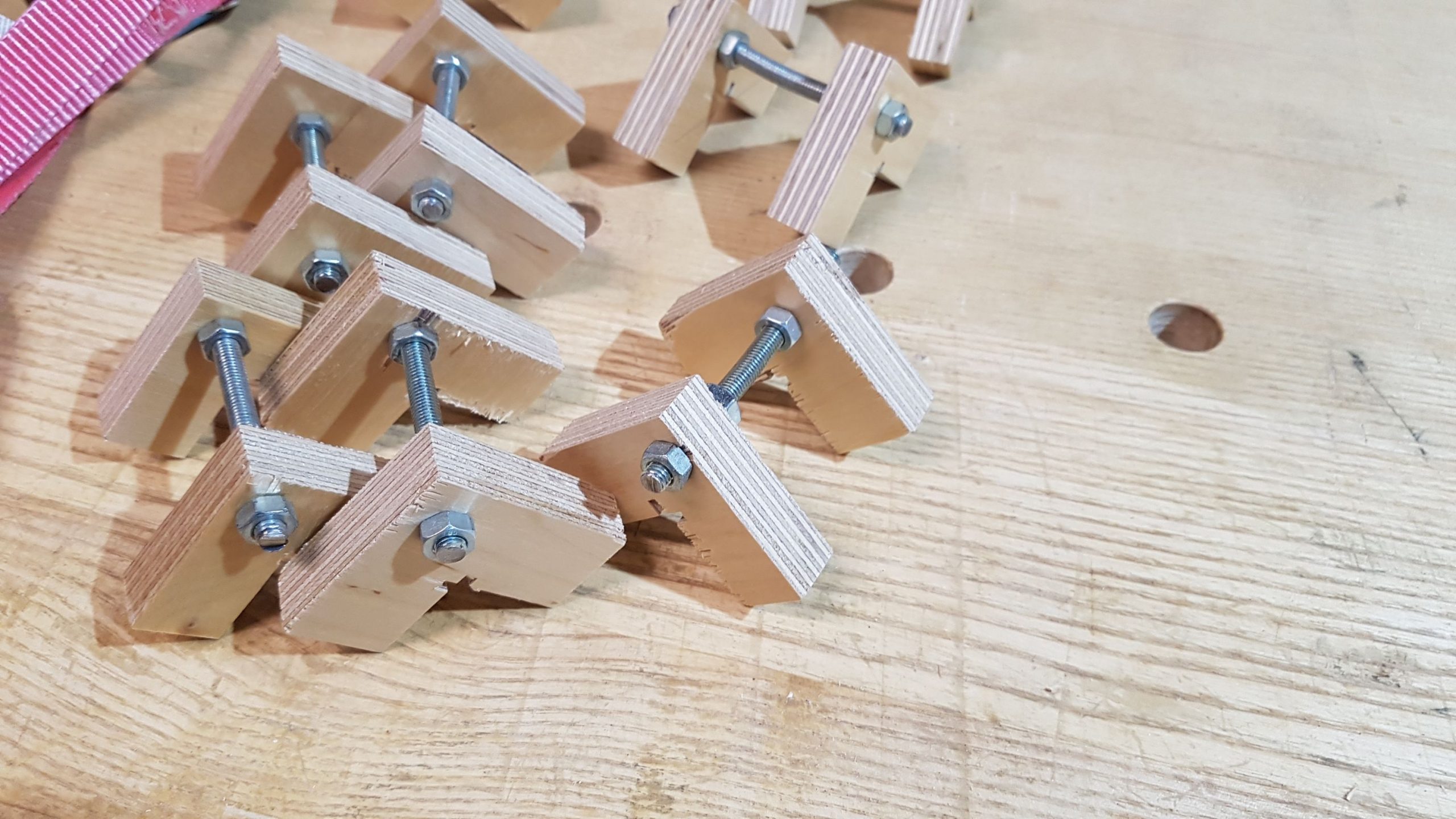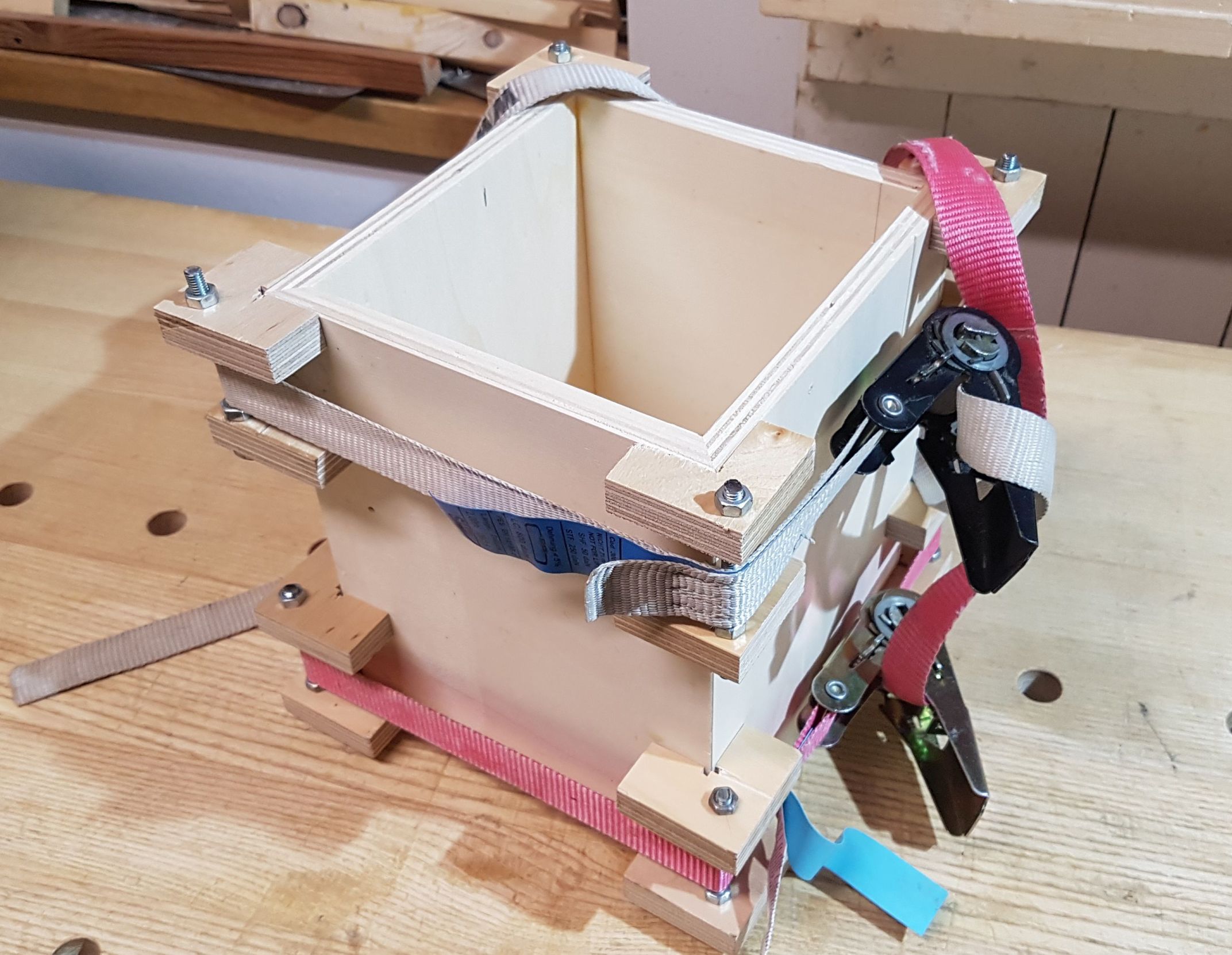 Um bei einem anstehenden Projekt die Kanten kleiner Holzboxen auf Gehrung verleimen zu können, fertigte ich einfache Eckzulagen, L-förmig zugeschnittene Sperrholz-Stücke, die paarweise mit Gewindestangen M6 verbunden wurden. Die Spanngurte können gut auf dem Gewinde gleiten und die vier Ecken zuverlässig aneinander pressen. Bei einem erneuten Bau würde ich aufgrund der größeren Stabilität M8 verwenden.