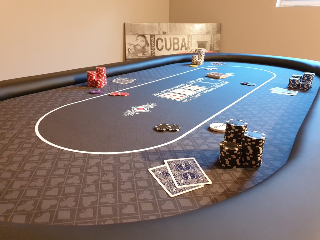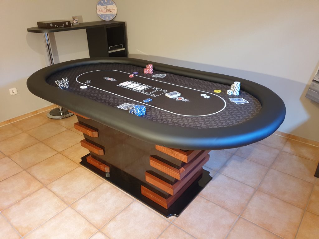 Der Fuß des Pokertisches wurde aus einer 18mm starken Multiplexplatte (Buche) gefertigt und anschließend schwarz gebeizt sowie mit Klarlack überzogen. Die Zierleisten des Tischfußes wurden aus Fichtenholz hergestellt und im Mahagoni-Farbton gestrichen. Die Tischplatte besteht aus 2 verleimten und verschraubten OSB-Platten um die nötige Stabilität zu erreichen. Das ebenfalls aus OSB gefertigte Racetrack sowie das Rail wurde mit 4 cm starkem Schaumstoff beklebt und daraufhin mit Kunstleder bespannt. Beim Spielfeld habe ich mich für eine Pokermatte mit gummierter Unterseite entschieden. Damit können die Spielkarten perfekt über die Spielfläche gleiten und lassen sich leicht vom Tisch anheben.