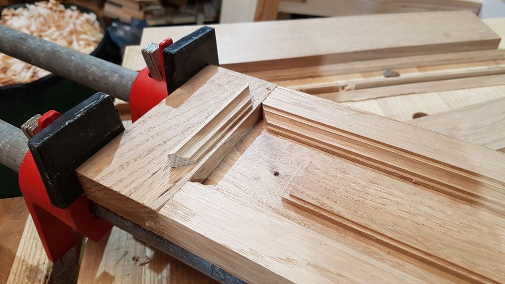 Nachdem ein neues Cerankochfeld mit Bedienung von oben eingebaut worden war, mußte eine Lösung für die Front gefunden werden, in der zuvor die Drehknöpfe eingebaut waren. Es gab den Wunsch, einen Schubladen mit passender Front zu ergänzen. Dessen Front wurde als Rahmenkonstruktion in Eiche gefertigt, mit passenden Profilierungen. Der Schubladen wurde in Kiefer und Fichte mit traditionellen Schwalbenschwanzverbindungen gebaut. Der Boden ist durch Nuten gehalten, in die vordere Nut wurde er eingeleimt, hinten ist er durch Schrauben gehalten. Als Schubladenführung dienen Nuten an der Außenseite. Als Gegenstück wurden am vorhandenen Möbelkorpus Leisten angeschraubt.