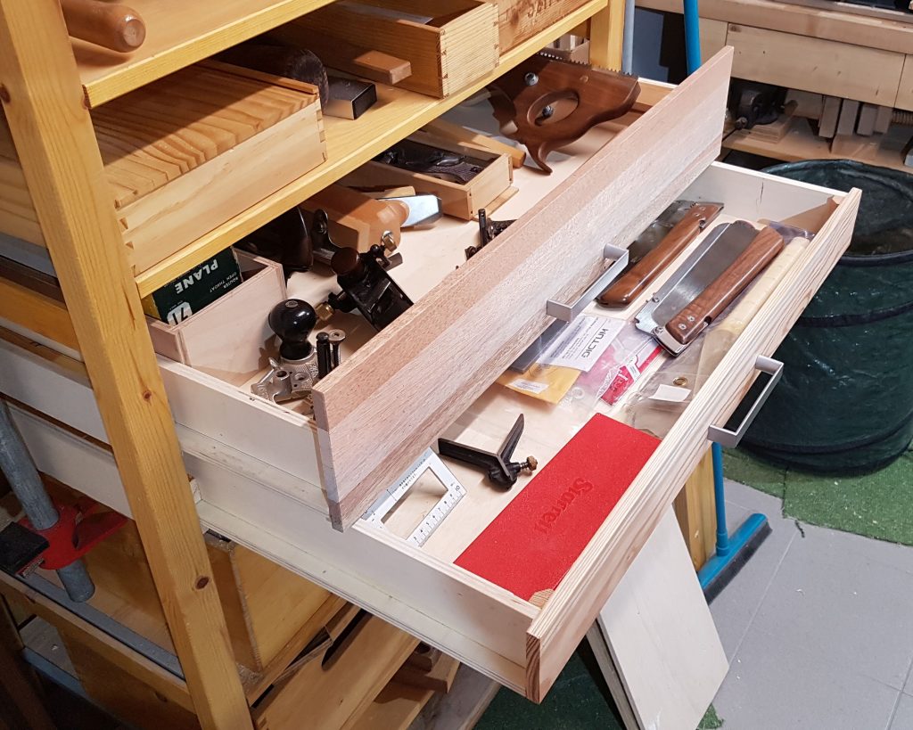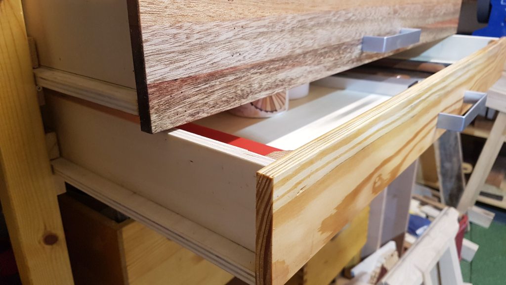 Um den Platz im Systemregal des schwedischen Möbelkonzerns besser ausnutzen zu können fertigte ich Schubläden mit möglichst einfachen Verbindungen. Als Material konnten Reste anderer Projekte verwendet werden, aber auch ein alter Lattenrost von einem Kinderbett. Die Böden werden durch je zwei Leisten geführt, die wiederum auf Streifen aus Sperrholz geleimt wurden. Diese Führungen wurden auf die vorhandenen Bolzen aufgelegt und später durch Schrauben gesichert. Die Böden der Schubläden passen zwischen die Führungen; die Seiten wurden nach innen versetzt einfach stumpf aufgeleimt und die Fronten von vorne einfach stumpf davor gesetzt, ebenfalls nur durch Leim gehalten. In den Innenecken vorne geben kleine Leisten zusätzlich Halt. Als Tiefenanschlag dienen Schrauben, die in die unteren Führungsleisten gedreht wurden. Als Oberflächenbehandlung verwendete ich DICTUM HolzBalsam.