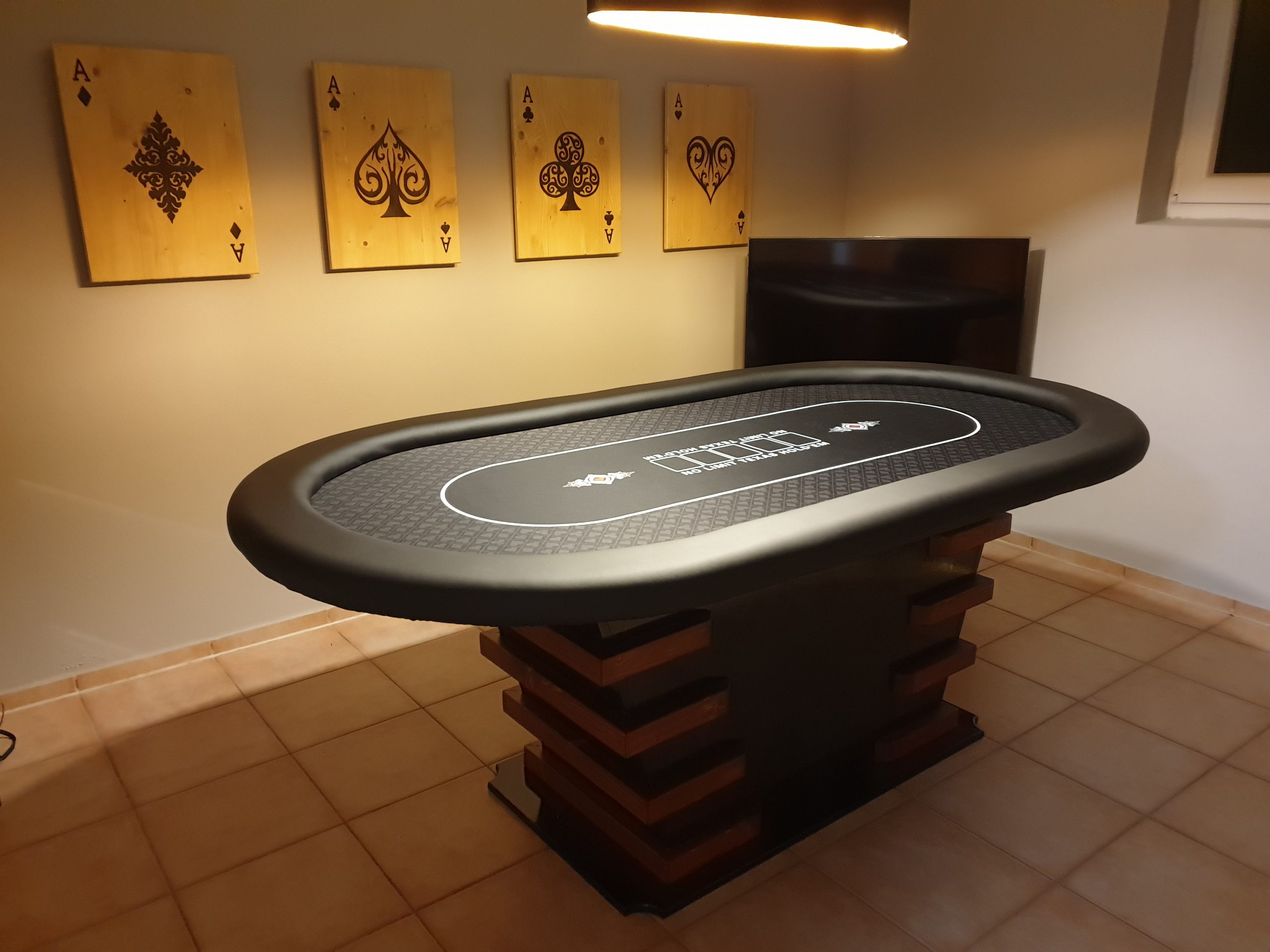Der Fuß des Pokertisches wurde aus einer 18mm starken Multiplexplatte (Buche) gefertigt und anschließend schwarz gebeizt sowie mit Klarlack überzogen. Die Zierleisten des Tischfußes wurden aus Fichtenholz hergestellt und im Mahagoni-Farbton gestrichen. Die Tischplatte besteht aus 2 verleimten und verschraubten OSB-Platten um die nötige Stabilität zu erreichen. Das ebenfalls aus OSB gefertigte Racetrack sowie das Rail wurde mit 4 cm starkem Schaumstoff beklebt und daraufhin mit Kunstleder bespannt. Beim Spielfeld habe ich mich für eine Pokermatte mit gummierter Unterseite entschieden. Damit können die Spielkarten perfekt über die Spielfläche gleiten und lassen sich leicht vom Tisch anheben.