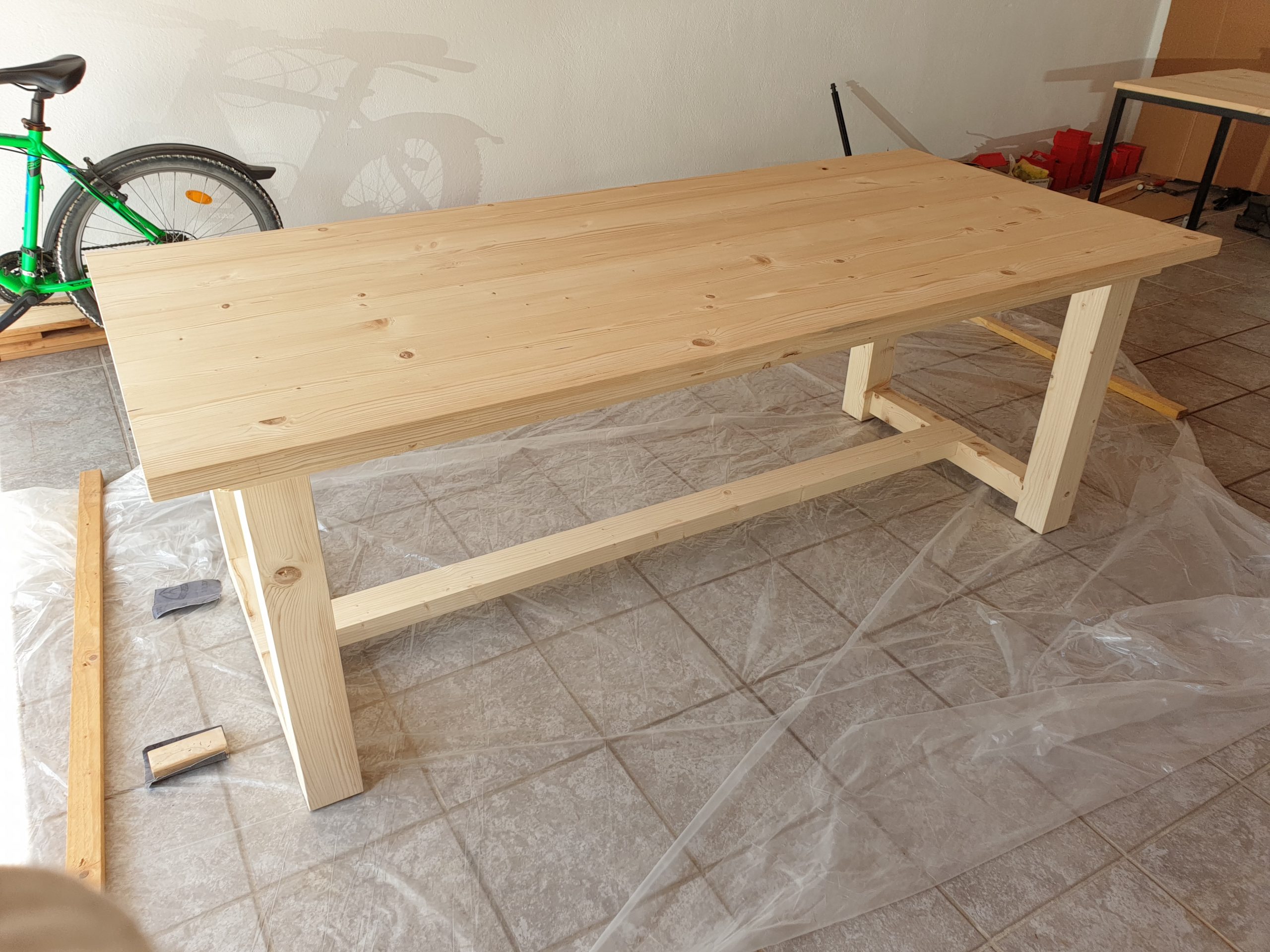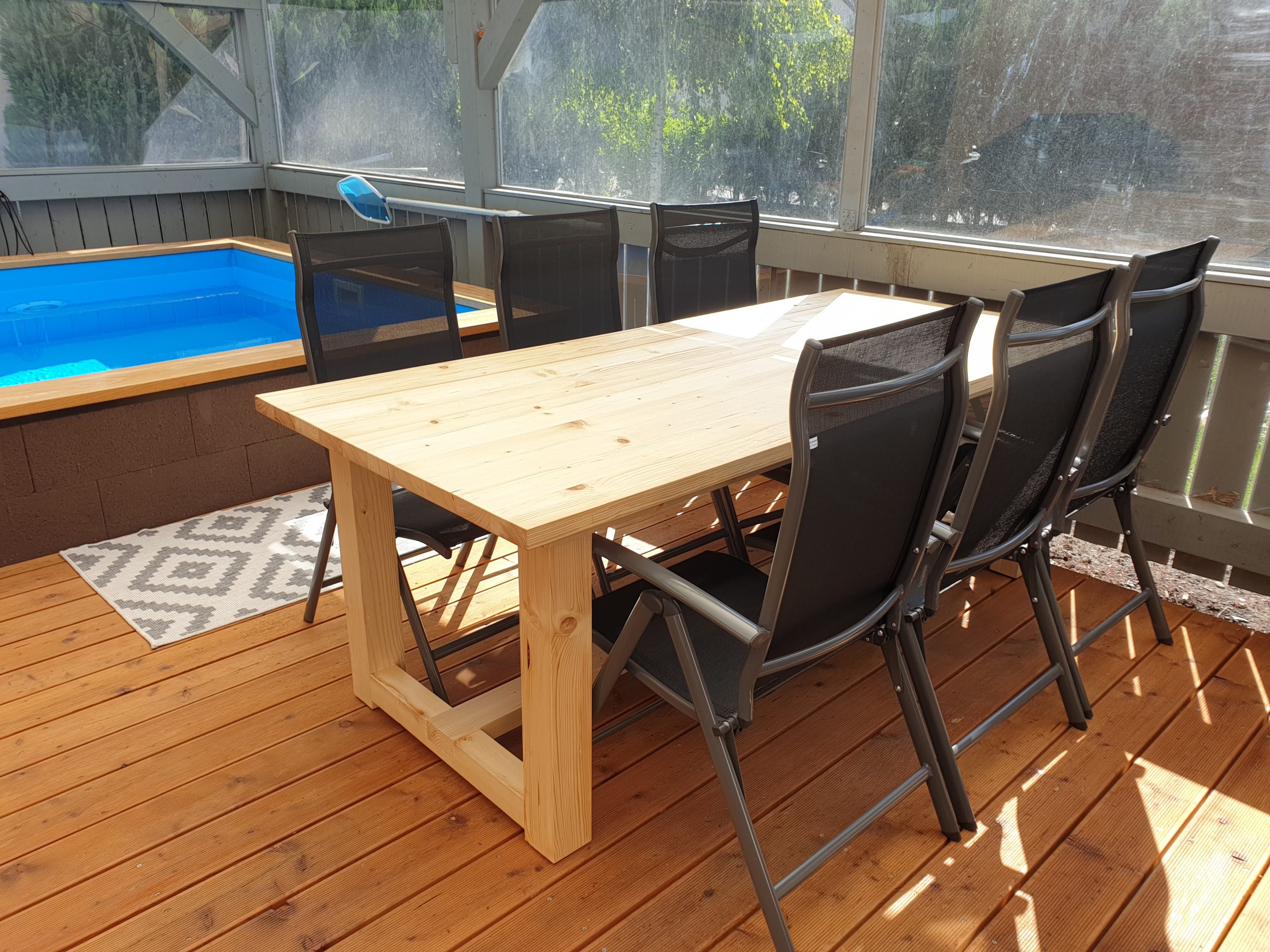 Der Tisch für die überdachte Terrasse war mein erstes Projekt, durch welches ich auch Gefallen an der Arbeit mit Holz gefunden habe. Hergestellt wurde dieser mit Fichtenbohlen sowie Kanthölzern und ein paar Latten (ebenfalls aus Fichte) aus dem Baumarkt. Als Finish und zum Schutz vor Feuchtigkeit wurde der Tisch noch zweimal mit Hartwachsöl eingerieben.