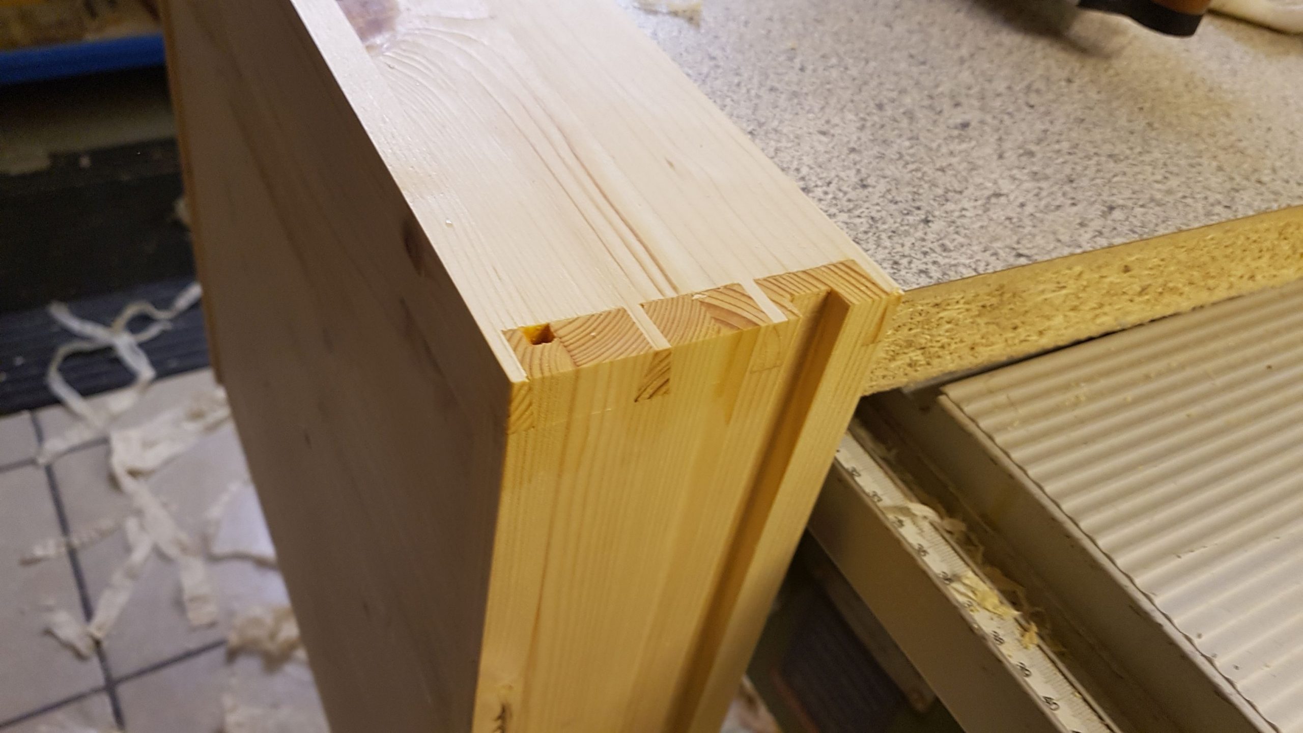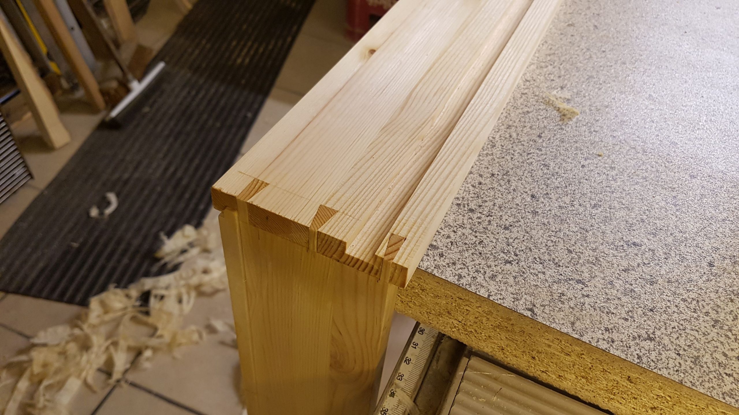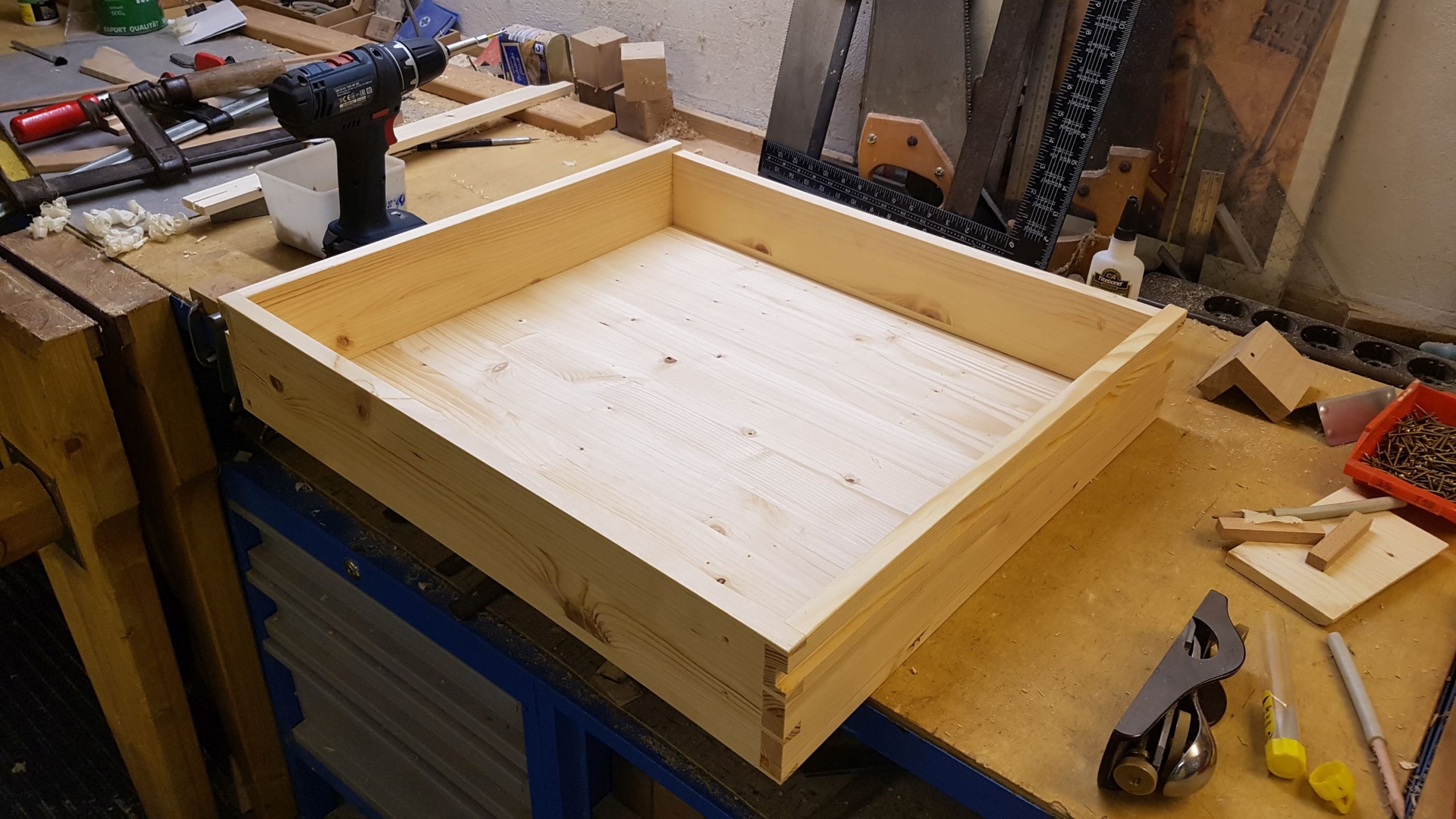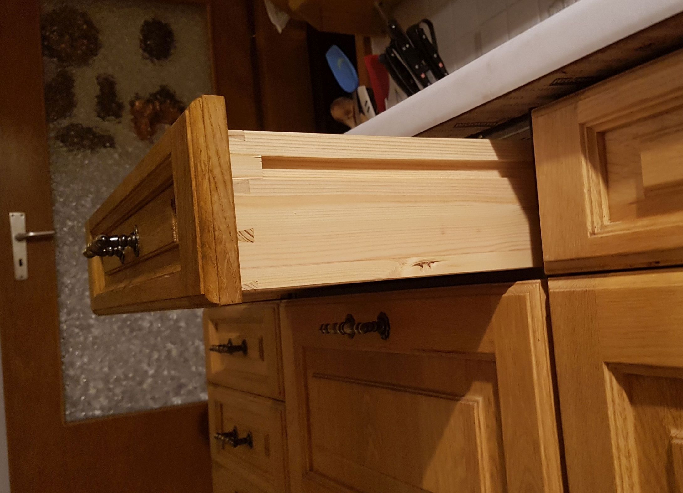 Nachdem ein neues Cerankochfeld mit Bedienung von oben eingebaut worden war, mußte eine Lösung für die Front gefunden werden, in der zuvor die Drehknöpfe eingebaut waren. Es gab den Wunsch, einen Schubladen mit passender Front zu ergänzen. Dessen Front wurde als Rahmenkonstruktion in Eiche gefertigt, mit passenden Profilierungen. Der Schubladen wurde in Kiefer und Fichte mit traditionellen Schwalbenschwanzverbindungen gebaut. Der Boden ist durch Nuten gehalten, in die vordere Nut wurde er eingeleimt, hinten ist er durch Schrauben gehalten. Als Schubladenführung dienen Nuten an der Außenseite. Als Gegenstück wurden am vorhandenen Möbelkorpus Leisten angeschraubt.