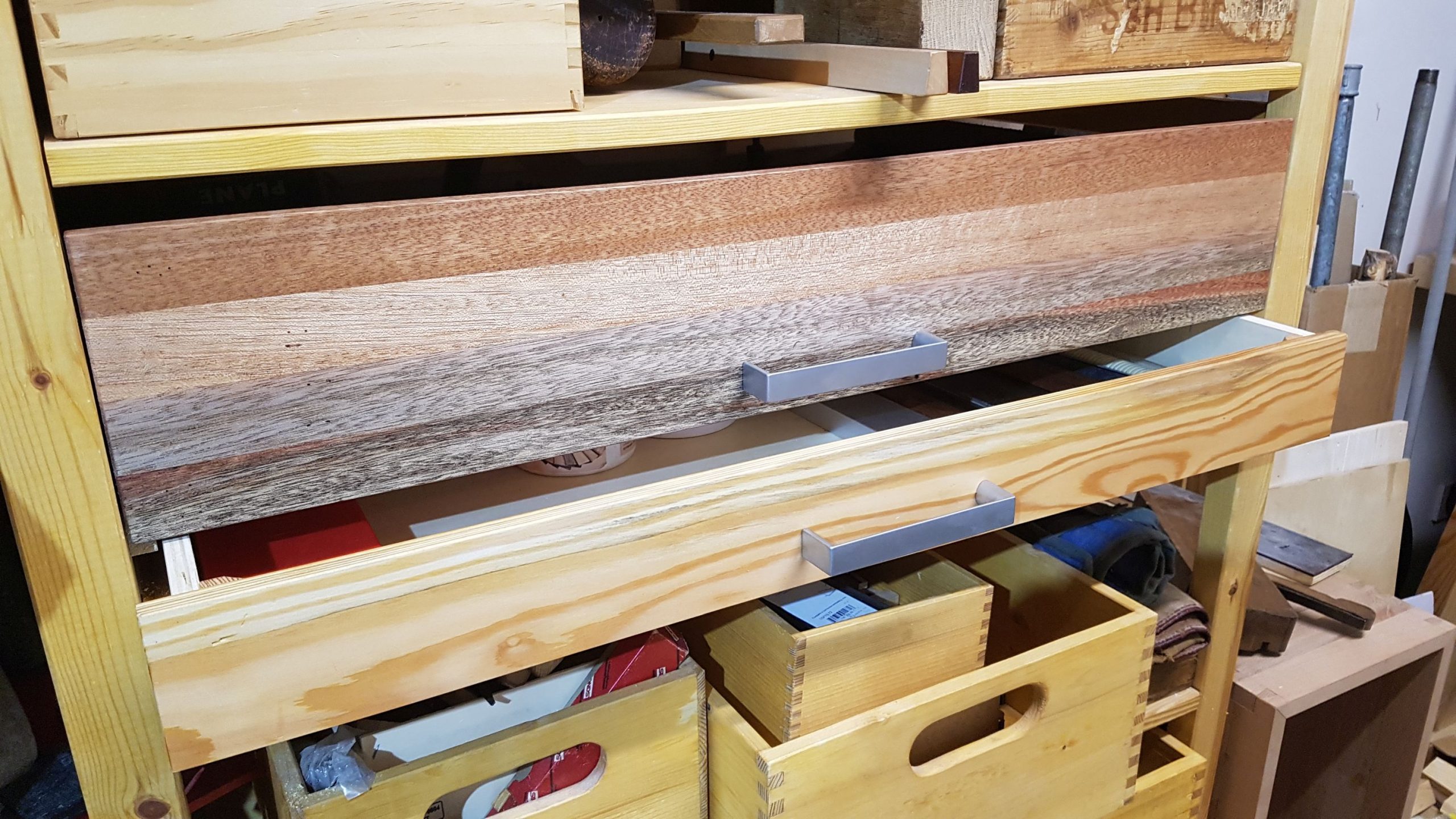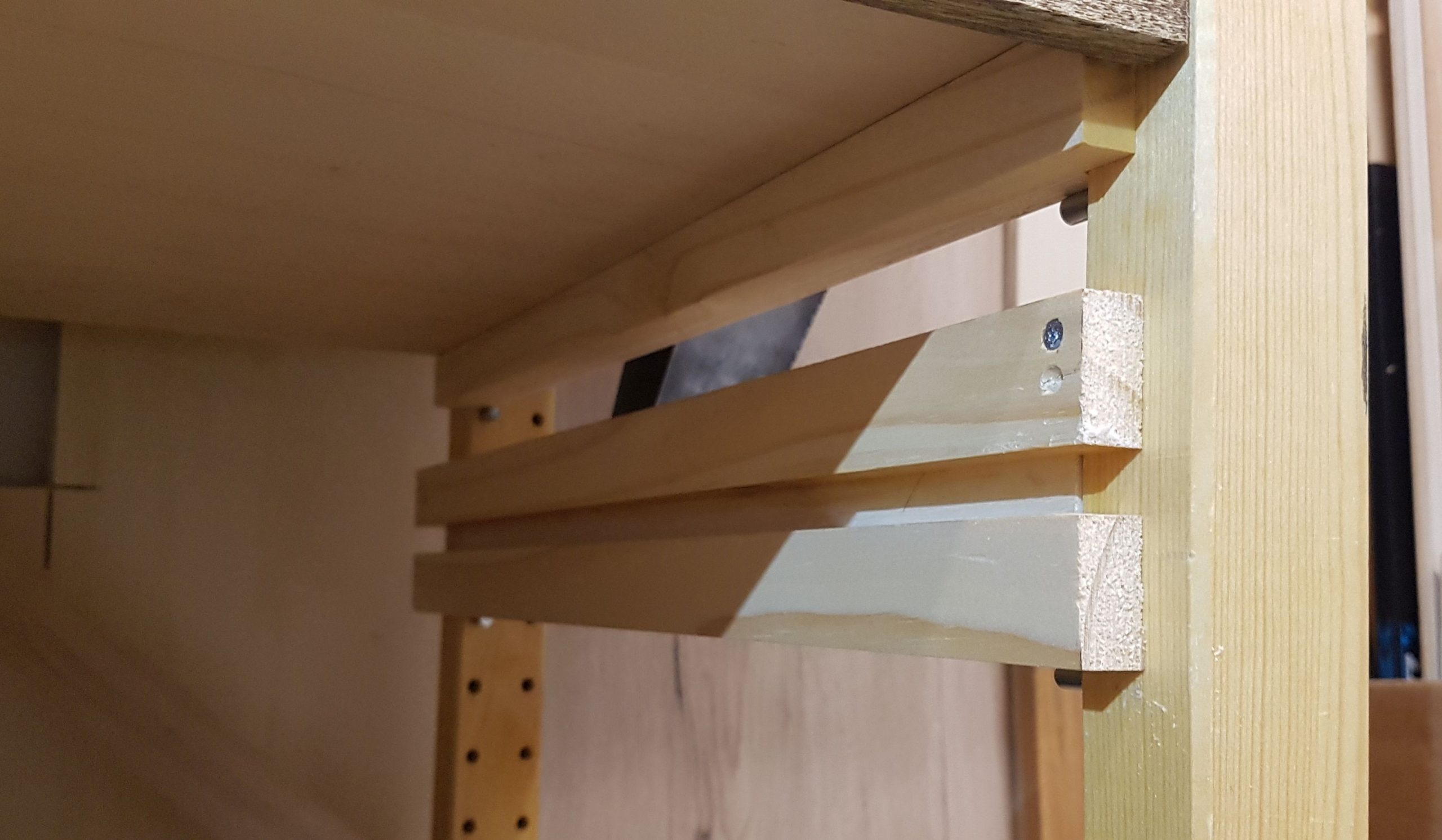 Um den Platz im Systemregal des schwedischen Möbelkonzerns besser ausnutzen zu können fertigte ich Schubläden mit möglichst einfachen Verbindungen. Als Material konnten Reste anderer Projekte verwendet werden, aber auch ein alter Lattenrost von einem Kinderbett. Die Böden werden durch je zwei Leisten geführt, die wiederum auf Streifen aus Sperrholz geleimt wurden. Diese Führungen wurden auf die vorhandenen Bolzen aufgelegt und später durch Schrauben gesichert. Die Böden der Schubläden passen zwischen die Führungen; die Seiten wurden nach innen versetzt einfach stumpf aufgeleimt und die Fronten von vorne einfach stumpf davor gesetzt, ebenfalls nur durch Leim gehalten. In den Innenecken vorne geben kleine Leisten zusätzlich Halt. Als Tiefenanschlag dienen Schrauben, die in die unteren Führungsleisten gedreht wurden. Als Oberflächenbehandlung verwendete ich DICTUM HolzBalsam.