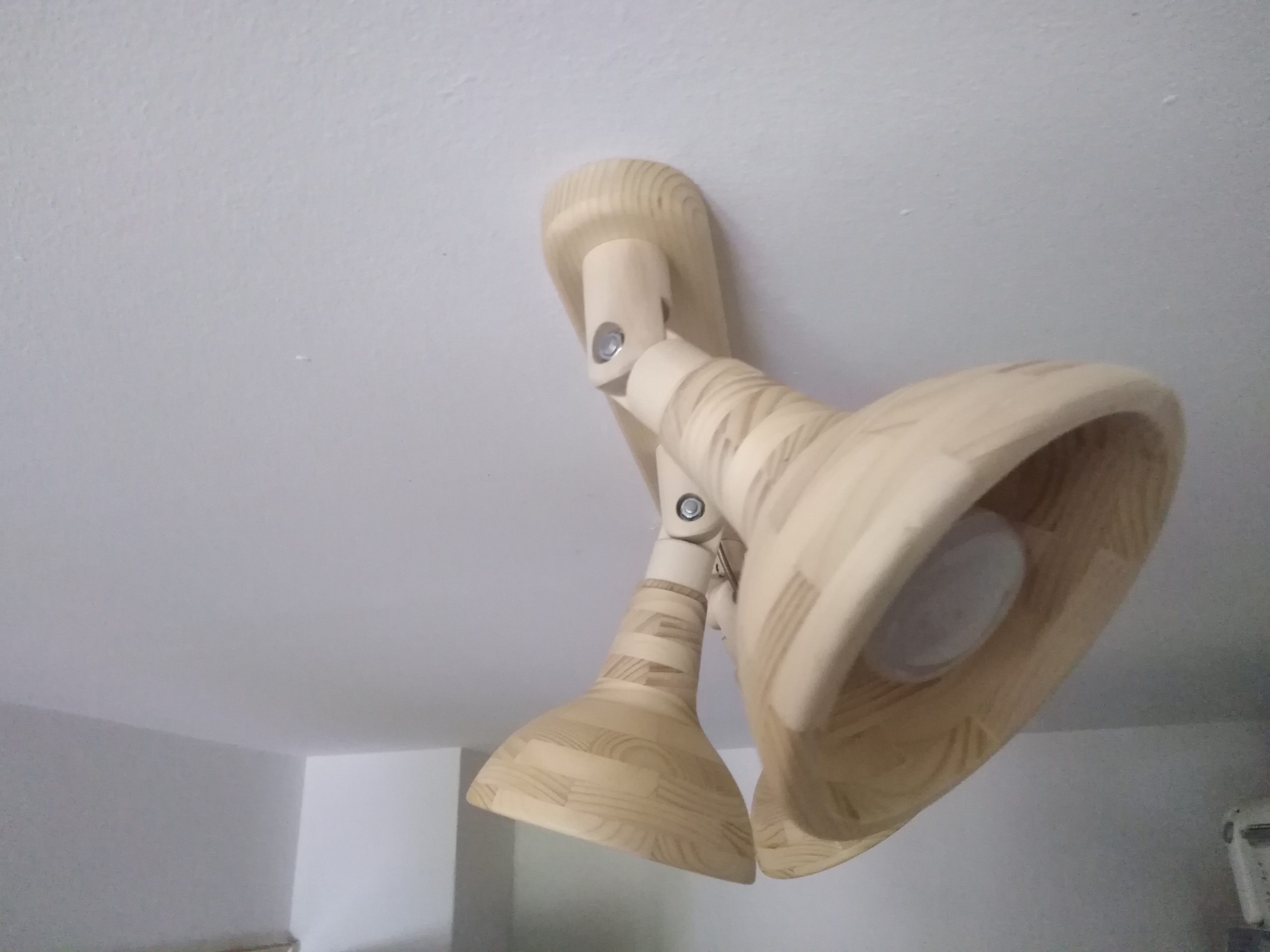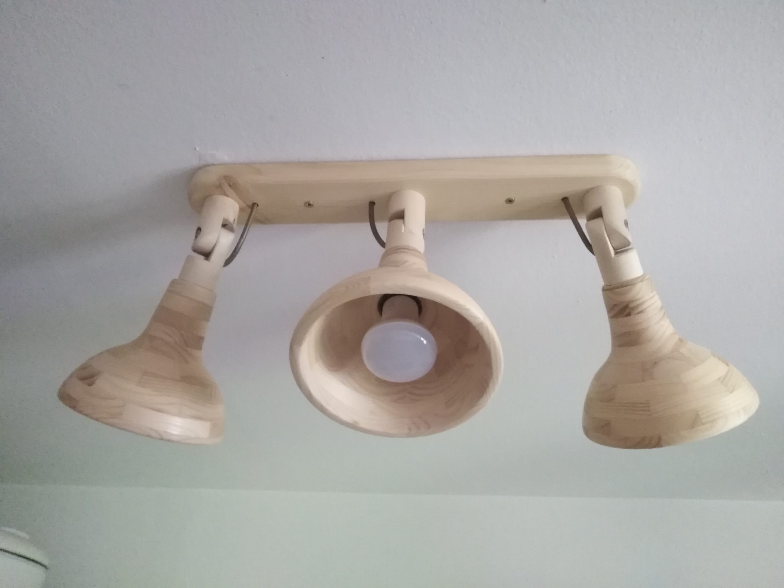 Für meine Studenten-WG habe ich die alte, ziemlich unansprechende Küchenlampe mit einer dreistrahligen Lampe mit gedrechselten Spots ausgetauscht. Als Material wurden vor allem Fichtenabschnitte verwendet. Nach dem versetzen Verleimen der Segmentringe habe ich drei möglichst gleiche Lampenschirme gedrechselt, die schwenk- und drehbaren Befestigungen eingeleimt und die Fassungen inkl. passendem Kabel installiert. Durch die drei Spots kann man jetzt die ganze, und nicht mehr Teile der Küche beleuchten.