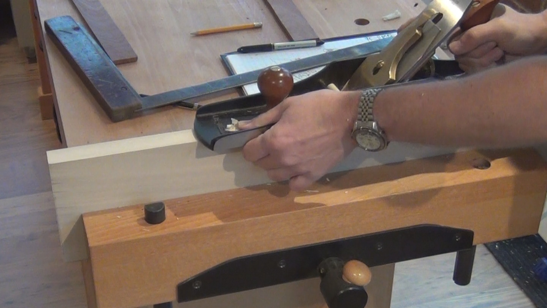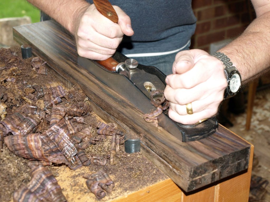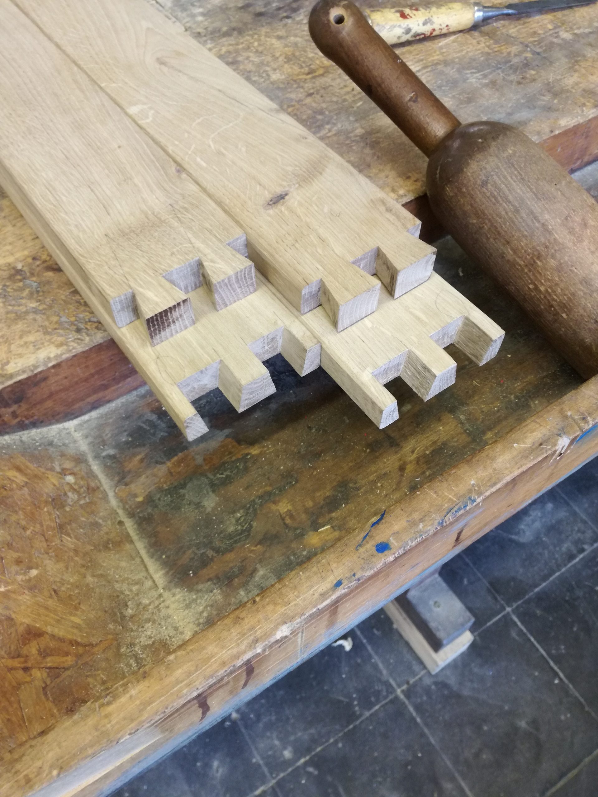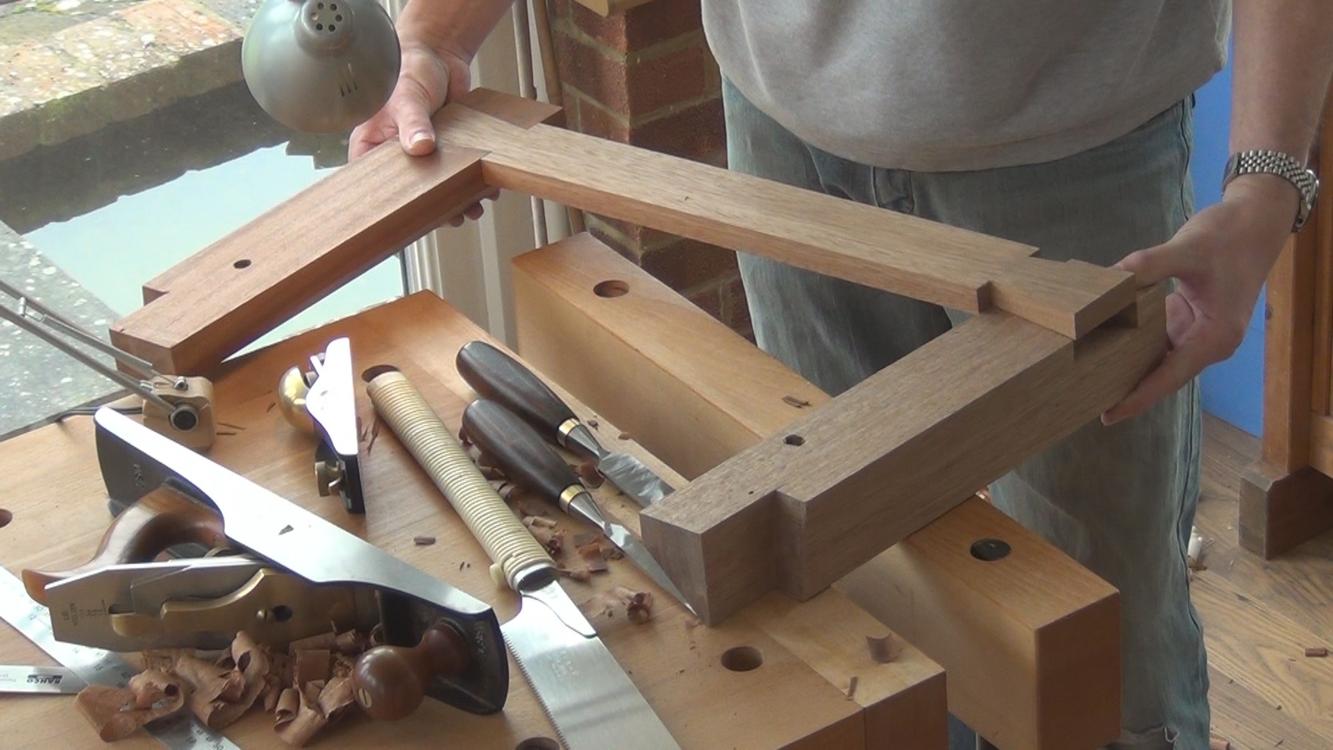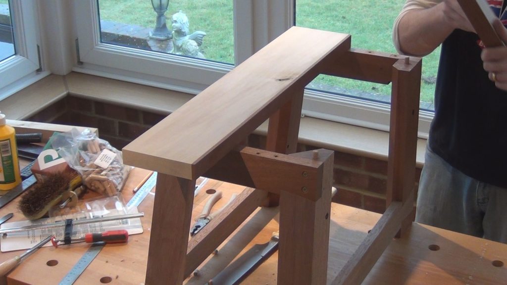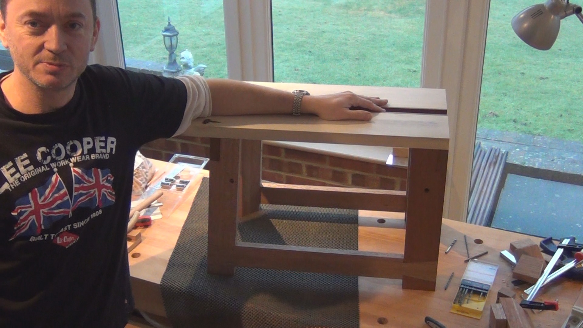 Meine Sägebank habe ich aus hell- und dunkelroten Meranti, sowie englischem Holly gebaut. Für das Gestell verwendete ich schwalbenschwanzförmige Überblattungen, die Oberseiten sind mit Dübeln und Schrauben befestigt. Das Design unterstützt das senkrechte Sägen durch zwei vertikale Außenseiten, während die anderen beiden zur Stabilisierung schräg stehen.