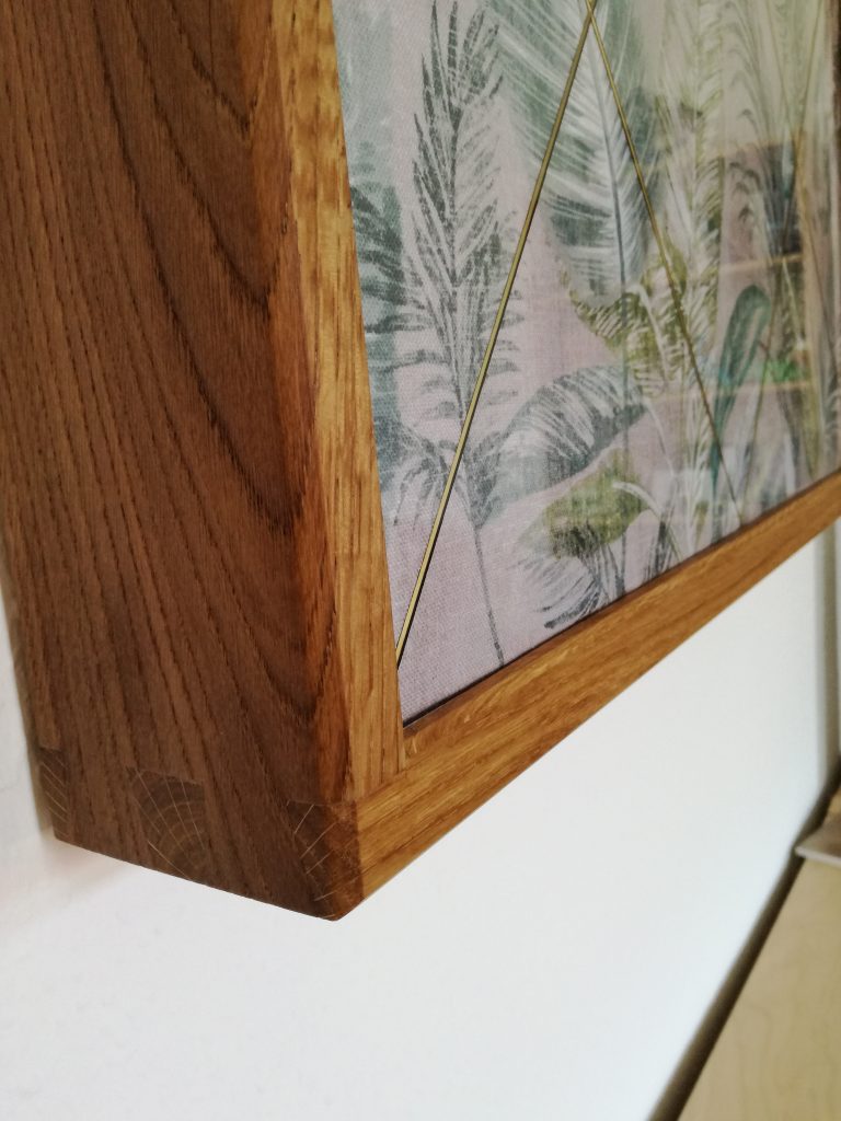 Dieses Dekofenster besteht aus einem mittels Schwalbenschwänzen verbundenem Eichenrahmen, strukturiertem Fensterglas aus einem alten Schrank und Stoff mit Dschungelmuster.