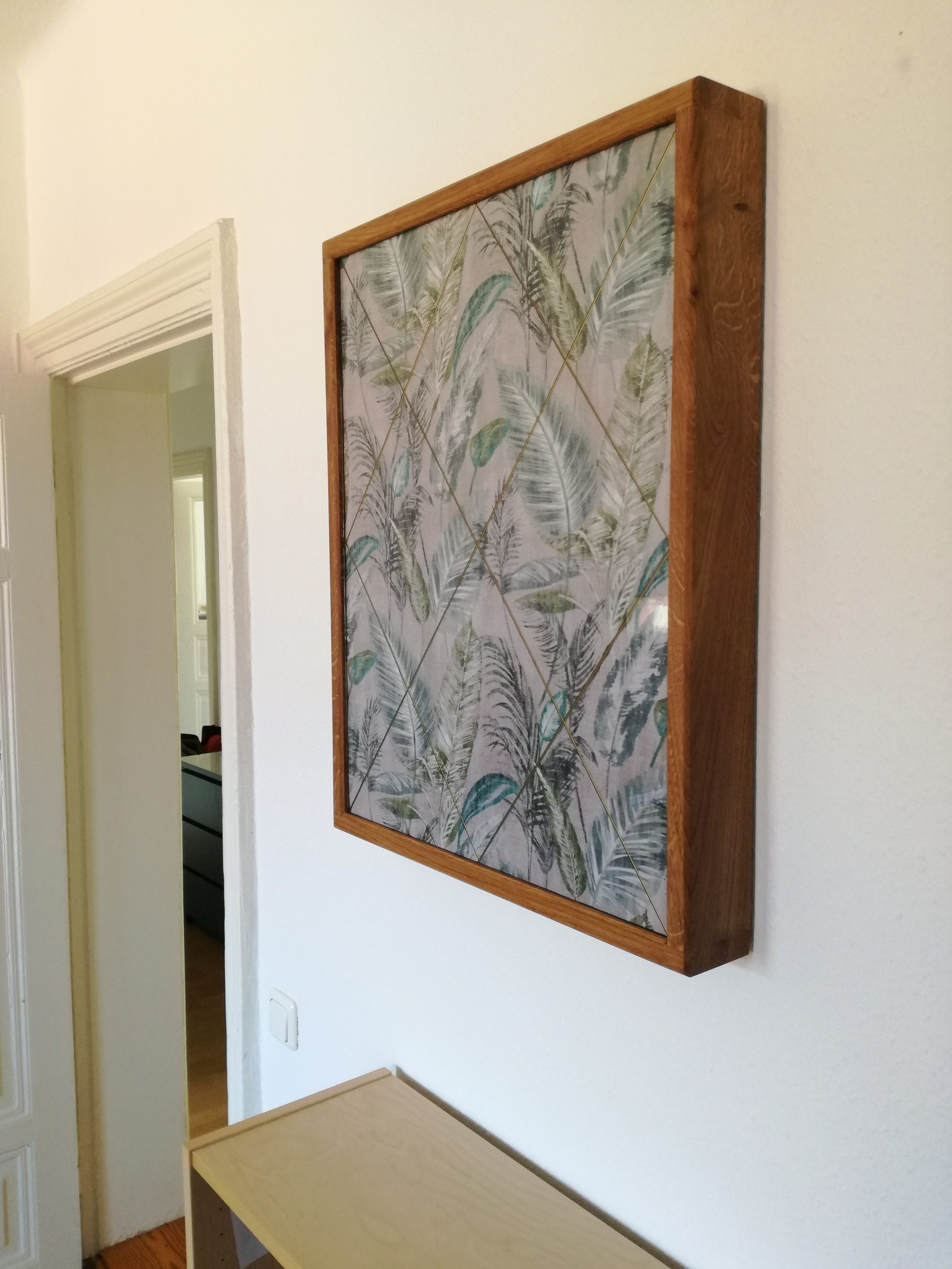 Passend zu dem Dschungelfenster sollte eine Bodenlampe entstehen. Der Korpus aus Eichenholz wurde über Schwalbenschwänze verbunden und nimmt ein mit Stoff bespanntes LED Panel auf.