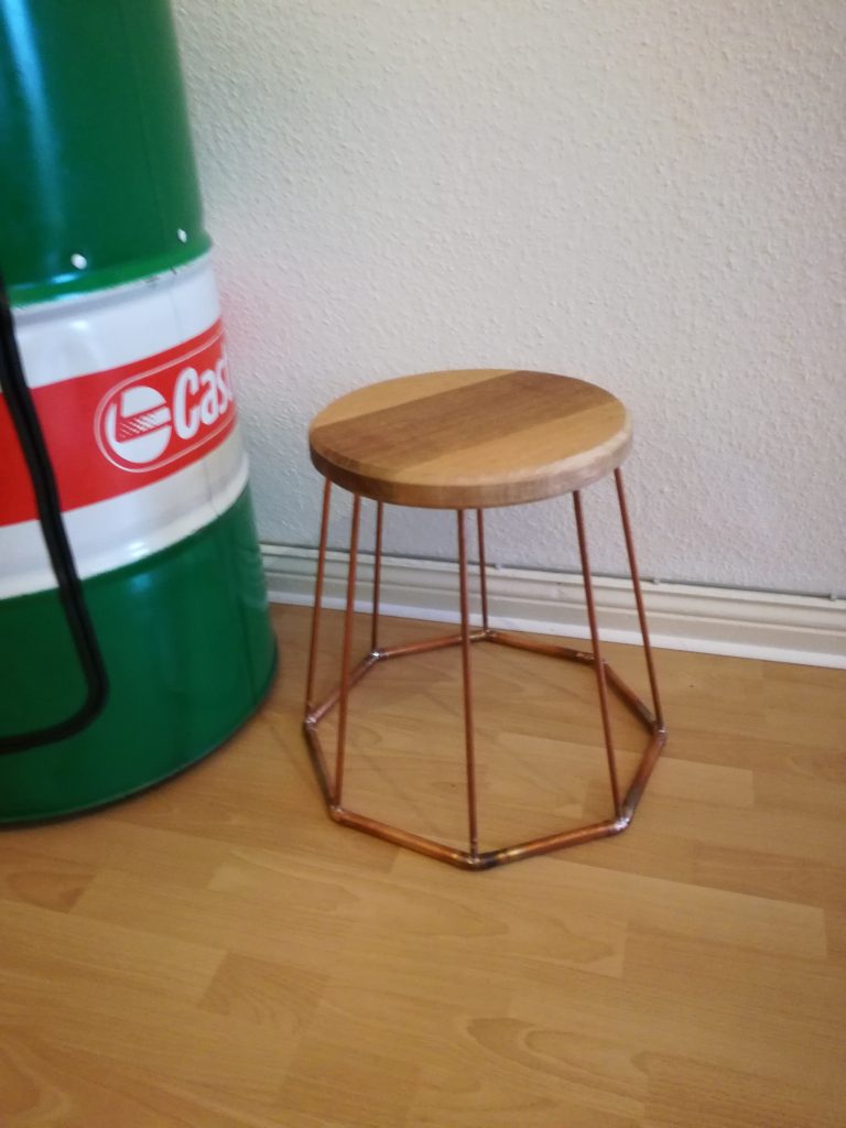 Dieser kleine Hocker besteht aus einer runden Eichenplatte und Kupferrohren in verschiedenen Durchmessern. Die achteckige Basis wurde mit Fittings verlötet und die winklig zulaufenden Streben zur Platte mit der Basis verlötet. Die Steben wurden in ebenfalls schräg gebohrte Löcher mit der Holzplatte verklebt.