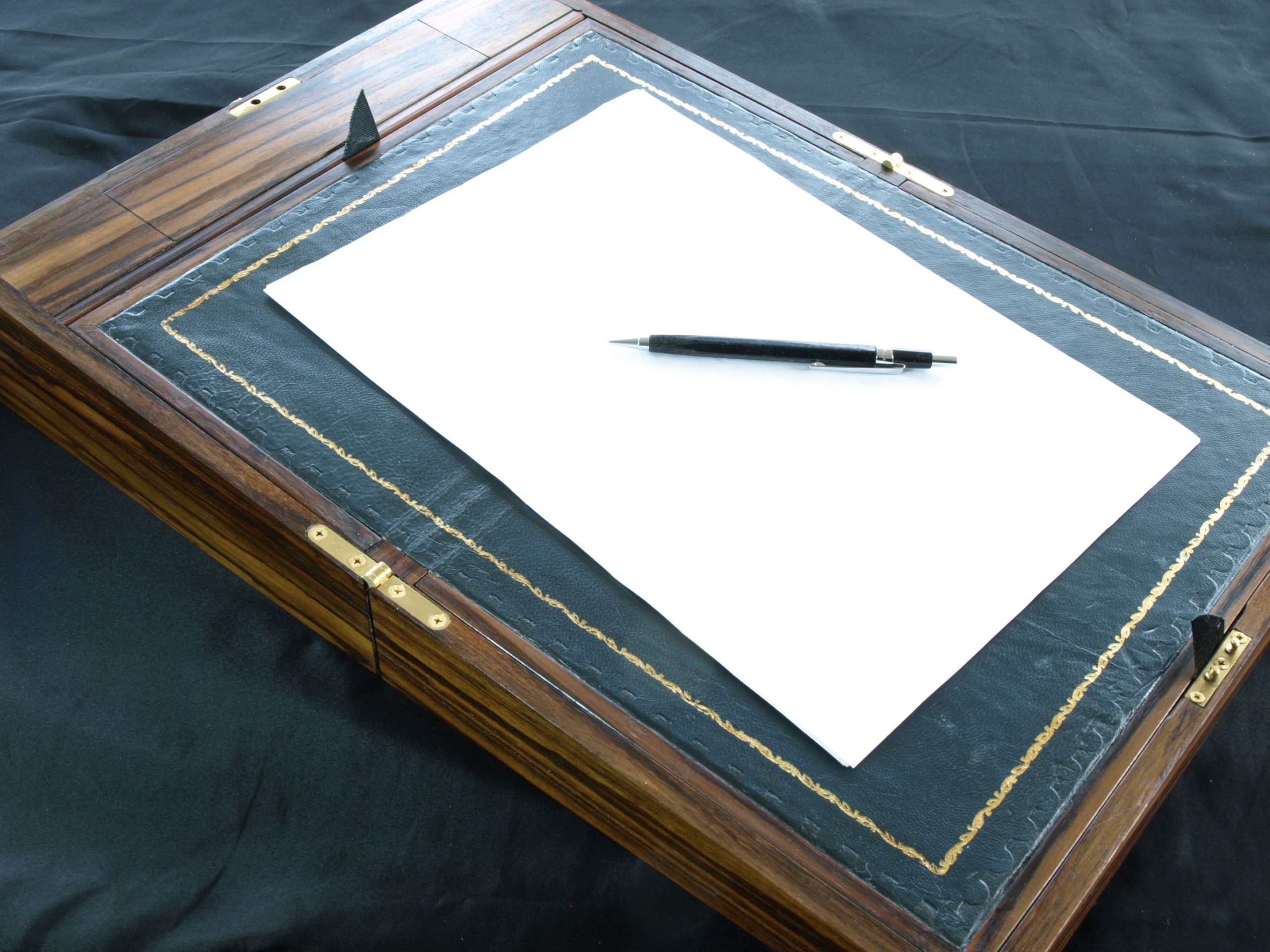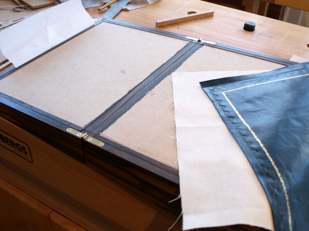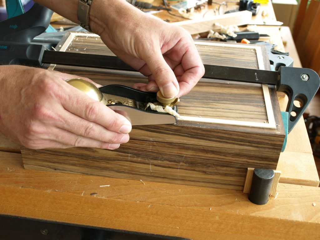 Meine Schreibpult entstand aus einem Brett ostindischem Rosenholz und englischem Holly (Stechpalme), 6 mm starkem Birkensperrholz und ebenso starkem MDF. Das Furnier für Boden und Deckel trennte ich mit der Bandsäge auf. Die Seitenteile wurden mit Gehrungszinken verbunden, die inneren Unterteilungen wurden in Nuten eingesetzt. Die gesamte Box habe als ein Stück angefertigt und erst danach mit einem schrägen Schnitt „geöffnet“. Die geneigten Abdeckungen sind mit Leinwand und Leder bezogen, darunter befinden sich kleinere Ablagen. Die Abdeckungen weiterer Ablagefächer haben einen Magneten eingearbeitet und können mit einem kleinen Magneten geöffent werden. Das gesamte Objekt erhielt mehrere Anstriche aus Schellack.