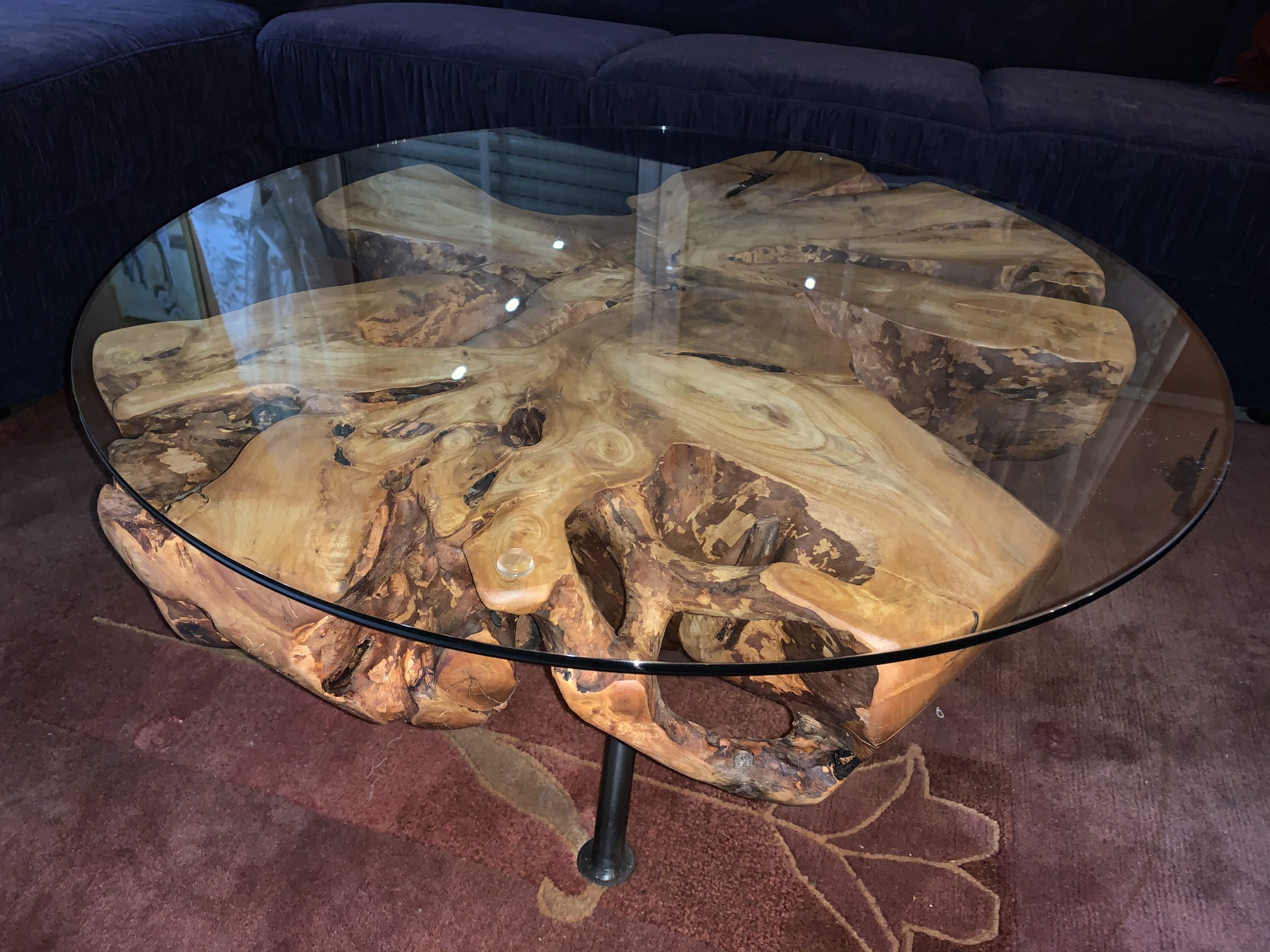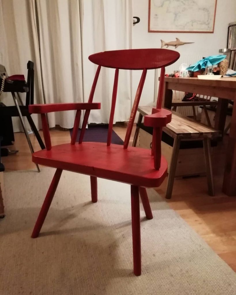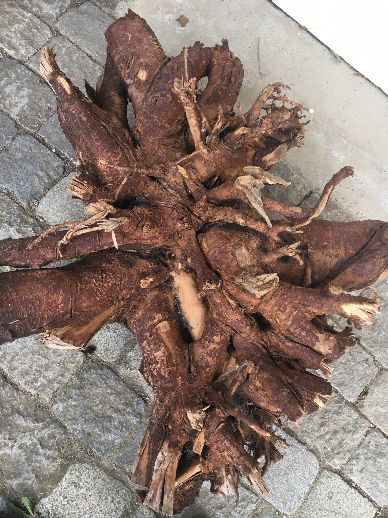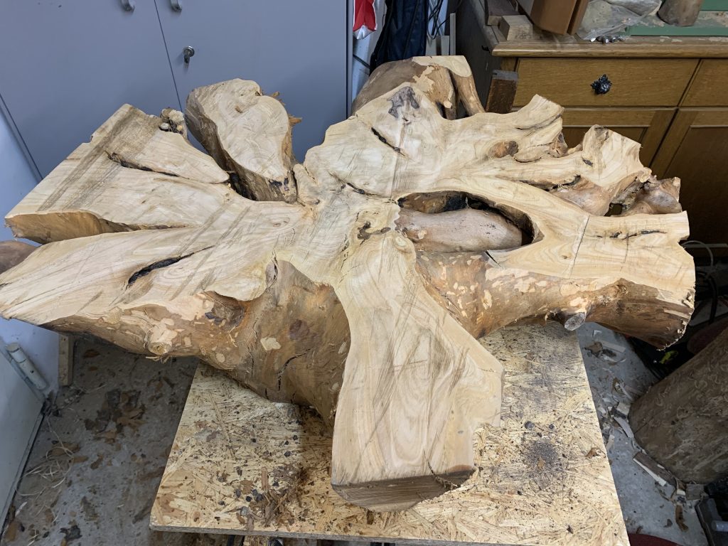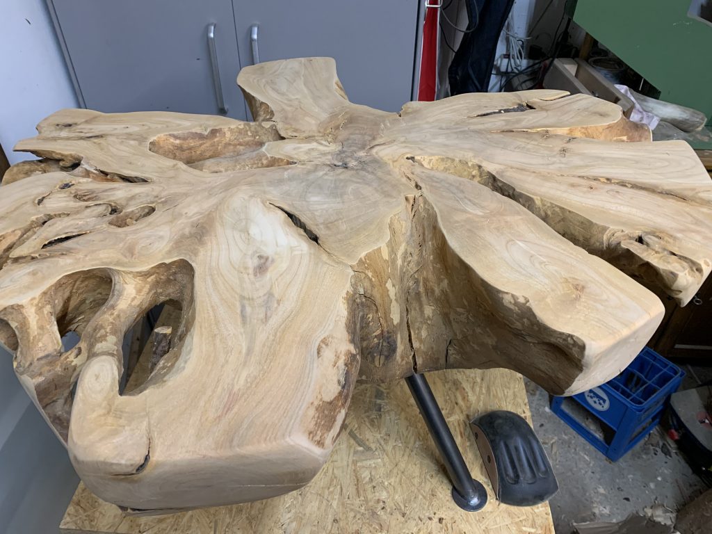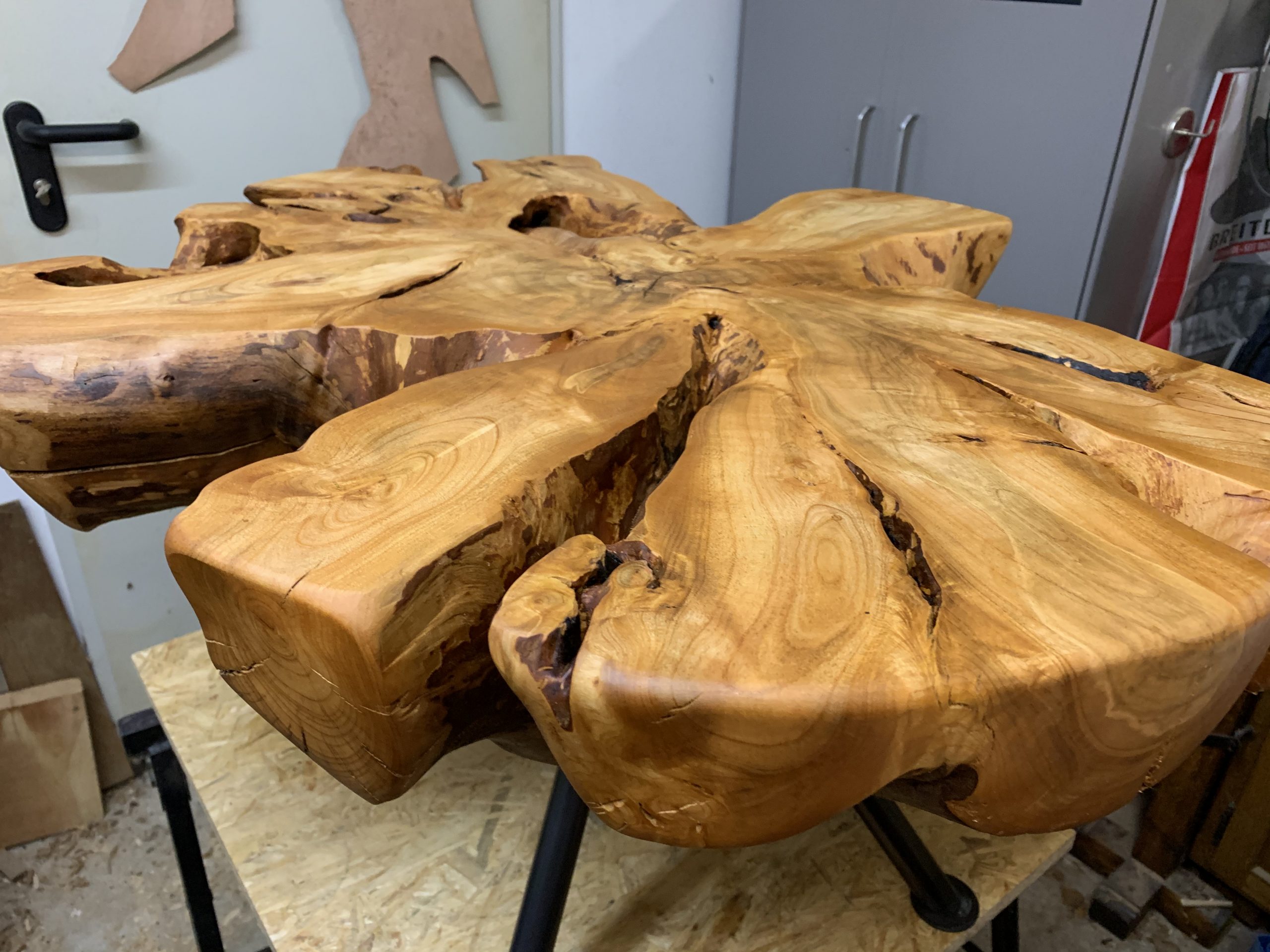 Der Stock wurde mit der Kettensäge aufgetrennt und mit der Oberfräse die Obere und Untere Hirnholzfläche Plan und jeweils parallel zueinander gefräst. Rinde entfernt, alles schön gerundet und bis P180 geschliffen, geölt mit Leinölfirniss.