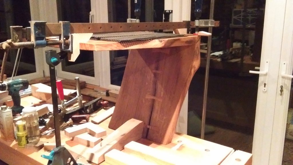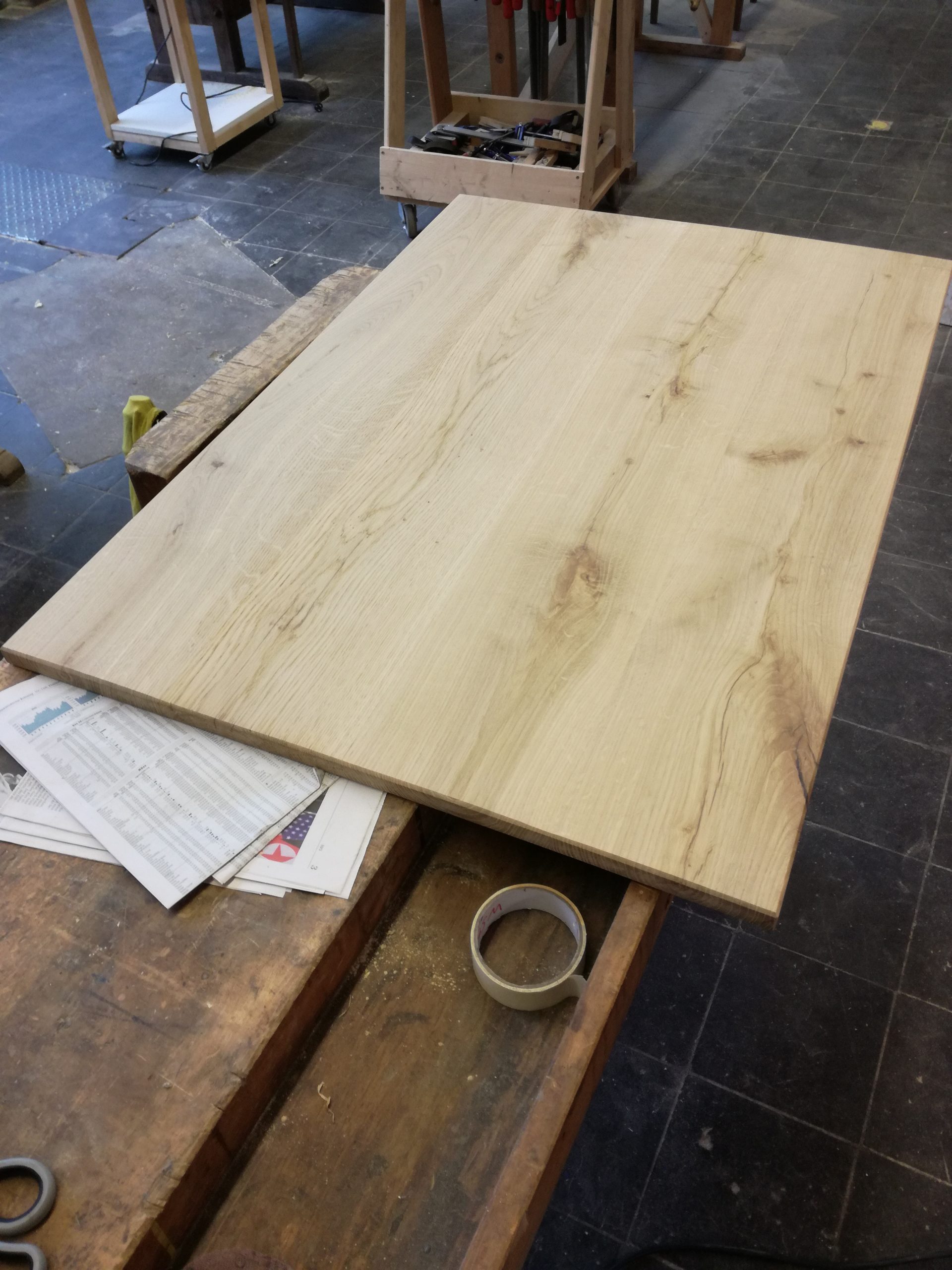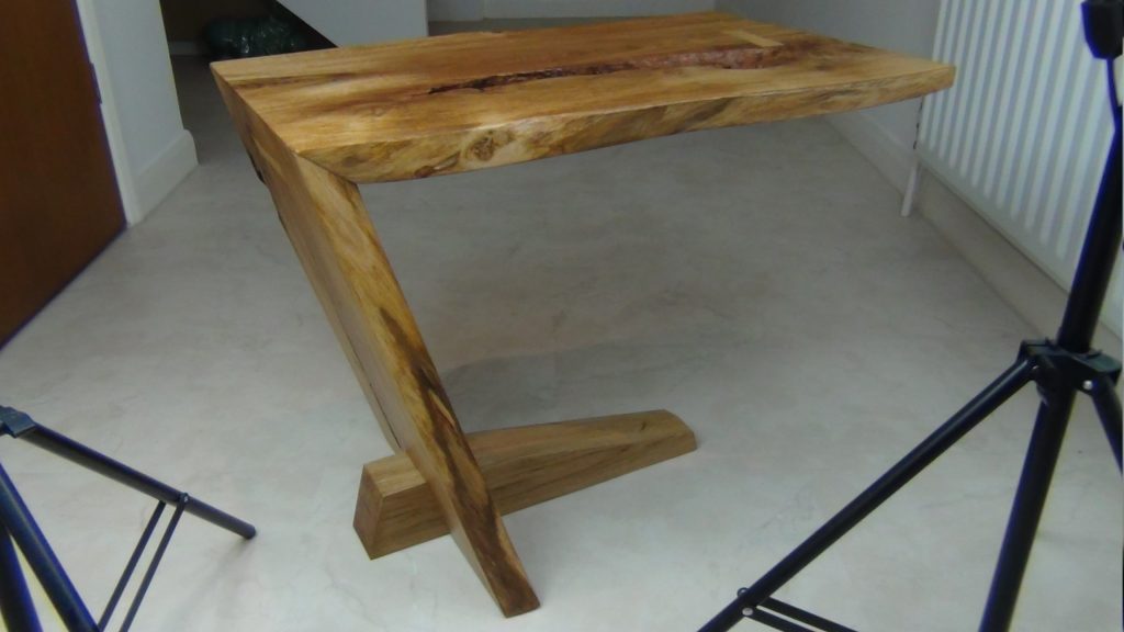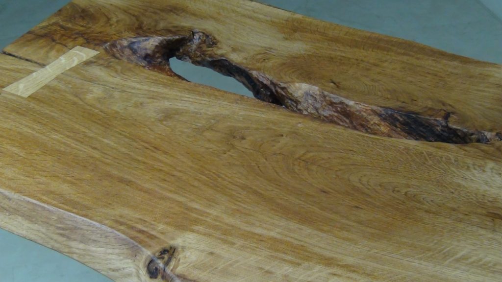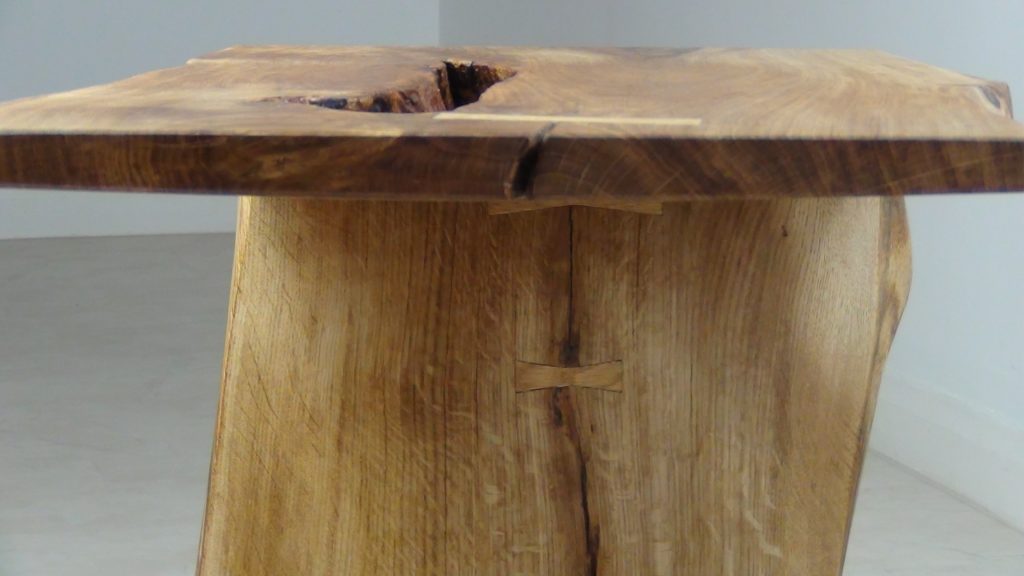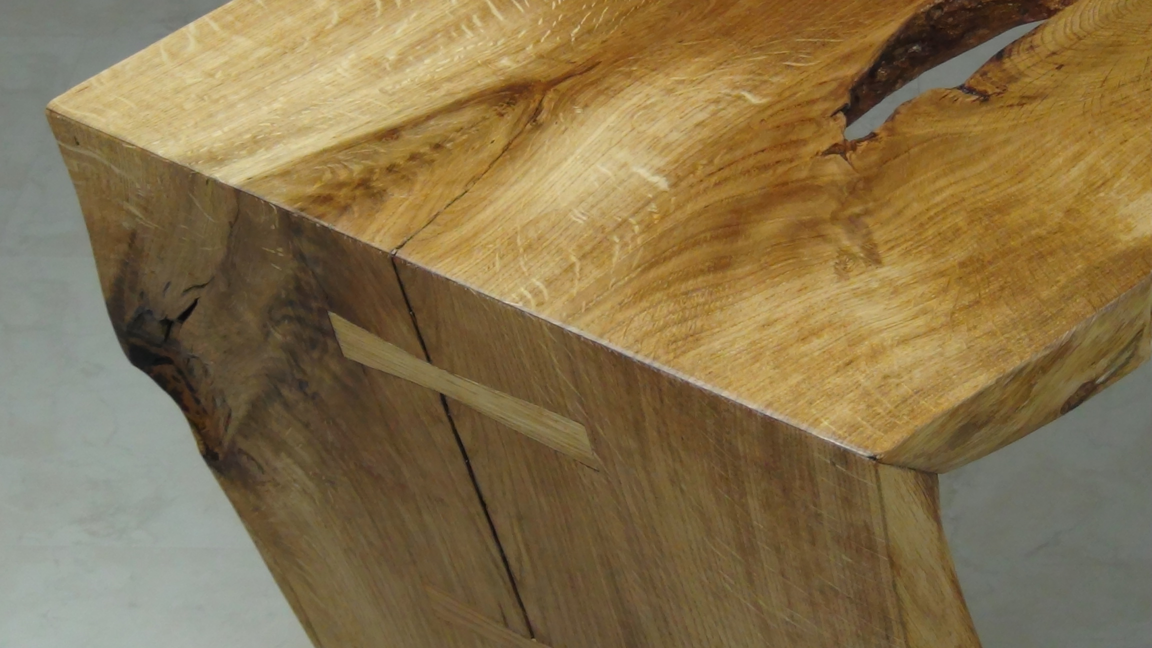 Spitzwinkliger Wasserfall-Tisch aus englischer Eiche, mit Maschinen und Handwerkzeug gefertigt. Die spitze Eckverbindung wurde mit 2 Reihen an Flachdübeln verstärkt. Die entsprechenden Bohrungen wurden mit einer Oberfräse hergestellt und die Flachdübel von Hand eingepasst. Die Risse im Holz wurden mit „Dutchmans“ stabilisiert. Als Oberflächenbehandlung kam Tungöl zum Einsatz.