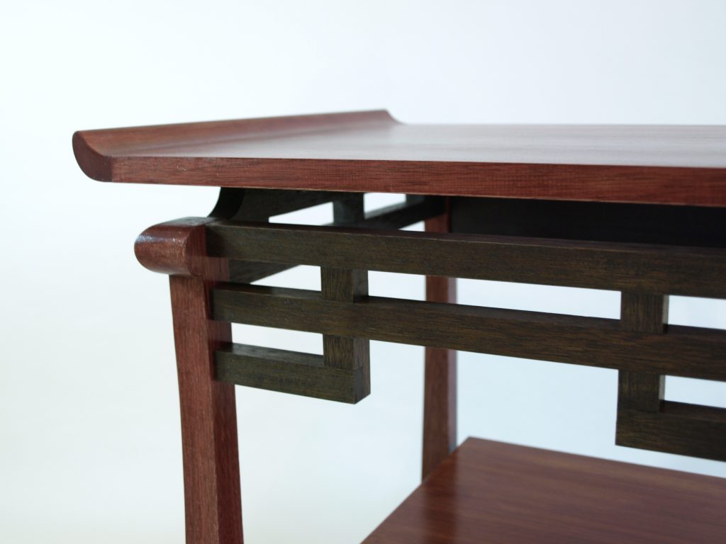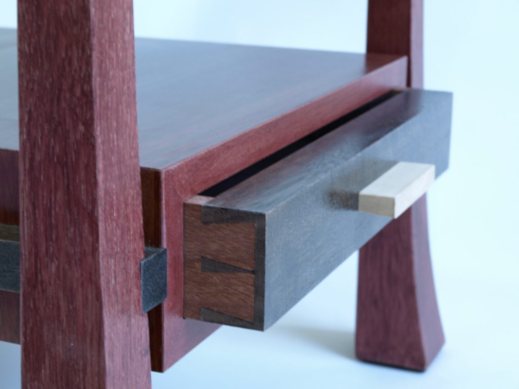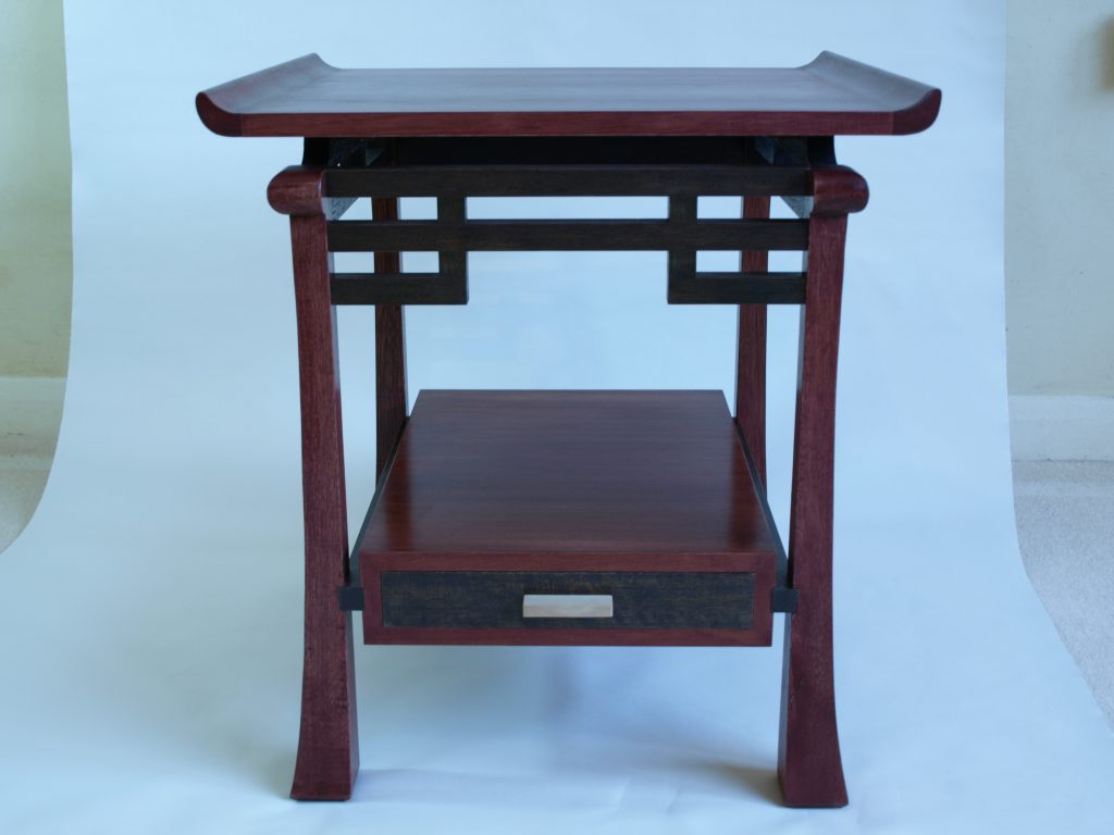 Nachttisch, im wesentlichen in Handarbeit aus Dark Red und Light Red Meranti gefertigt. Die meisten Verbindungen sind als Schlitz- und Zapfenverbindungen ausgeführt, teilweise Überblattungen und beim Schubladen Schwalbenschwanz-Zinken. Die konkave innere Profilierung der Randleisten des Oberteils wurde mit einem Simshobel, Hohlkehlhobel, einer konvexen Ziehklinge und Sandpapier mit einem passenden profiliertem Stück Holz ausgearbeitet; die Außenseiten wurden einem Handhobel und normaler Ziehklinge profiliert. Das Möbel wurde zuletzt gebeizt und lackiert.