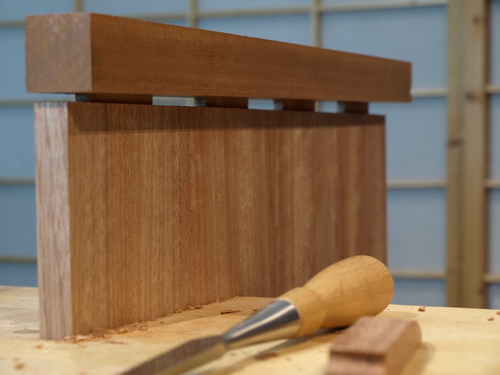 Die Schubladenkommode sollte einen Blechkontainer ersetzen und als Unterkonstruktion für einen Tisch dienen. Die Seitenteile aus keilgezinkter Buche wurden mit Rahmen verbunden. Ebenso wie bei den Laufleisten wurde eine Gratnutverbindung ausgeführt. Mit einer Azebiki und einer abgeschrägten Leiste als Führung wurde hinten beginnend auf volle Tiefe gesägt, so dass kein Sägemehl die Schnittfuge blockiert. Die Leisten wurden mit Dübeln gesichert, die Rahmen verdeckt verleimt. Die obere Kippleiste wurde als eine lose Schlitz- und Zapfenverbindung realisiert, um Schwinden und Quellen zu erlauben. Als Werkzeuge dienten eine Azebiki, verschiedene Sägen und Hobel, Grundhobel, Streichmaß, Winkel und vieles andere mehr. Die Oberfläche wurde mit Leinölfirnis behandelt.