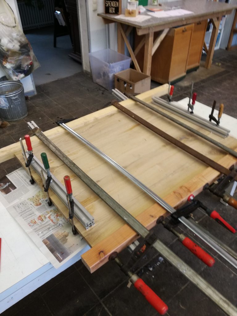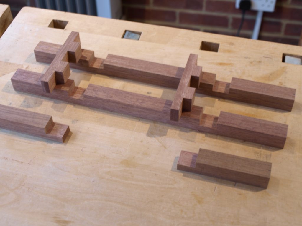 Alle die Teile der Schubläden wurden aus Nadelholz gefertigt und von Hand gehobelt und abgelängt. Die vorderen Ecken wurden als normale Schwalbenschwänze ausgeführt, bei den hinteren wurde der Bereich über dem Boden regelmäßig aufgeteilt- Die Böden liegen mit der Maserung quer in dreiseitigen Nuten und sorgen dauerhaft für Rechtwinkligkeit. Ihr hinteres Ende wird mit Schrauben in einem Langloch an der Rückwand gesichert. Die Blenden, abwechselnd Esche und Buche, stehen seitlich über und erhielten eine breite Fase zum angenehmeren Greifen. Als Werkzeug wurde ein Nuthobel, diverse Hobel und Sägen, Winkel, Streichmaß, Schonhammer und vieles andere mehr benutzt. Die Blenden aus Esche wurden mit Kernseife behandelt, die übrigen Blenden sowie die Böden mit Leinölfirnis, die restlichen Teile mit Mohnöl.