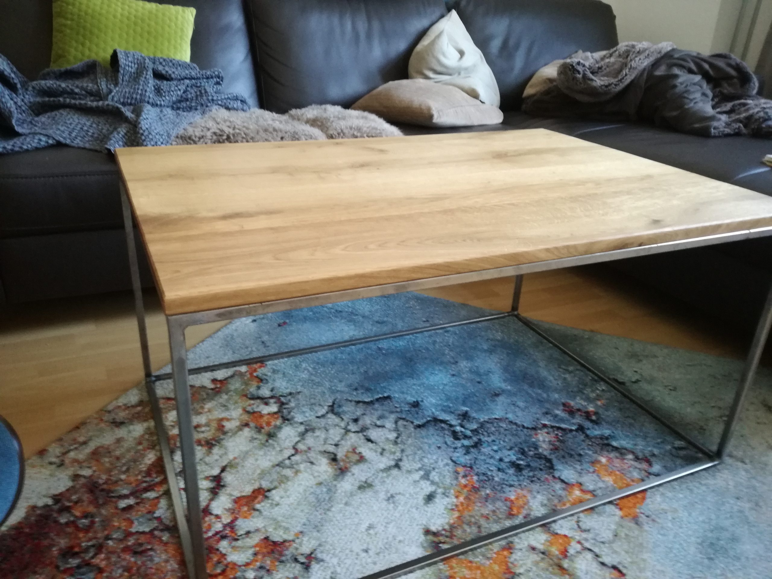 Dieser Couchtisch wurde aus Eiche und Vierkantstahlrohr hergestellt. Die Tischplatte besteht aus drei durch gehenden Lamellen und ist über Langlöcher mit dem Gestell verschraubt.