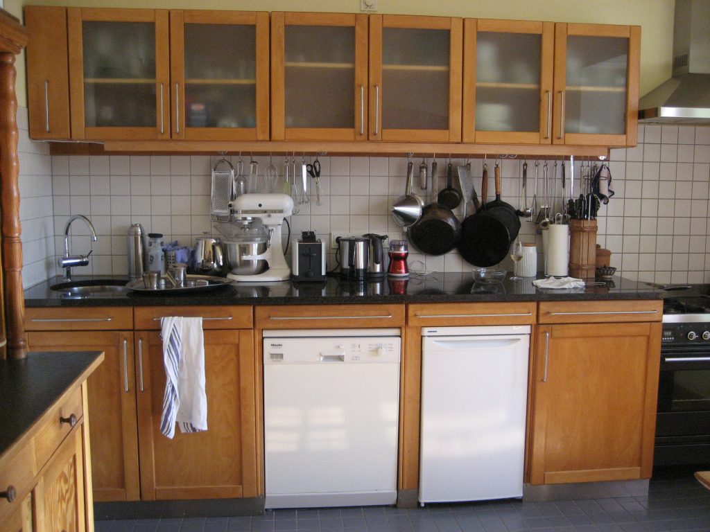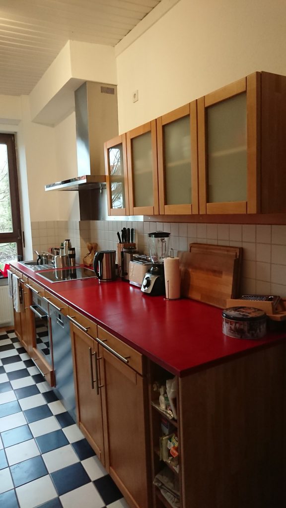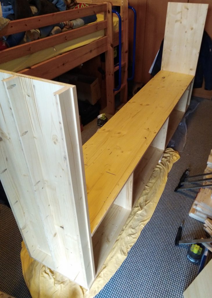 Der Garderobenschrank besteht aus 19mm starken Fichte-3-Schicht-Verbundplatten, an der Front mit 2mm-Ahorn bekantet und mit Treppenlack versiegelt. Der rechte, schmalere Teil ist fest verleimt, der Rest des Transportes wegen nur mit Lamellos zur Positionierung und Taschenlochbohrungen verschraubt. Zuschnitt und Bekantung konnte ich in einer Schreinerei erledigen. Der ganze Schrank ist im System 32 geplant worden.