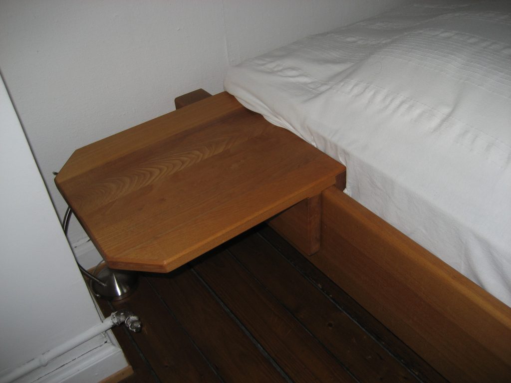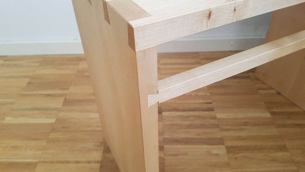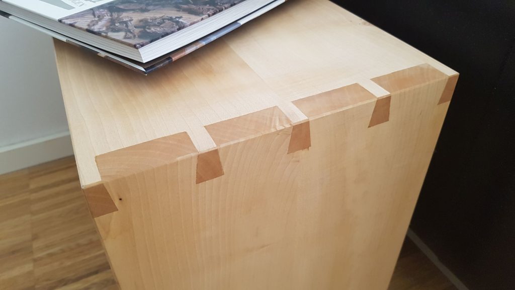 Der Beistellhocker aus massivem Ahorn dient zum Ablegen von Büchern oder Zeitschriften neben der Couch. Die Schwalbenschwanzverbindungen wurden großzügig ausgelegt. An der Rückseite wurde eine Leiste befestigt, um z.B. die Kabel eines kleinen Lautsprechers daran zu befestigen. Als Werkzeuge wurden unter anderem ein Veritas Streichmaß, Dictum Handhobel, Stemmeisen sowie eine Rückensäge aus dem Sägenbau-Kurs mit Peter Lanz verwendet. Die Oberfläche wurde mit Mohnöl behandelt.