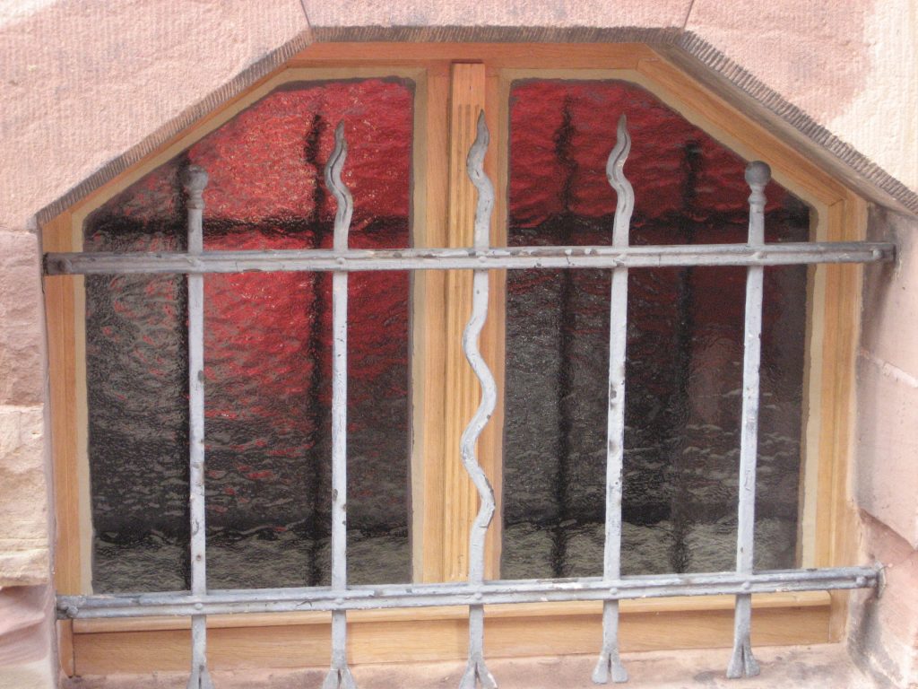 Sechseckig, 1000×800 mm, aus Hunsrück-Eiche in altem Stil mit Wasserschenkel, Glasfüllung Kathedral, angepaßt an die Sandsteinlaibung, mit profilierter Mittelleiste; Oberfläche lackiert