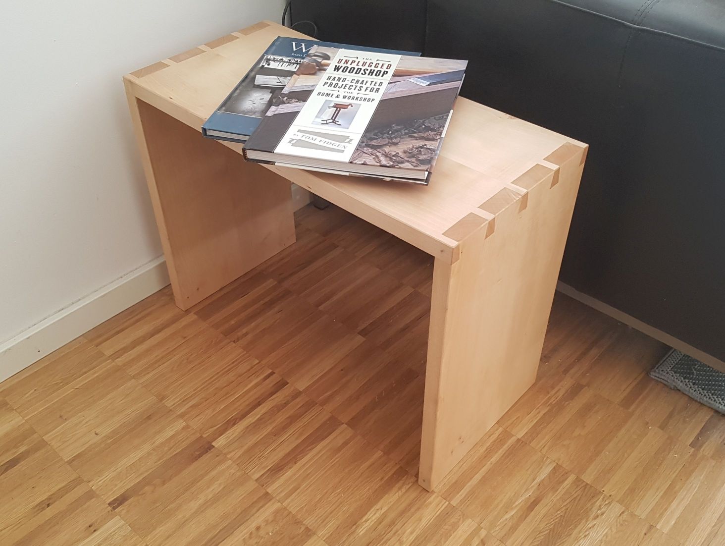 Der Beistellhocker aus massivem Ahorn dient zum Ablegen von Büchern oder Zeitschriften neben der Couch. Die Schwalbenschwanzverbindungen wurden großzügig ausgelegt. An der Rückseite wurde eine Leiste befestigt, um z.B. die Kabel eines kleinen Lautsprechers daran zu befestigen. Als Werkzeuge wurden unter anderem ein Veritas Streichmaß, Dictum Handhobel, Stemmeisen sowie eine Rückensäge aus dem Sägenbau-Kurs mit Peter Lanz verwendet. Die Oberfläche wurde mit Mohnöl behandelt.