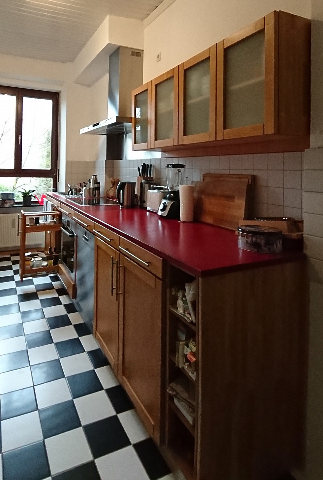 Der Garderobenschrank besteht aus 19mm starken Fichte-3-Schicht-Verbundplatten, an der Front mit 2mm-Ahorn bekantet und mit Treppenlack versiegelt. Der rechte, schmalere Teil ist fest verleimt, der Rest des Transportes wegen nur mit Lamellos zur Positionierung und Taschenlochbohrungen verschraubt. Zuschnitt und Bekantung konnte ich in einer Schreinerei erledigen. Der ganze Schrank ist im System 32 geplant worden.