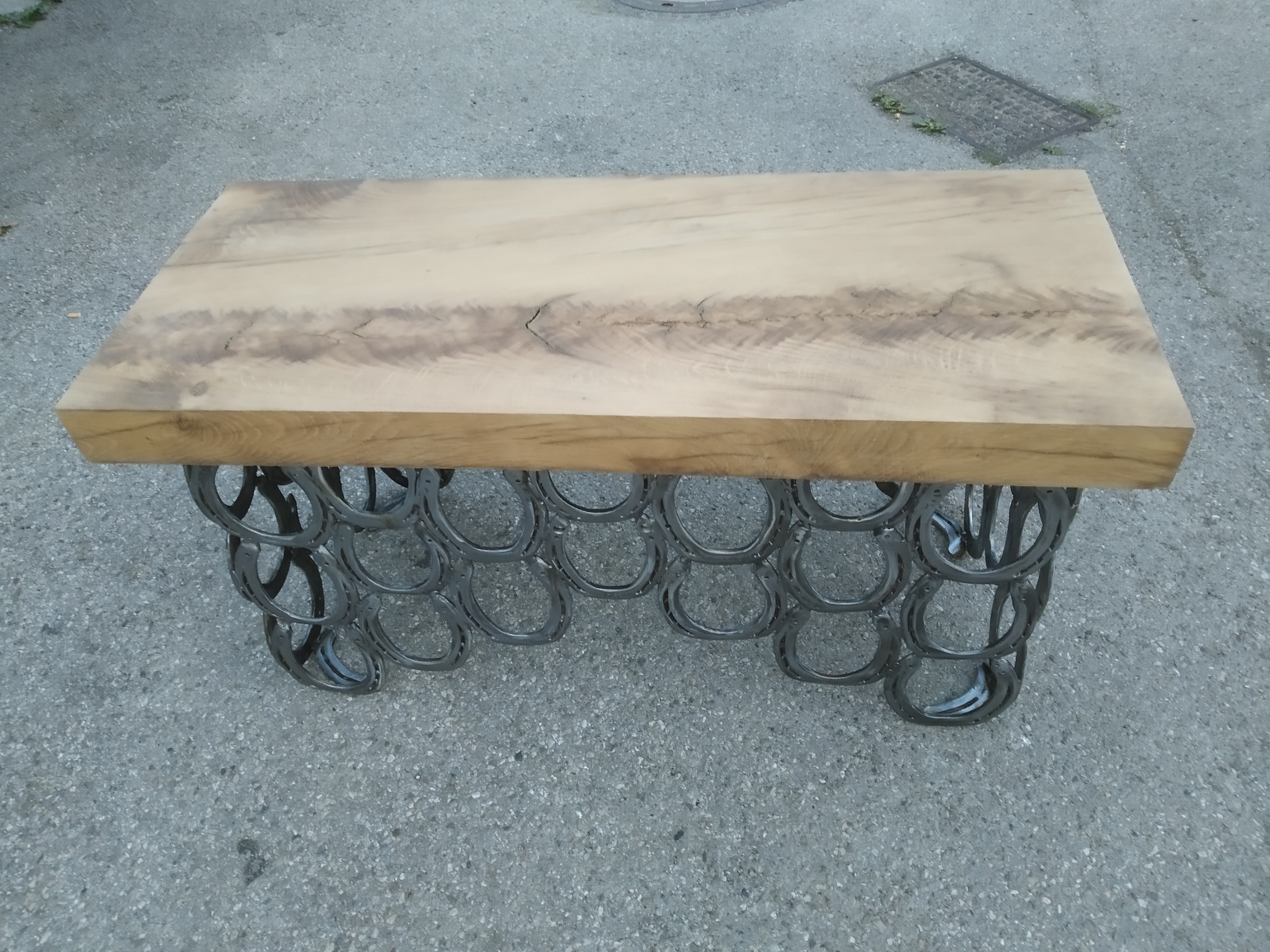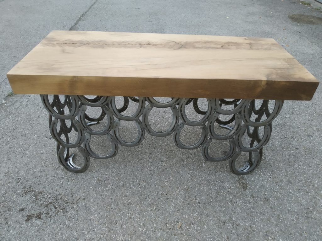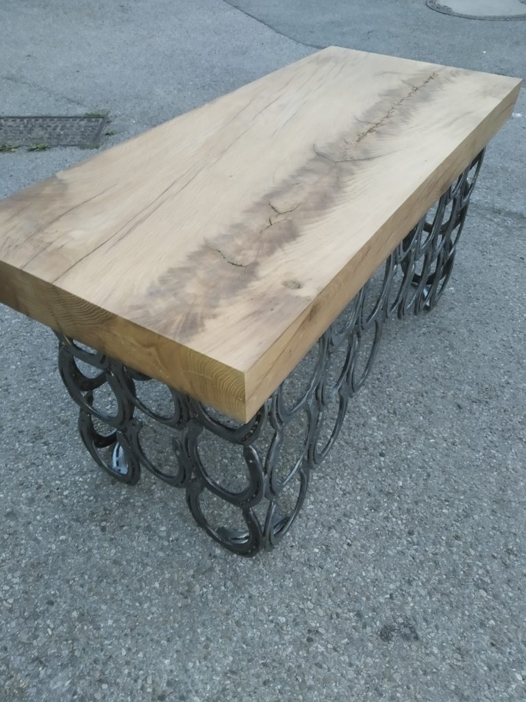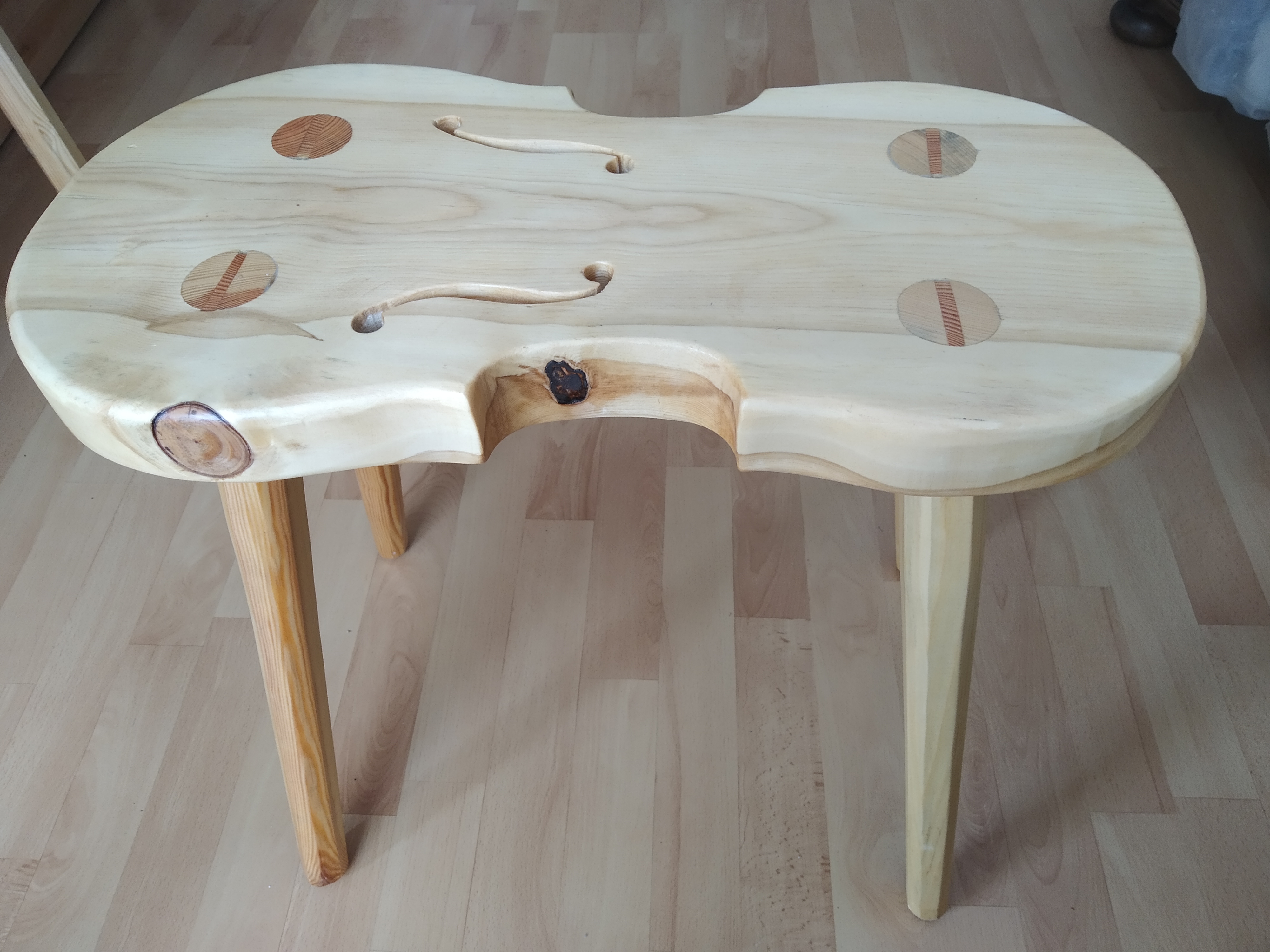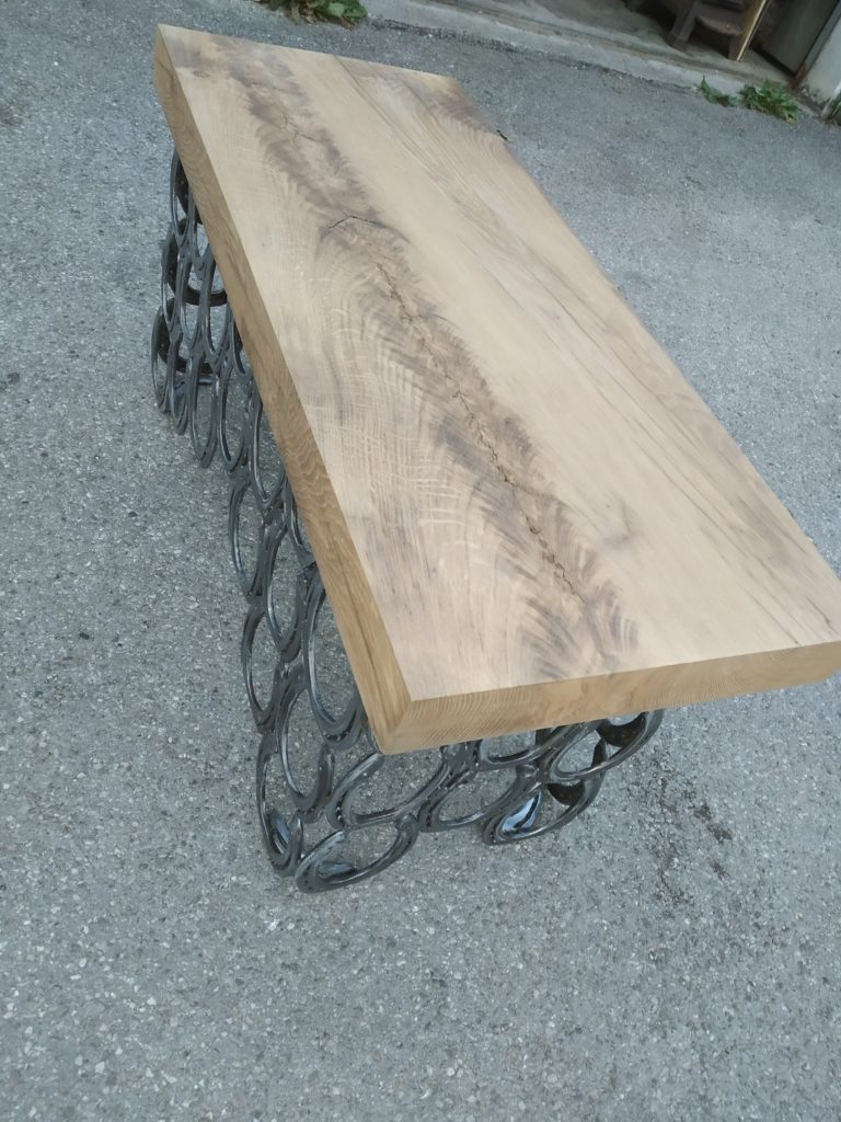 Die Holzverbindungen sind traditionell hergestellt, also Schlitz und Zapfen oder schwalbenschwanzförmige Kämmung/Überblattung (regional auch „Einzinker“). Damit der Diener nicht die „Grätsche“ macht, werden seine Beine durch ein flaches Gurtband auf einen maximalen Abstand gehalten. Wie ich höre, leistet er geduldig seinen Dienst. Neben den üblichen Maschinen wurde für die Herstellung Lochbeitel und ein Grundhobel verwendet.