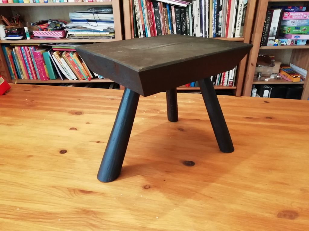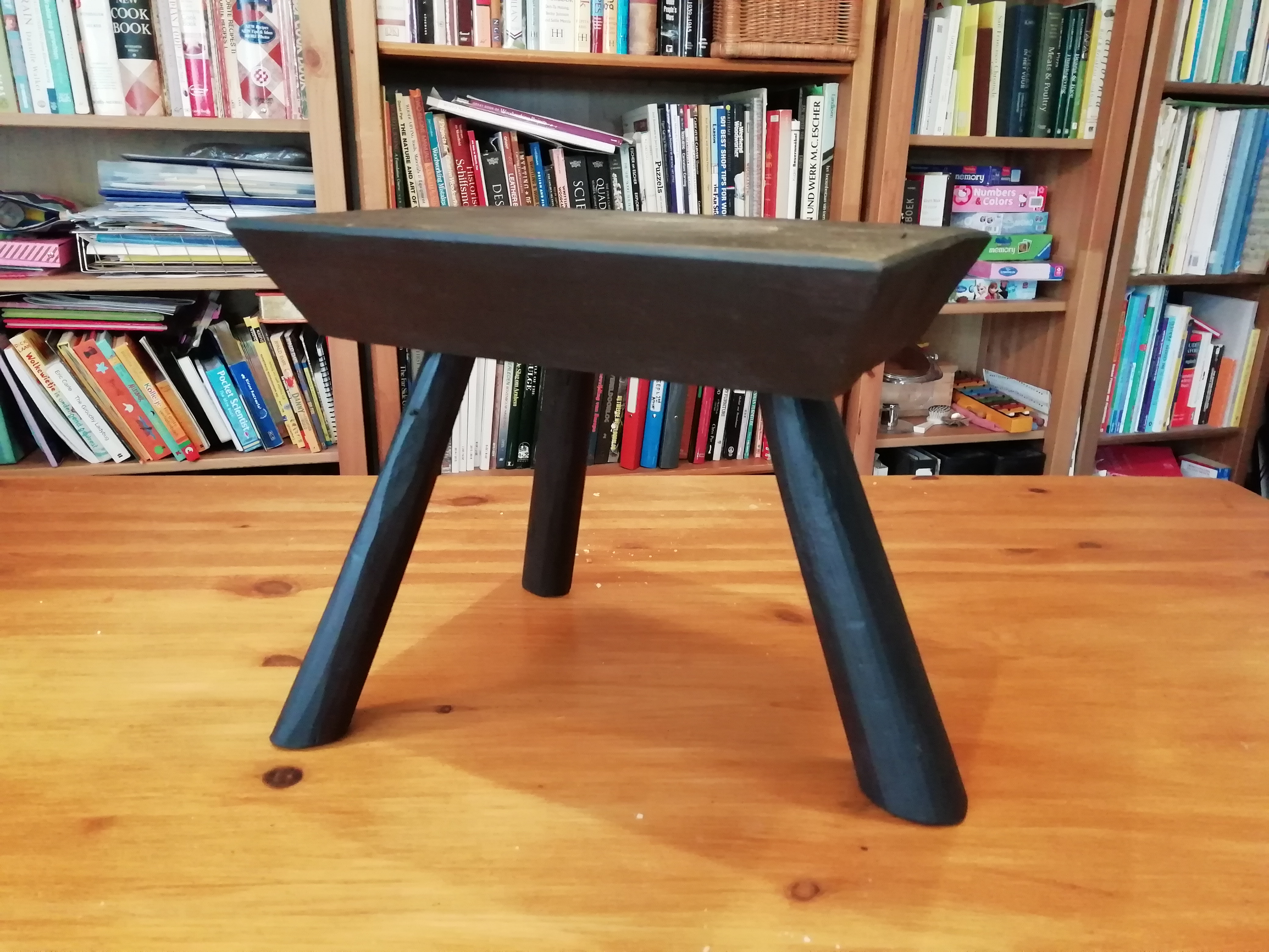 Kleiner Hocker nach traditionellem Vorbild aus Schottland. Der Hocker wurde aus einem halben Stamm Pappelholz geschlagen, flach gehobelt und die Beine konisch eingezapft. Der hocker wurde schwarz über rot bemalt und mit Wachs versiegelt.