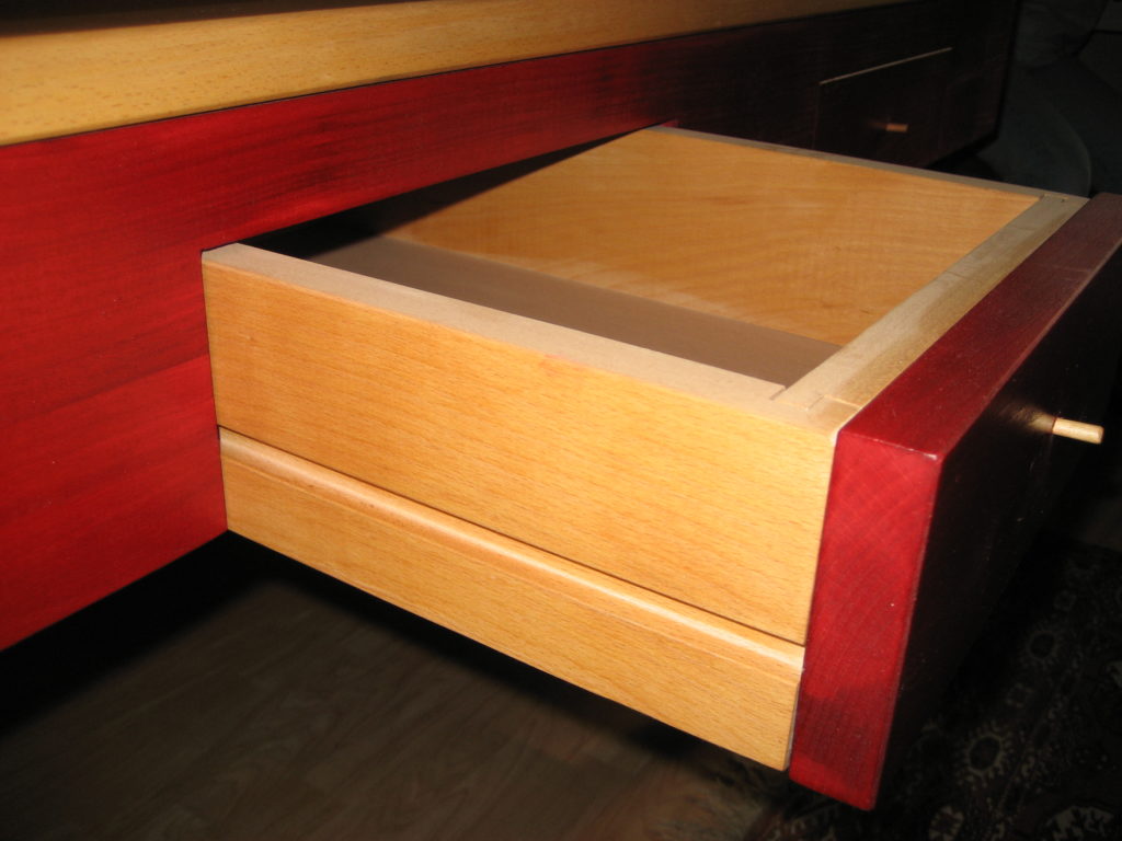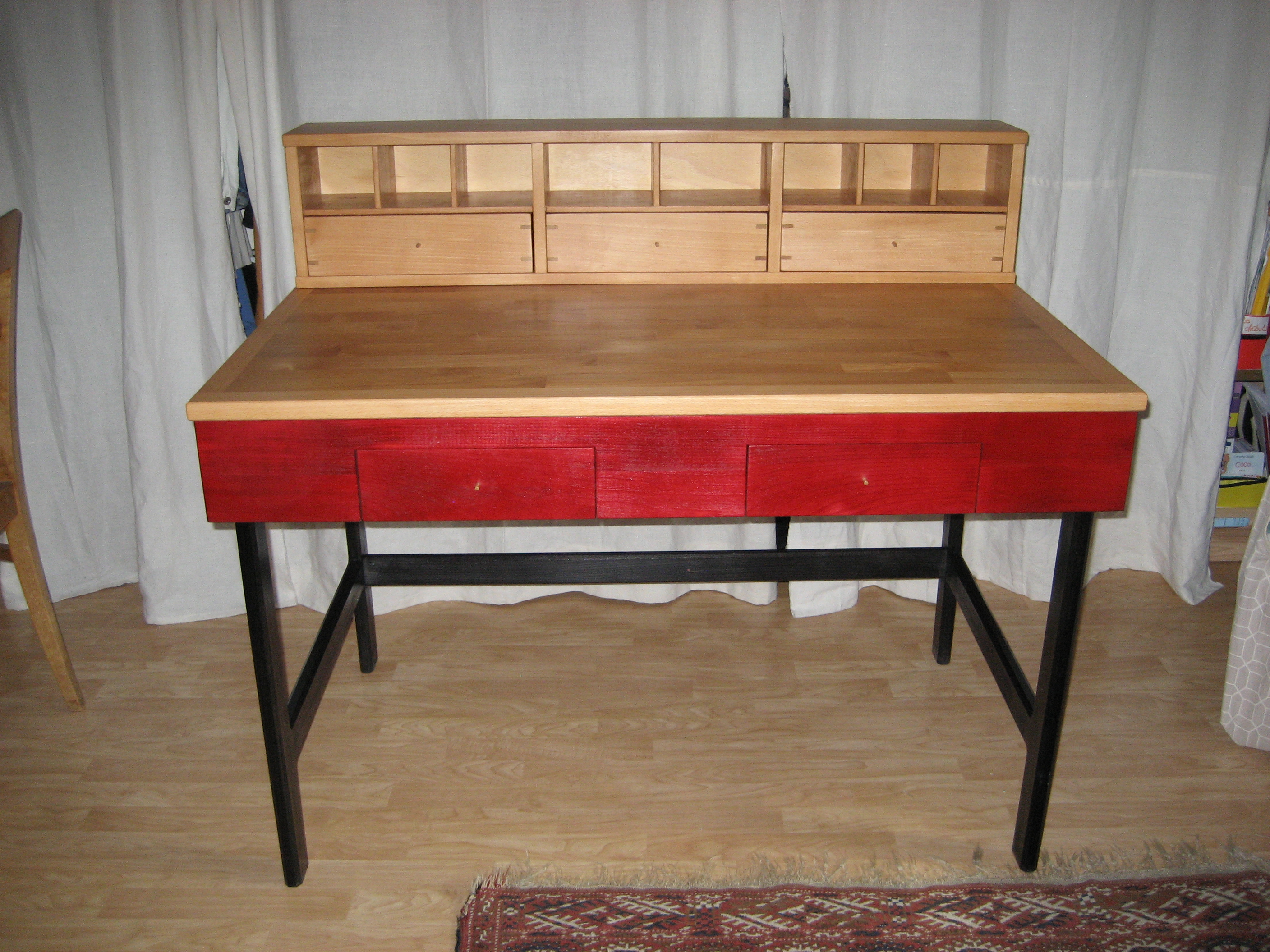 Rohstoffe: Fußgestell, Zarge und Aufsatz aus massiver Buche, Platte aus schichtverleimter Erle mit massiven Buchenanleimern. Rückseite Aufsatz und Schubladenböden aus Buche Sperrholz 5 bzw. 7 mm. Fußgestell mit schwarzer Metallbeize, Zarge mit roter Metallbeize gefärbt.