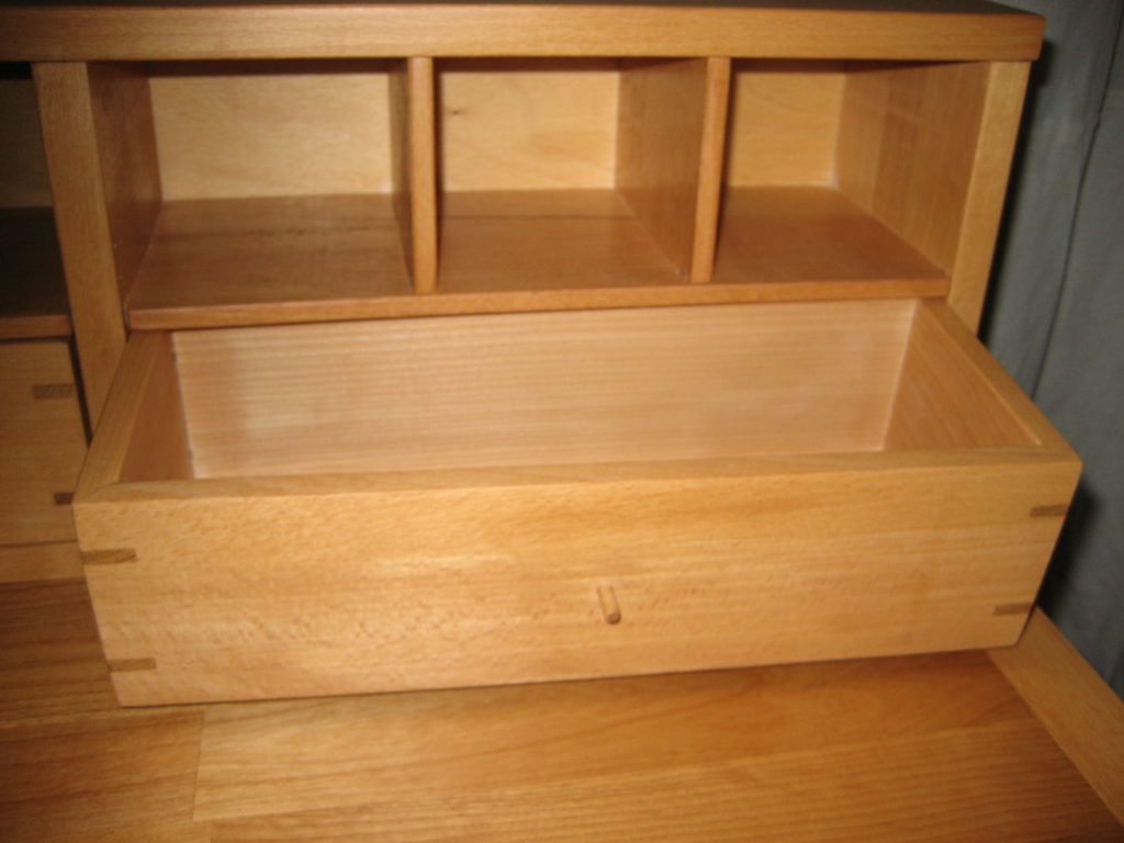 Fußgestell, Tischzarge und Schubladenführungen des Tisches sind verdübelt, die äußeren Teile des Aufsatzes wurden mit Lamellos verleimt, die Zwischenteiler eingefräst verleimt. Die Tischplatte ist mit Nutzklötzen an Tischzarge bzw. Fußgestell fixiert, der Tisch enthält zwei Schubladen mit Holzführungen, der Aufsatz ist untergliedert in 3 Schubladen unten und 8 Fächer oben. Alle Teile geölt, gewachst und poliert, handwerklich erzeugtes Unikat in Anlehnung an eine italienische Designergruppe um Ettore Sottsass