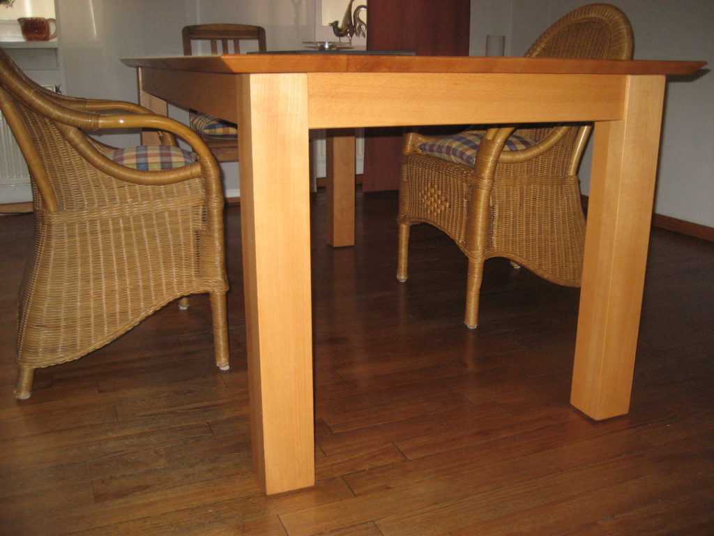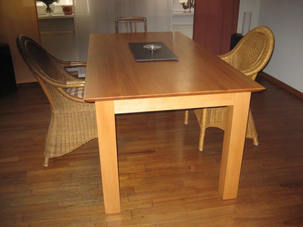 Großer Eßtisch mit klassischer Formgebung, Maße 1800x900x770mm; aus einem Stamm Hunsrück-Buche gefertigt; Tischplatte 30mm selbst sortiert und verleimt, Platte ist allein mit Nutklötzen an der Zarge befestigt; Zarge geölt und gewachst, Platte mehrfach mit Imprägnier- und Hartöl behandelt