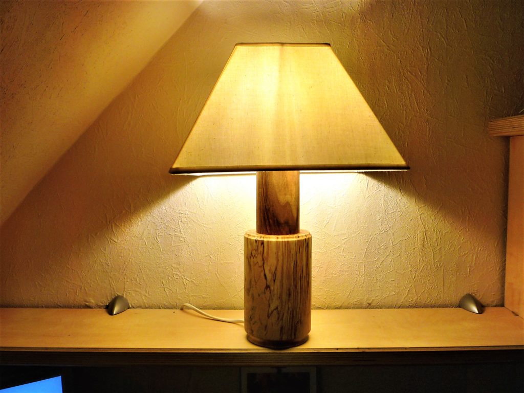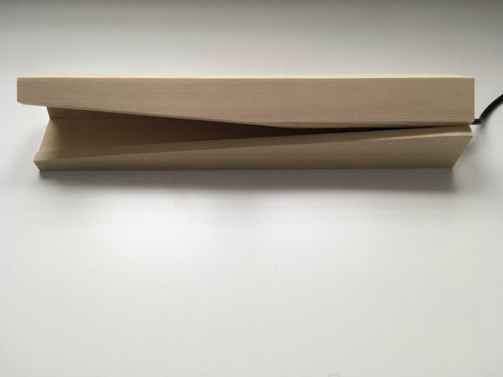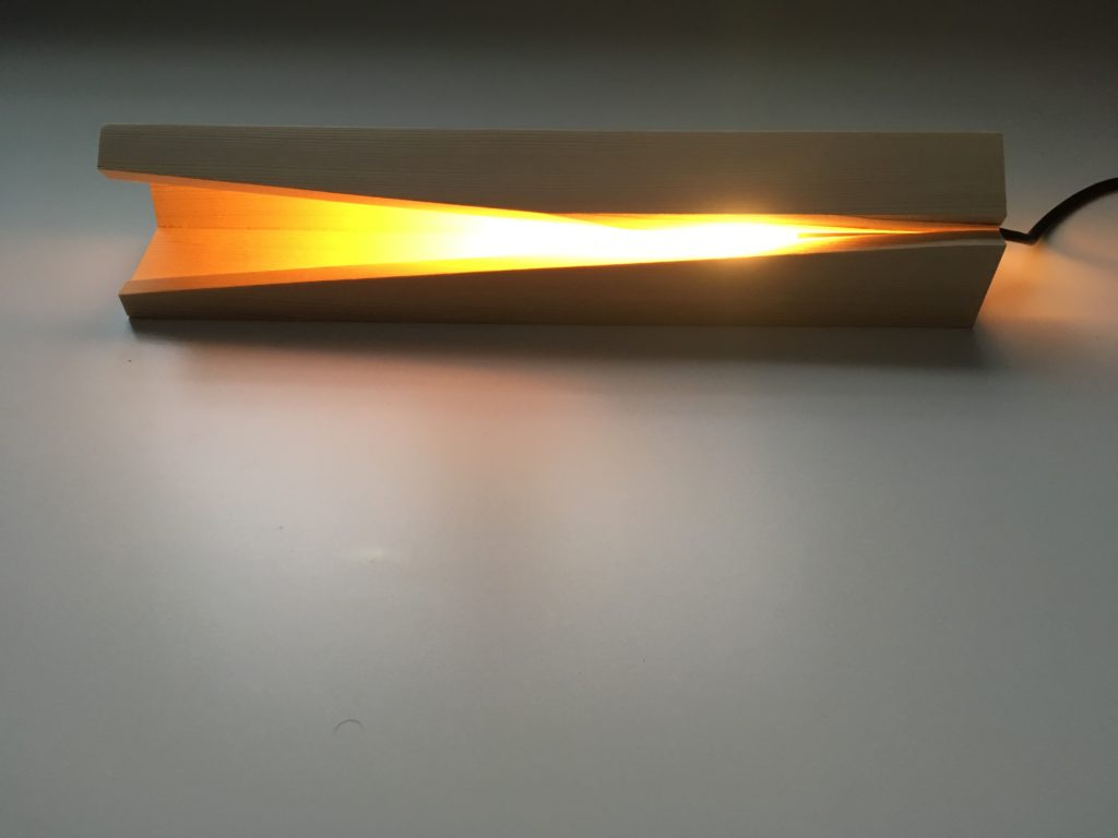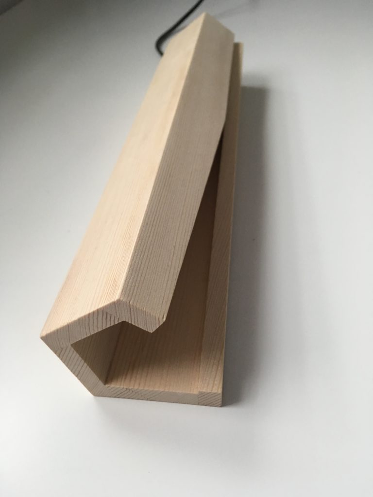 Dekorative Lampe aus Holz. Die Holzleisten wurden auf Gehrung zugesägt, verleimt und anschließend geschliffen. Die Beleuchtung geschieht über eine Lampensockel (e14) und eine LED-Birne, damit die Wärmeentwicklung im Holz gering gehalten wird.