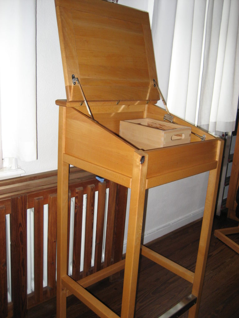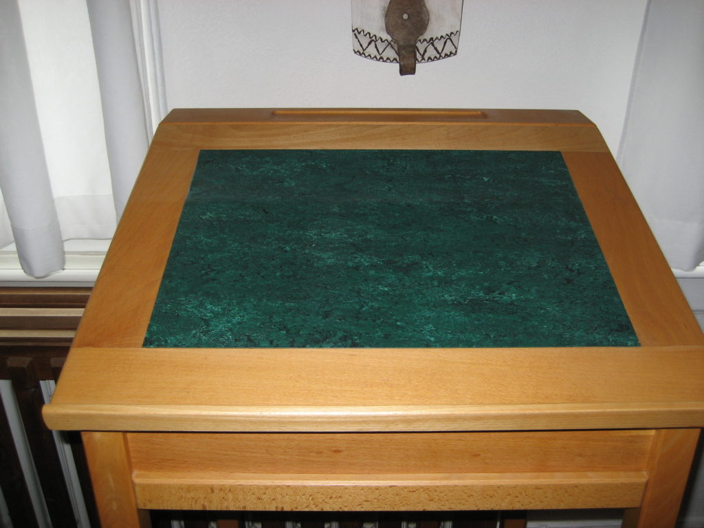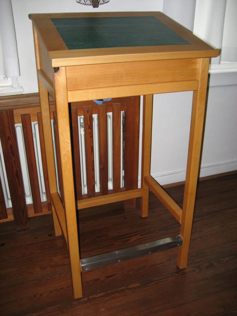 Gefertigt aus massiver Hunsrück-Buche, Maße 1190/1070x600x550 mm (HxBxT); Platteneinlage grünes Naturlinoleum; die vordere Auflage der Stehpulthöhe und Neigungswinkel der Lesefläche sind individuell angepaßt; geölt und gewachst