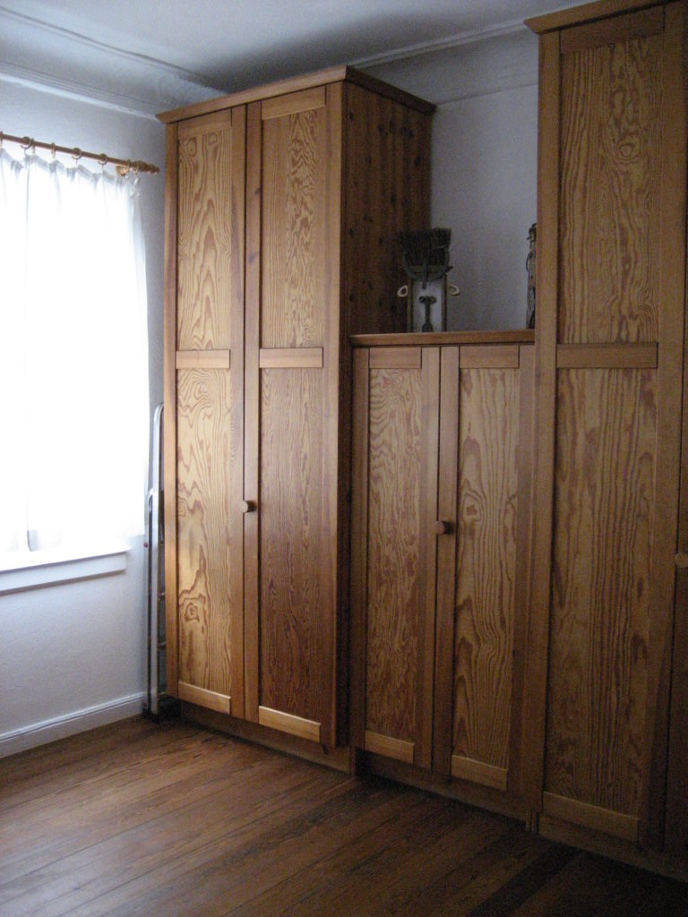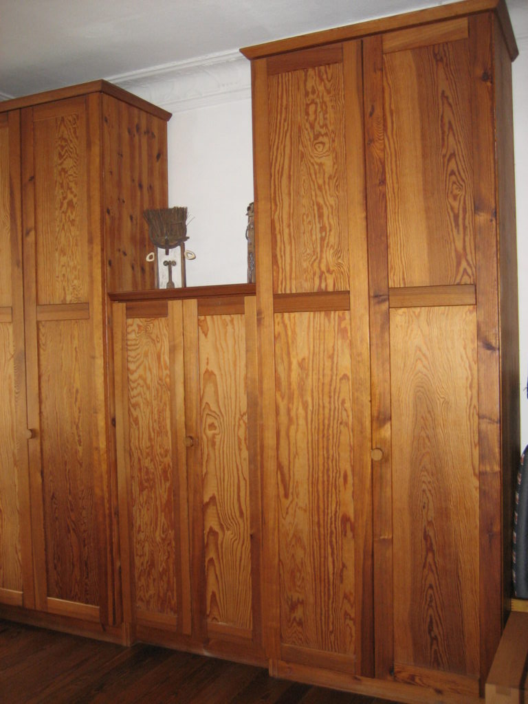 Maße 2750/1750x2750x630 mm (HxBxT); Corpi und Einlegeböden aus Kiefer Dreischichtplatten, Rückwand und Frontfüllungen aus Kiefer Sperrholz 10mm, Türrahmen und Simse aus massiver Kiefer; geölt und gewachst